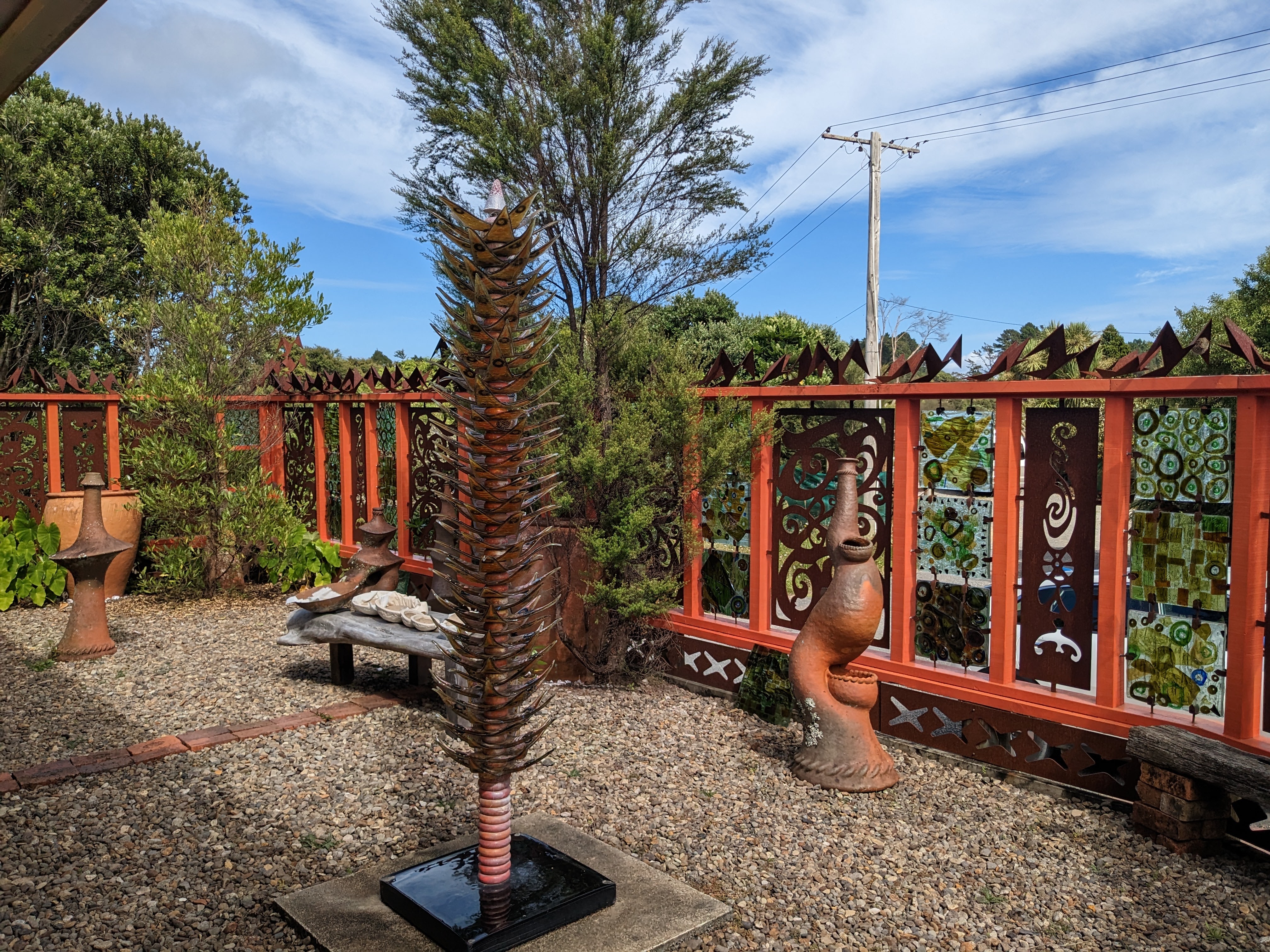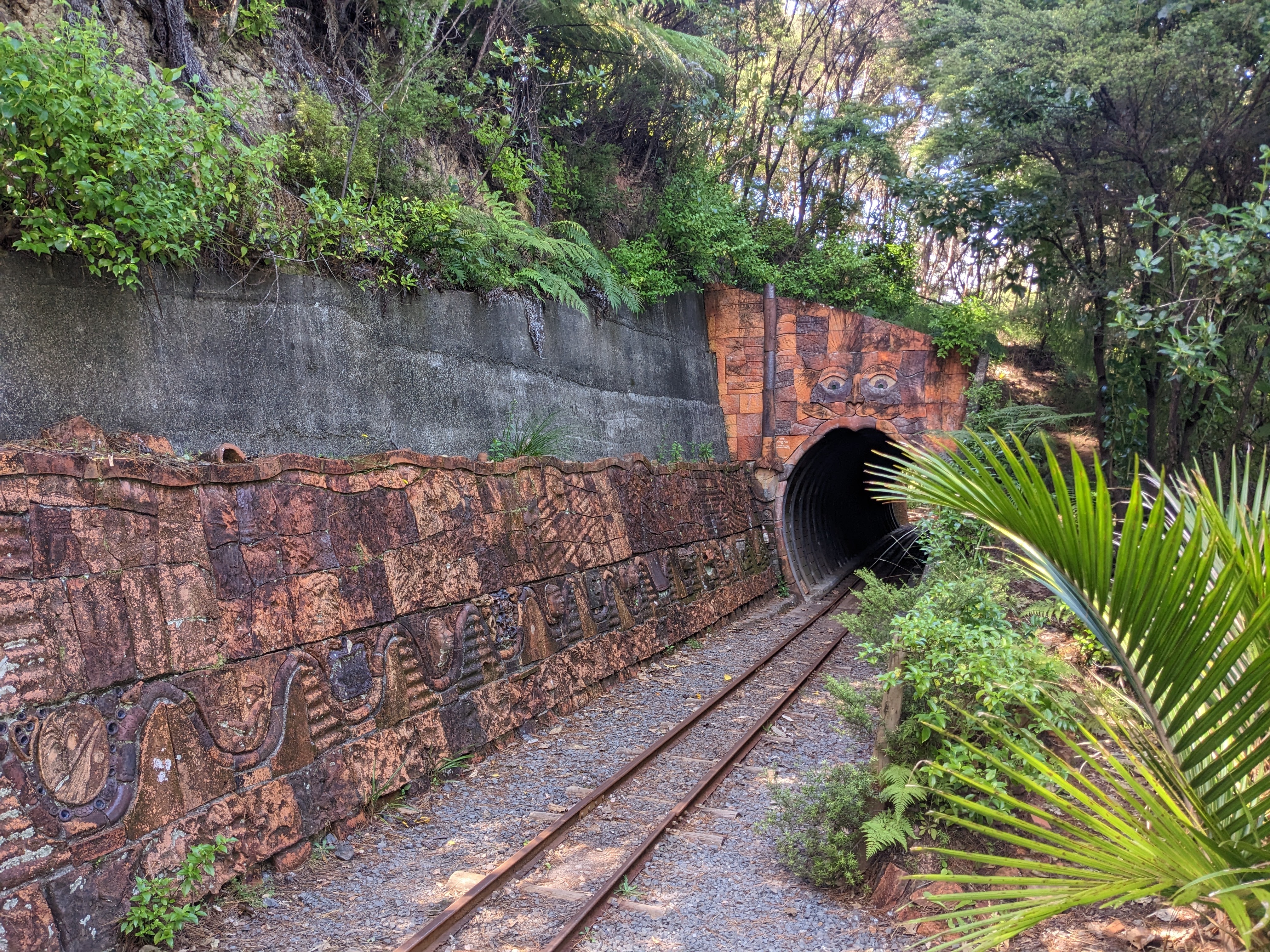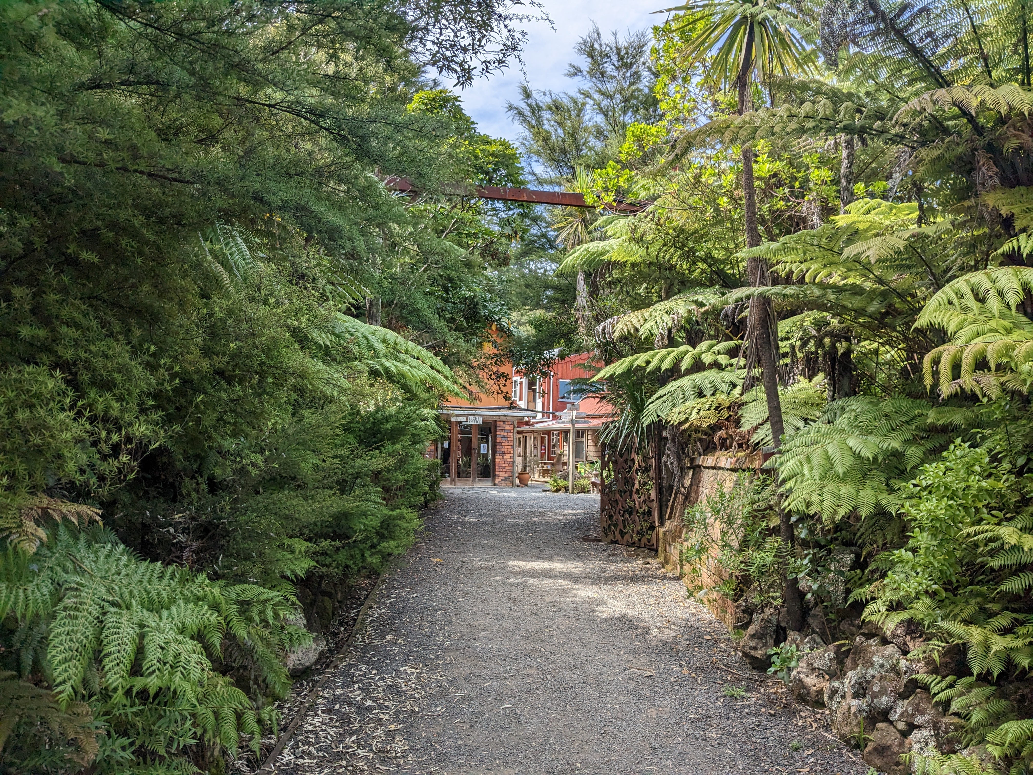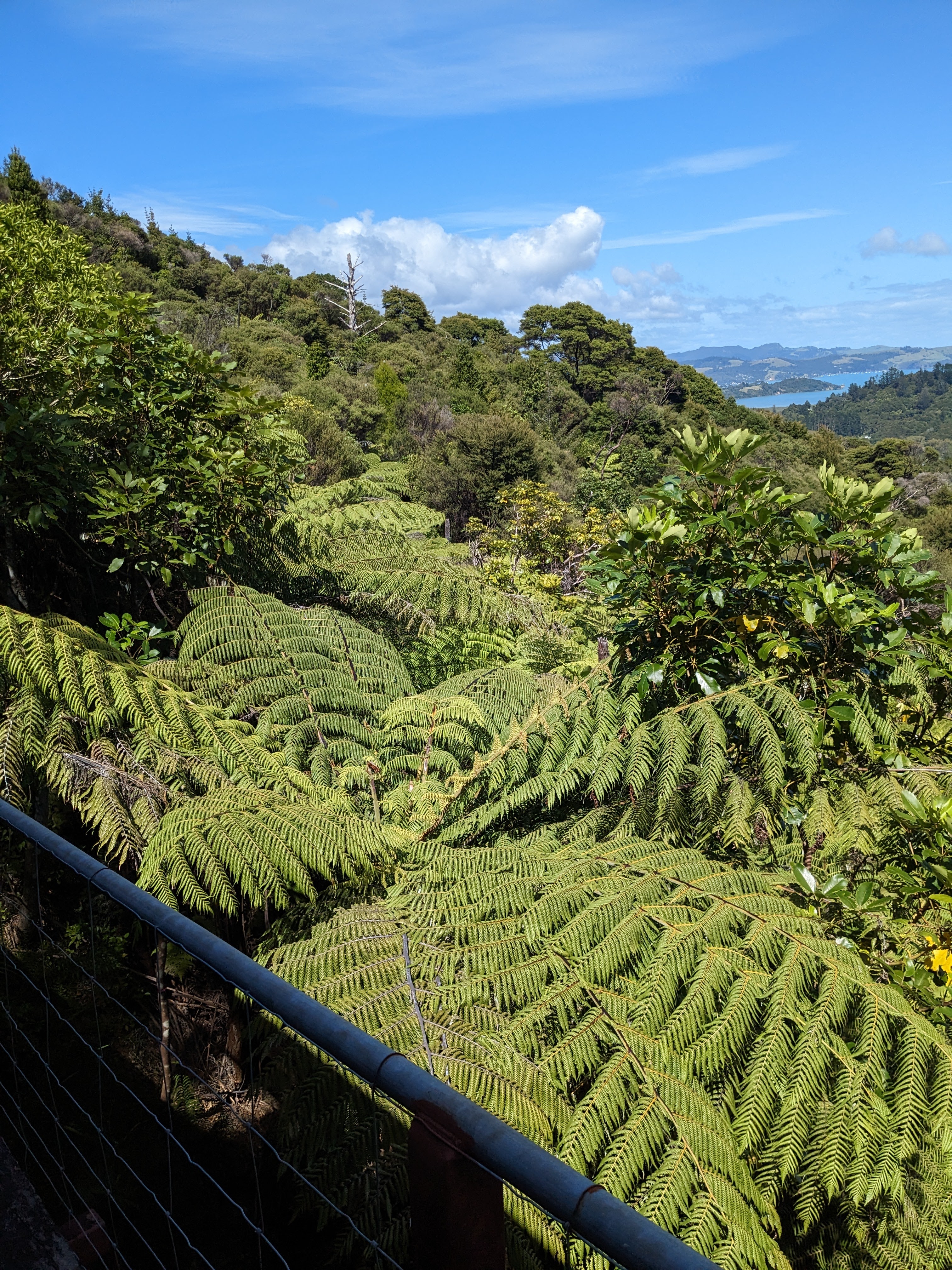 After a slow morning, my grandmother and I headed to the Coromandel bakehouse for our breakfast. I tried my first ever (English/nz style) sausage roll and a chicken cordon bleu, and grandma had an apple turnover and coffee. Everything was delicious and quite affordable. We then decided to act on a recommendation received the previous night and visit the Driving Creek Railroad, a local attraction just outside of town. When we arrived at the railroad, we were pleased to see that it was not just a short rail tour, but a nice little art gallery, a small nature preserve with birds and geckos, and a short walk over to an old gold mine. With some time to spend before the next train departure, my grandmother and I looked at the gallery, and I took a quick look at the nature preserve. Not many birds to be seen, though I caught a brief sighting of a wood pigeon and heard many more. Luckily, for me at least, the geckos were being kept in enclosures, and I managed to get a good look at three different varieties. After that, we hopped on the train for about 1 hour 15 minutes. As the old train worked its way up a steep hill covered in ferns and other local flora, we learned that the land had originally been used for logging, then a large pottery factory (the train was built to move coal for the kiln originally), then finally preserved with some pottery still being made there to this day. As the train arrived at the top, we rose above the trees revealing beautiful views of the surrounding peninsula and the Firth of Thames. The train then took us back down to the start where we took another stroll around the nature preserve and set off for a fairly uneventful, though gorgeous, drive back to Auckland to return our rental car.