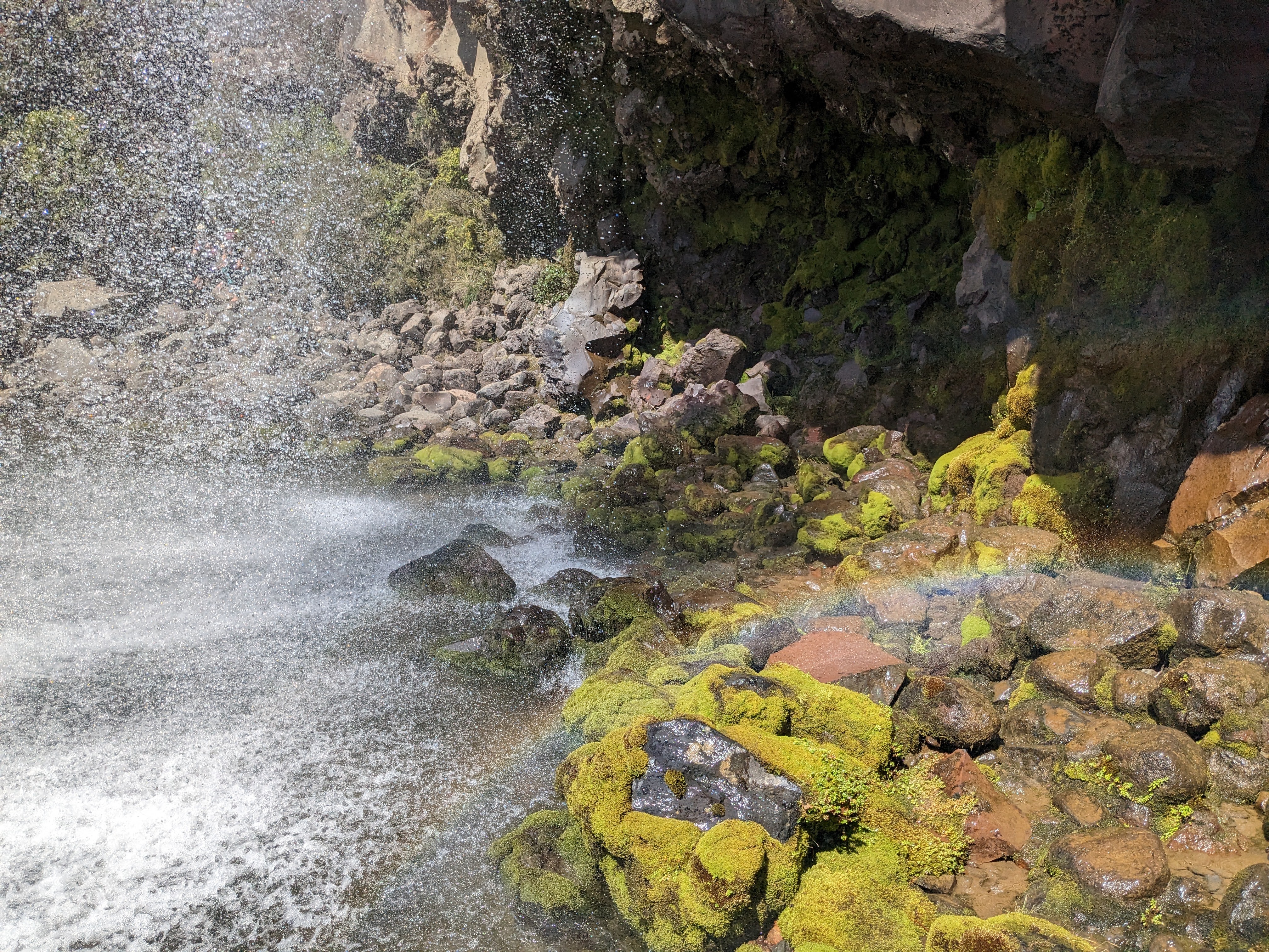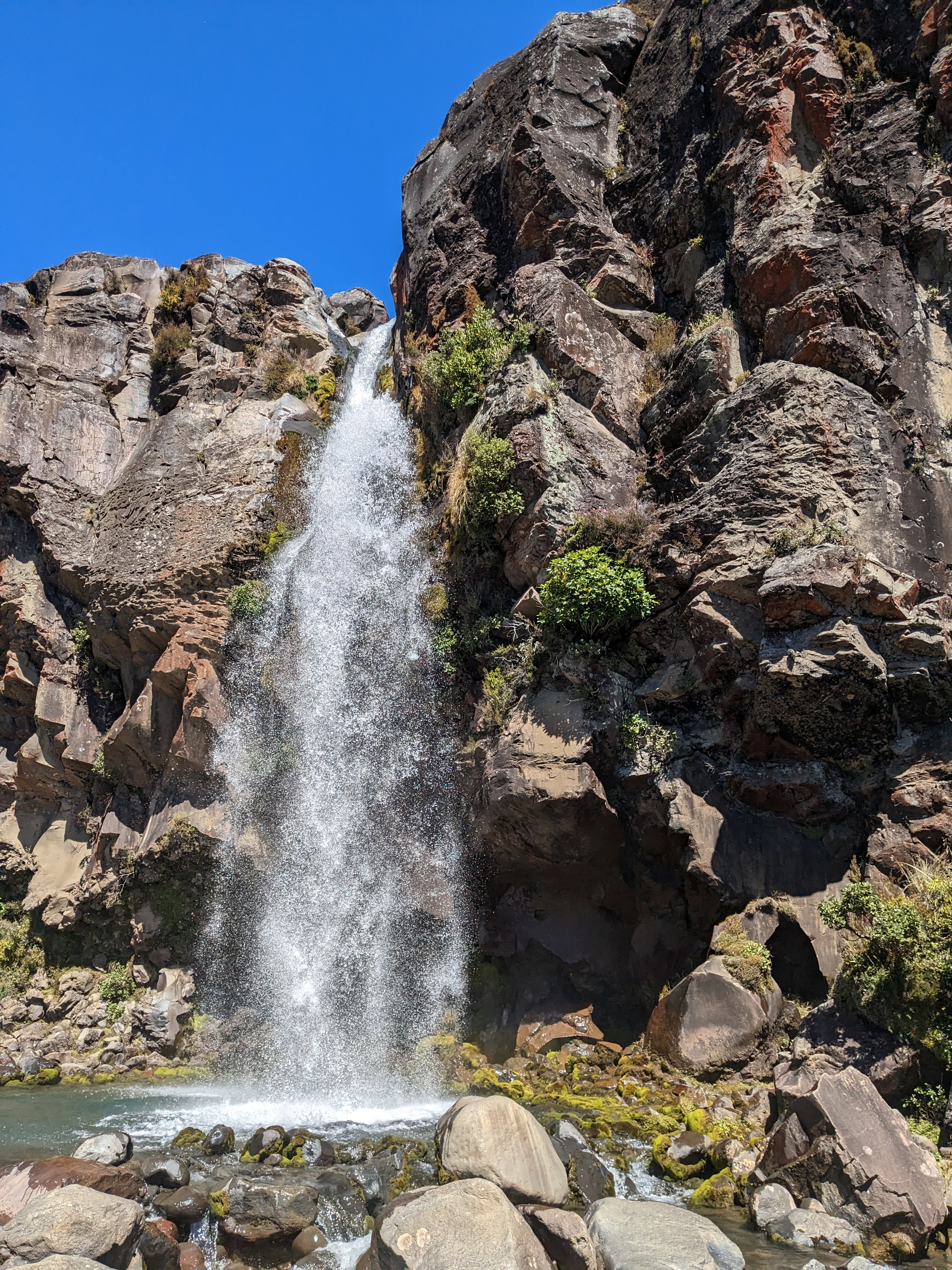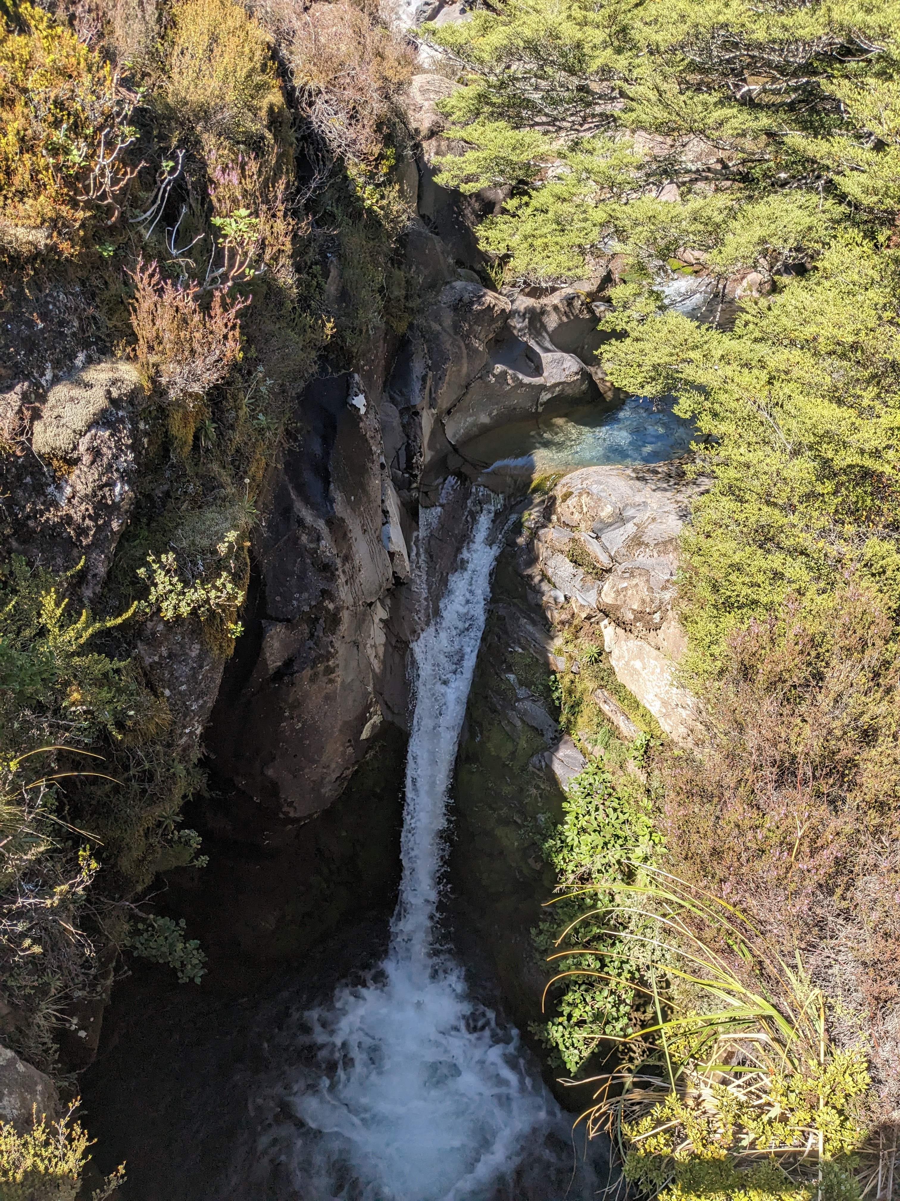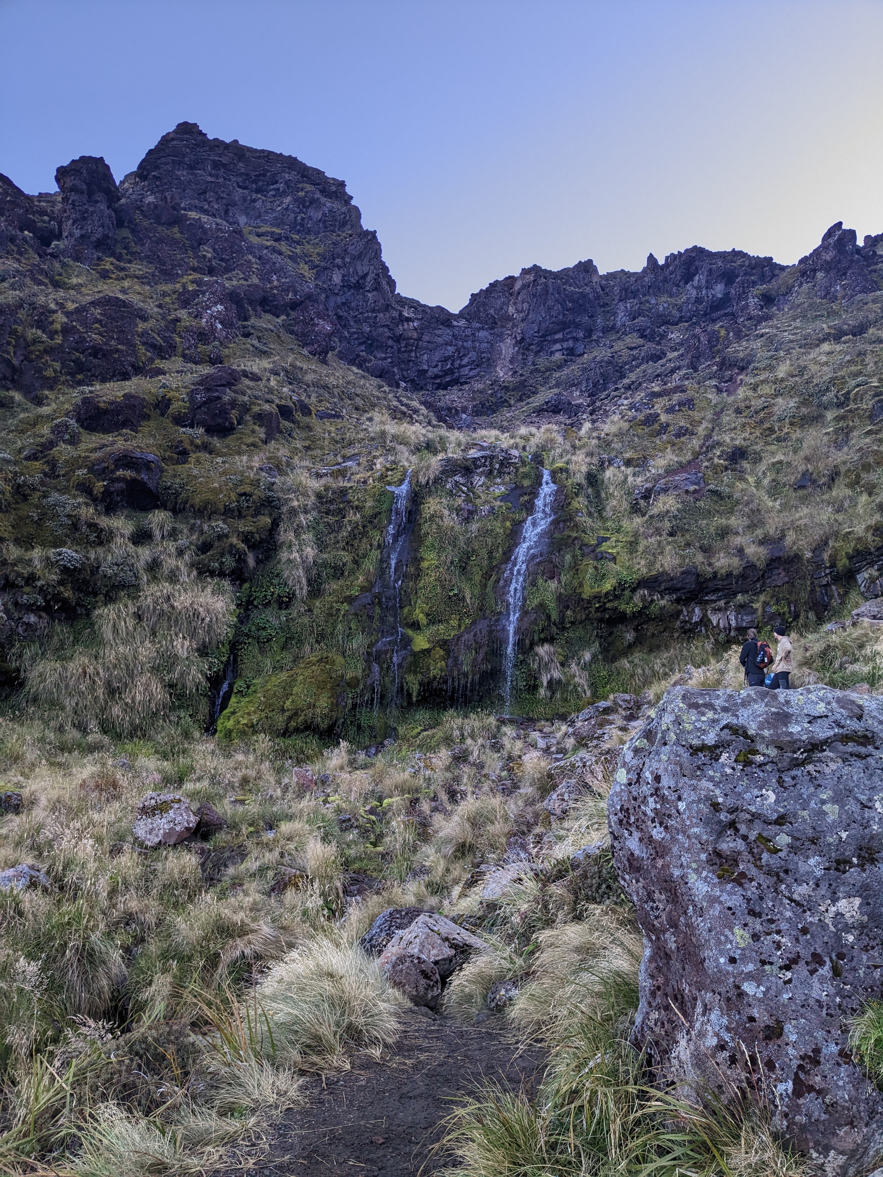 The next day, I awoke a little after 8 with rejuvenated feet, but a sore back and hips. After a slow start and an easy brunch of leftover hiking food, I wandered with my grandma over to the visitor center. With some nice exhibits on the local ecology, culture, and of course volcanoes, the center was a nice place to spend an hour. After some time there, feeling a little more energetic, I decided to take another, shorter, hike to the nearby Taranaki Falls. I moved through this hike quickly, taking time to enjoy the beautiful views as the trail slipped smoothly between the tundra-like plains of low vegetation and the beautiful fern covered forests alongside the river valleys. Once I hit my stride, the soreness stopped bothering me and I was able to sit back and appreciate the waterfall, soak a bandanna in the waters, and enjoy my hike back. When I made it back to the cabin, I took more time to rest and write, did laundry and got dinner with my grandma. Finally, we took a short hike together up to a ridge in order to enjoy the sunset, and returned to the cabin in the dark. Now I am getting ready for what will hopefully be another restful night here in Tongariro National Park before our shuttle back to the train, and subsequent ride to Wellington tomorrow.