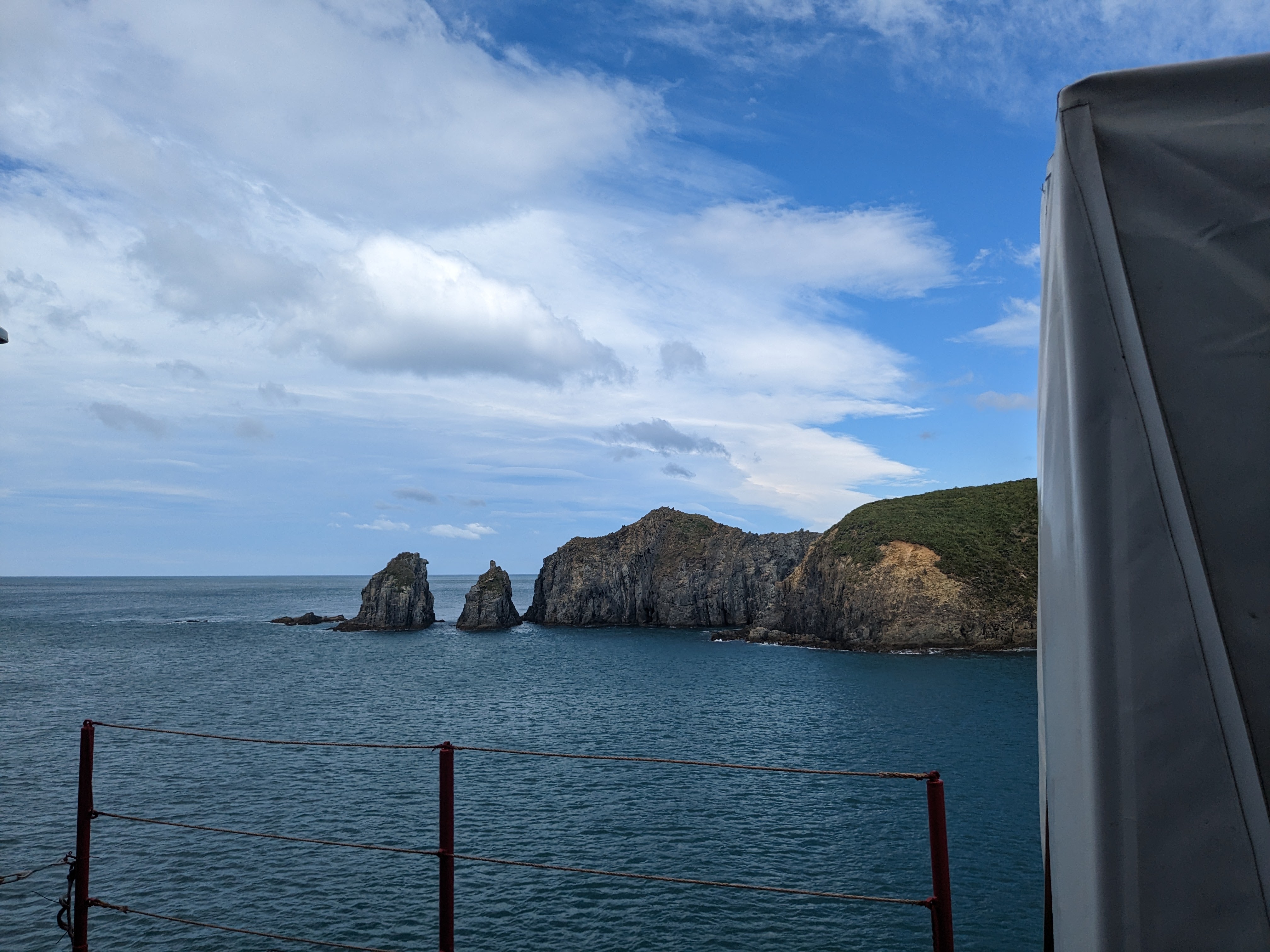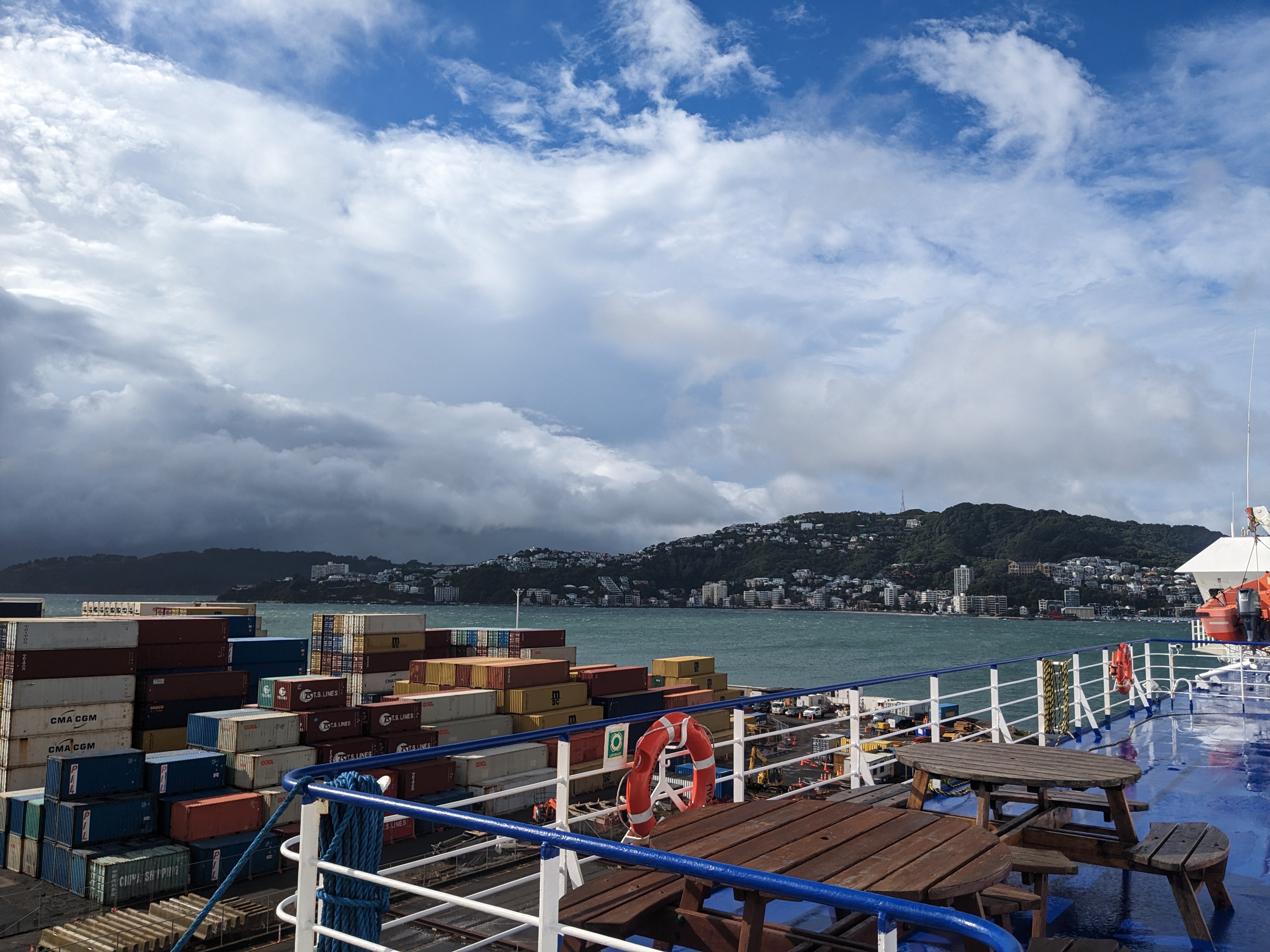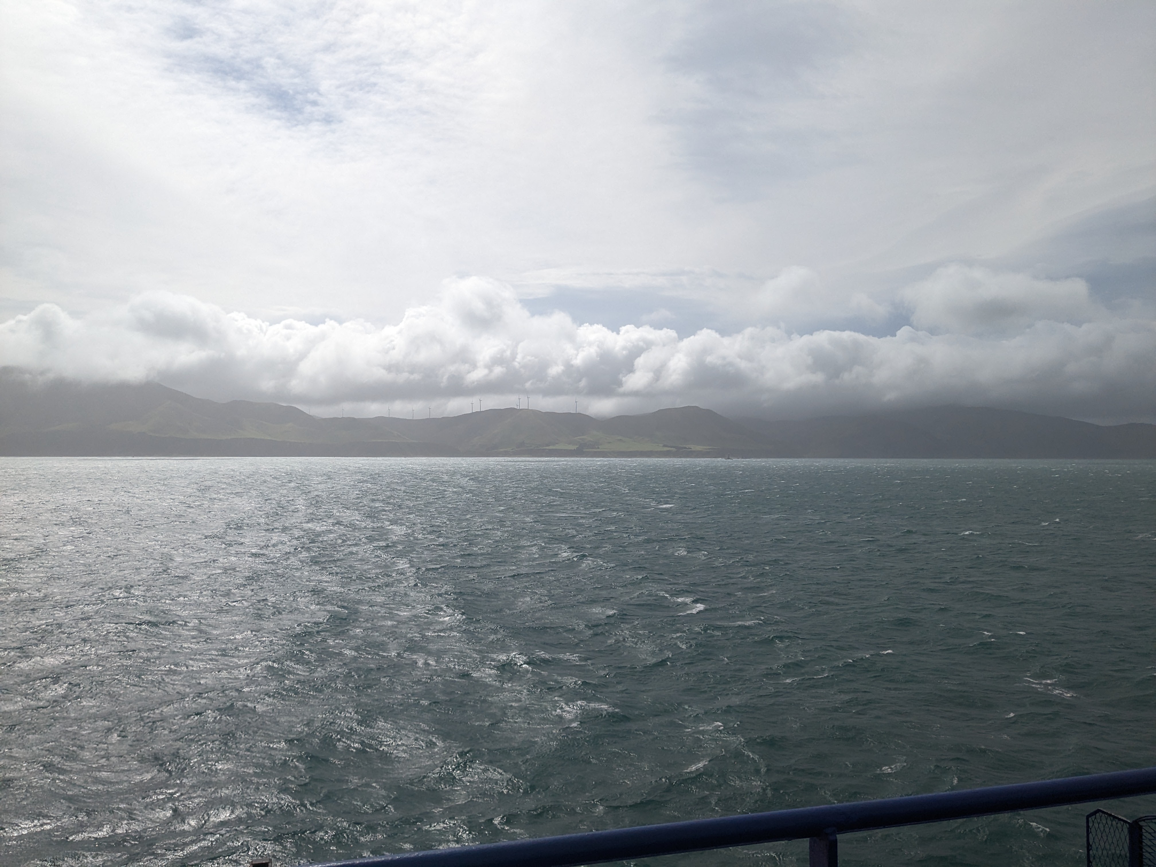 The next morning, we awoke early for a ferry across the Cook Strait, only to discover that it had been delayed. This was slightly worrying as we had train tickets from Picton to Christchurch that afternoon, but with the updated departure time of 8:45 am and train tickets scheduled for 1:40 pm, the supposed 3.5 hour trip didn’t seem to be cutting things too close. Our arrival at the ferry terminal was uneventful, but much to our dismay we ended up sitting there in the waiting area until well past 9, watching torrential rain fall just outside the windows. When we finally were given permission to board, we were followed by dozens of vehicles making their way (slowly of course) onto the ferry vehicle decks. When the boat finally departed from Wellington, after 10 am, we were both feeling substantially less optimistic about our day’s schedule. Unfortunately, things were well out of our hands at that point, so I resolved to enjoy the beautiful views along the ferry route, and was happy to notice the rain cleared up very quickly.