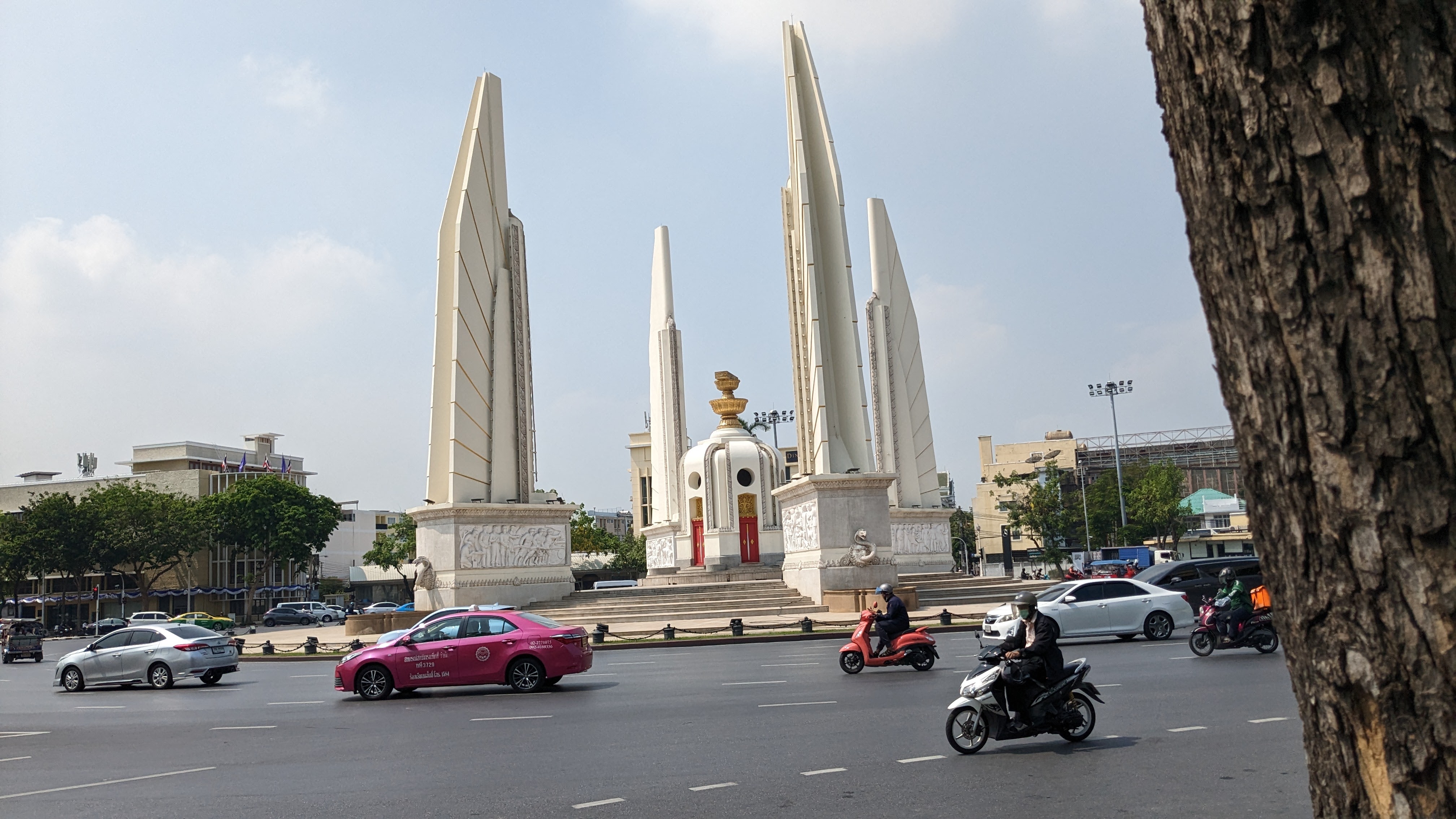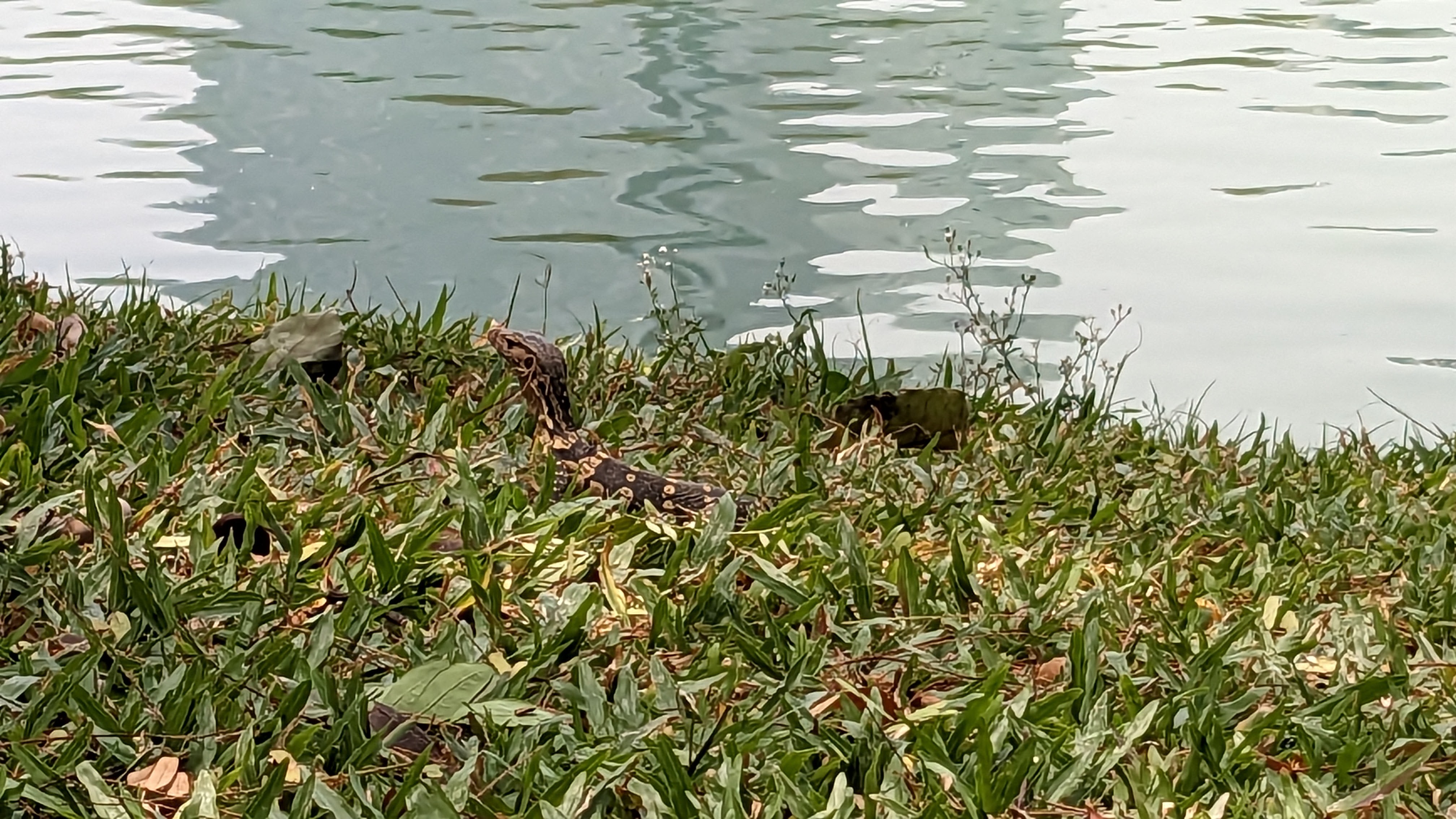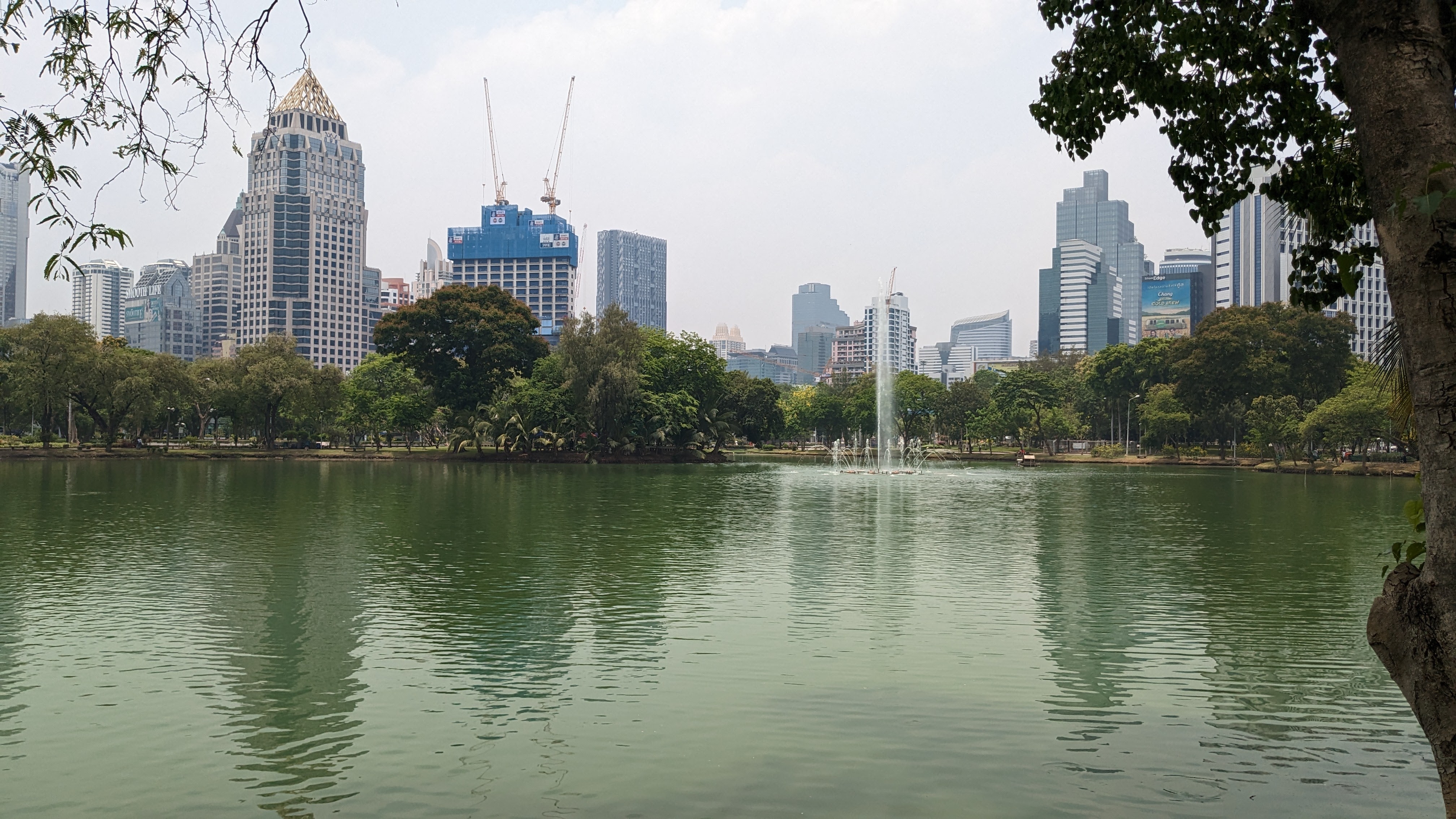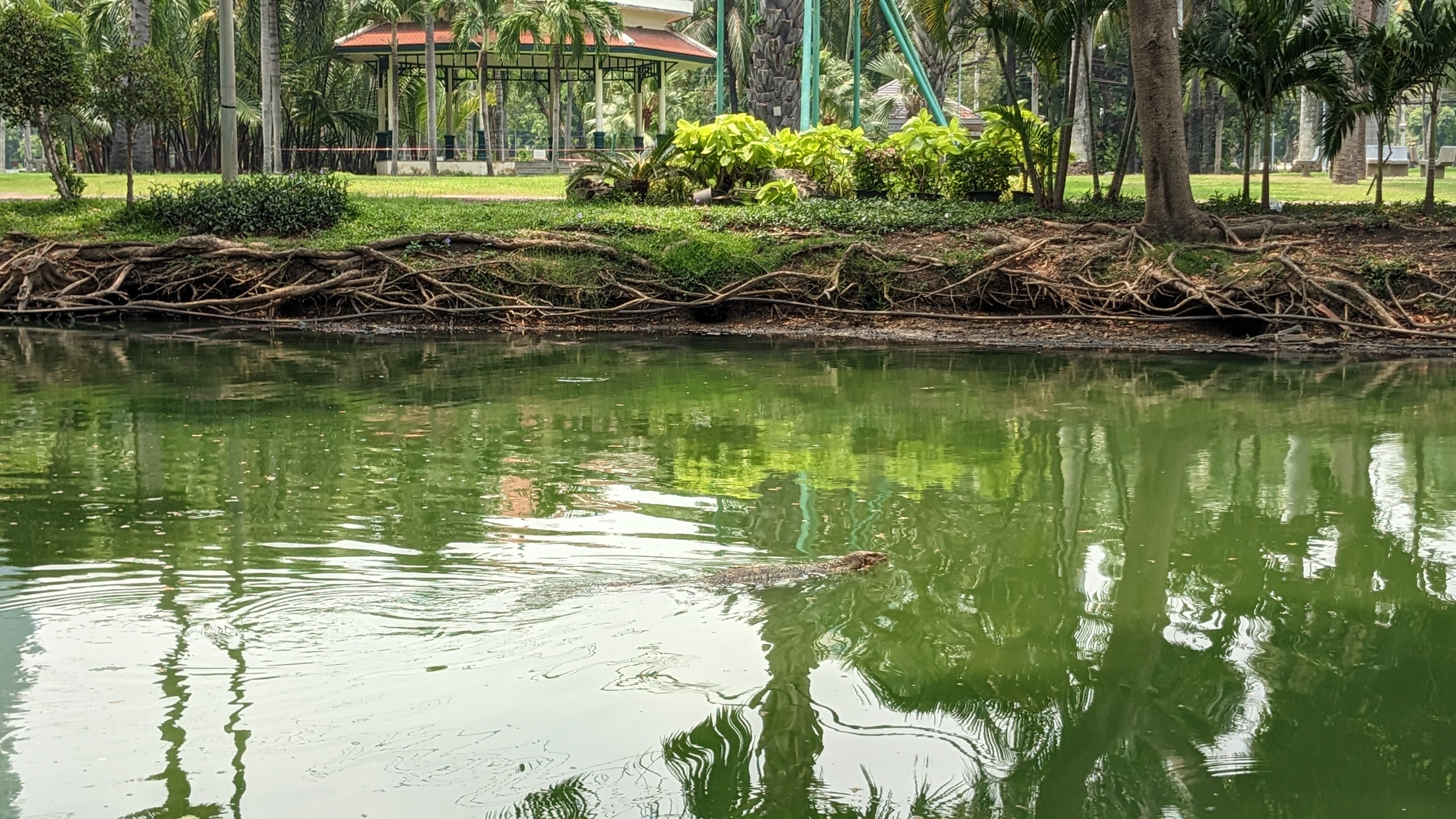 My travel into Bangkok was quick and fairly uneventful. It began with a morning boat trip to Chumphon, a shorter distance than my route out to the island, and on a significantly faster boat. After about 2 hours the boat arrived at a transfer station where I waited for another hour before boarding one of the buses. This bus ride took much longer than the boat, but I managed to nap for quite a bit of the journey. By the time we arrived in Bangkok, it had begun to get dark, revealing beautiful views of the skyline, in particular a beautifully lit bridge. Eventually, the bus stopped on the side of the street where I stepped off and proceeded to make the short walk to my hostel through the Bangkok night. After I arrived, I found the hostel fairly empty but did manage to settle in and meet a few people, including a nice German man named Aaron who had just come down from the north of Thailand where he had been training in a Muay Thai dojo for two months and would shortly be returning home. I went out to explore the nearby backpacker mecca of Khaosan Road. After the stories I had heard, I was fairly shocked to find it significantly calmer than Phuket’s Bangla Road (this may have been related to the Songkran festival). Khaosan was, unsurprisingly, lined with street vendors, massage parlors, bars, and dispensaries. It also had lots of beautiful trees and other greenery making it quite a bit more scenic. The road curves back and forth through the city, keeping the throngs of people largely out of view from each other and allowing for little corners where it almost felt secluded. After a little exploration, I settled on a couple of food stalls to sample and returned to the hostel for a good night of rest. The next day I decided to go out into the city with a girl from the hostel named Emma, in order to visit Lumphini Park, famed in part for the presence of numerous monitor lizards. Our journey began with a walk to a nearby bus station, taking us past the victory monument and allowing me to appreciate the first of many large gilded photos of the royals, situated in the middle of the major streets. When we arrived at the bus stop, we had a long wait before the bus arrived and took us to the park.