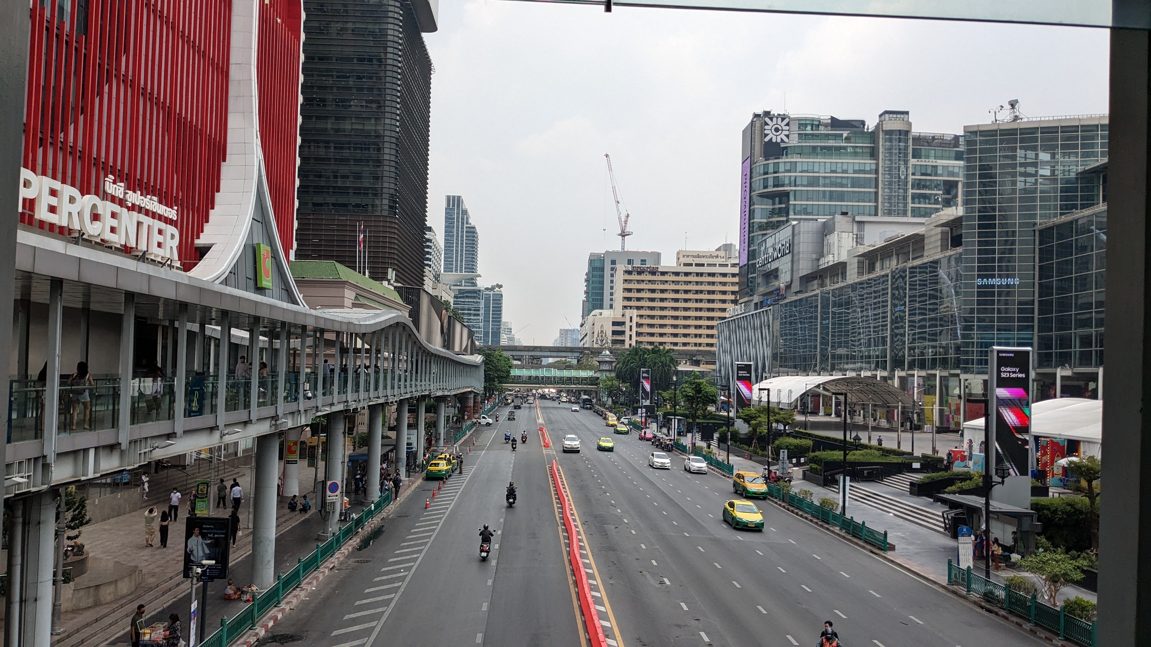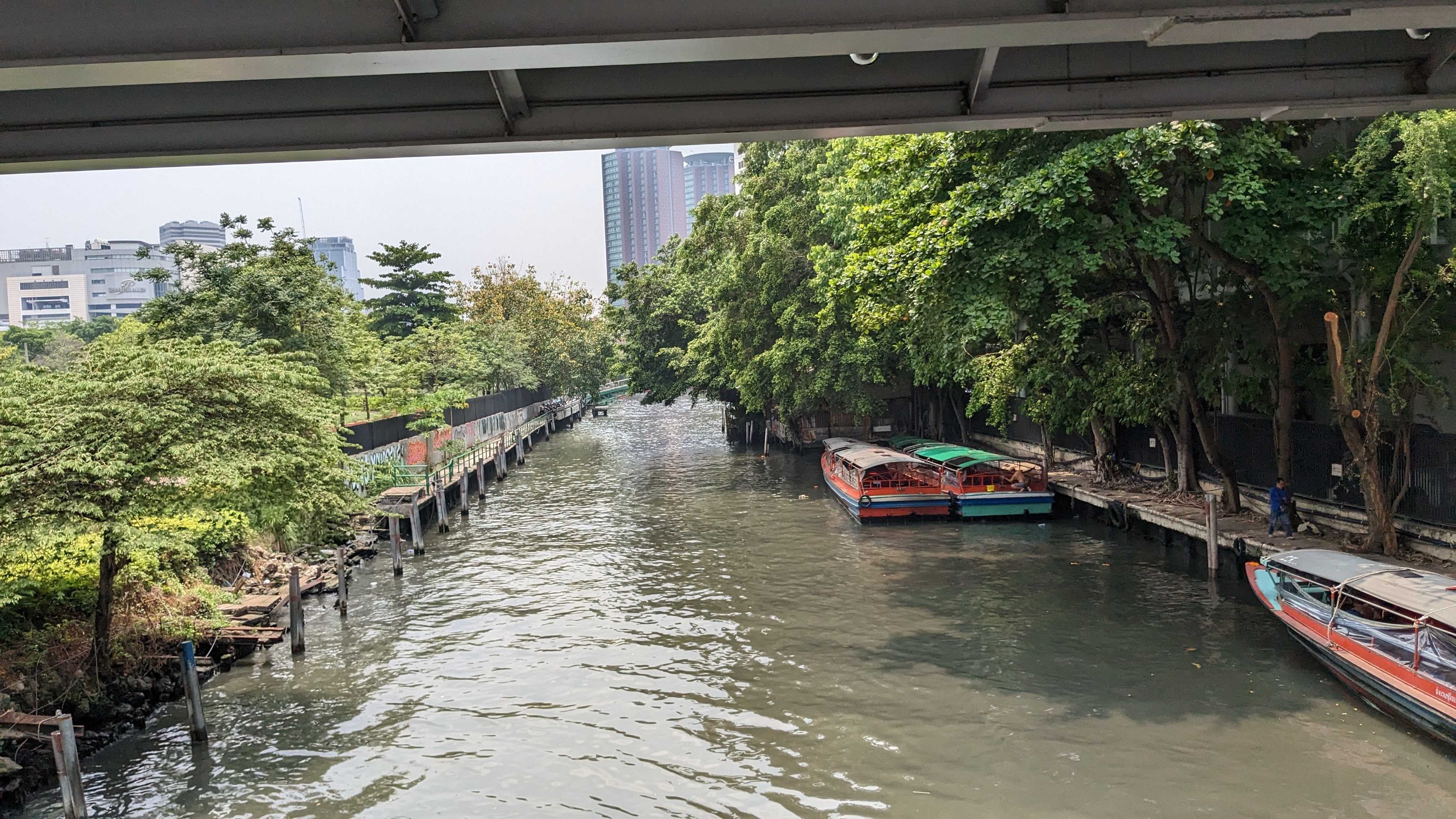 When we arrived at the park it was instantly impressive, though the lizards were not immediately visible. We walked around the park for some time, admiring the nature juxtaposed against the looming urban backdrop. Eventually, towards the far end of the park, we spotted our first lizard swimming lazily in the water. We continued walking along the river’s edge, and somehow from this point on every turn brought a new beautiful lizard into view. We meandered through the park for a few hours, admiring the wild flora and fauna, before beginning to walk back through the streets, hoping to see more of the city before returning to the hostel. This brought us to a massive mall, spanning multiple city blocks and both sides of the street. Intrigued and eager for air conditioning, we stepped in and explored the mall for a little while. The inside was quite varied, with all sorts of shops and even a complete high-rise apartment building contained within. Eventually, we had seen enough and decided to grab some food before continuing back to the hostel, admiring the streets and canals all the way.