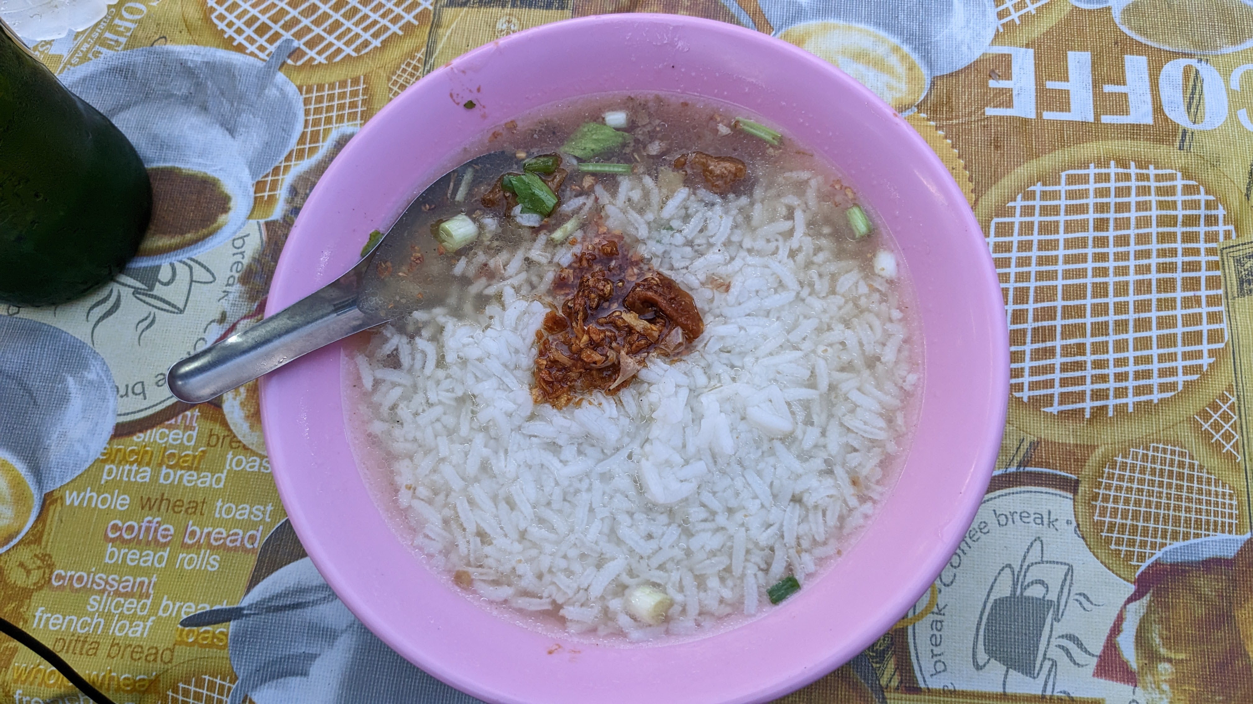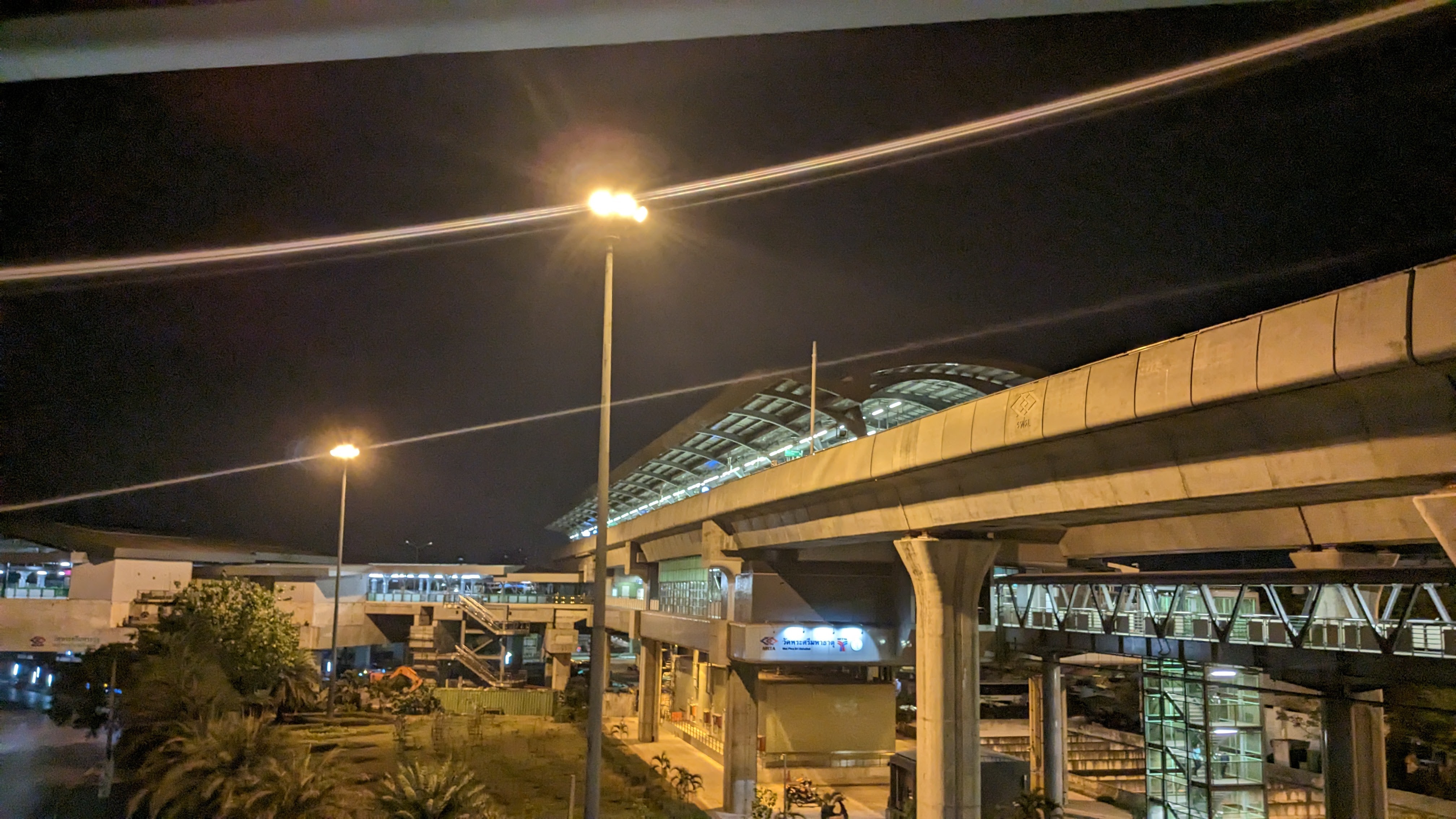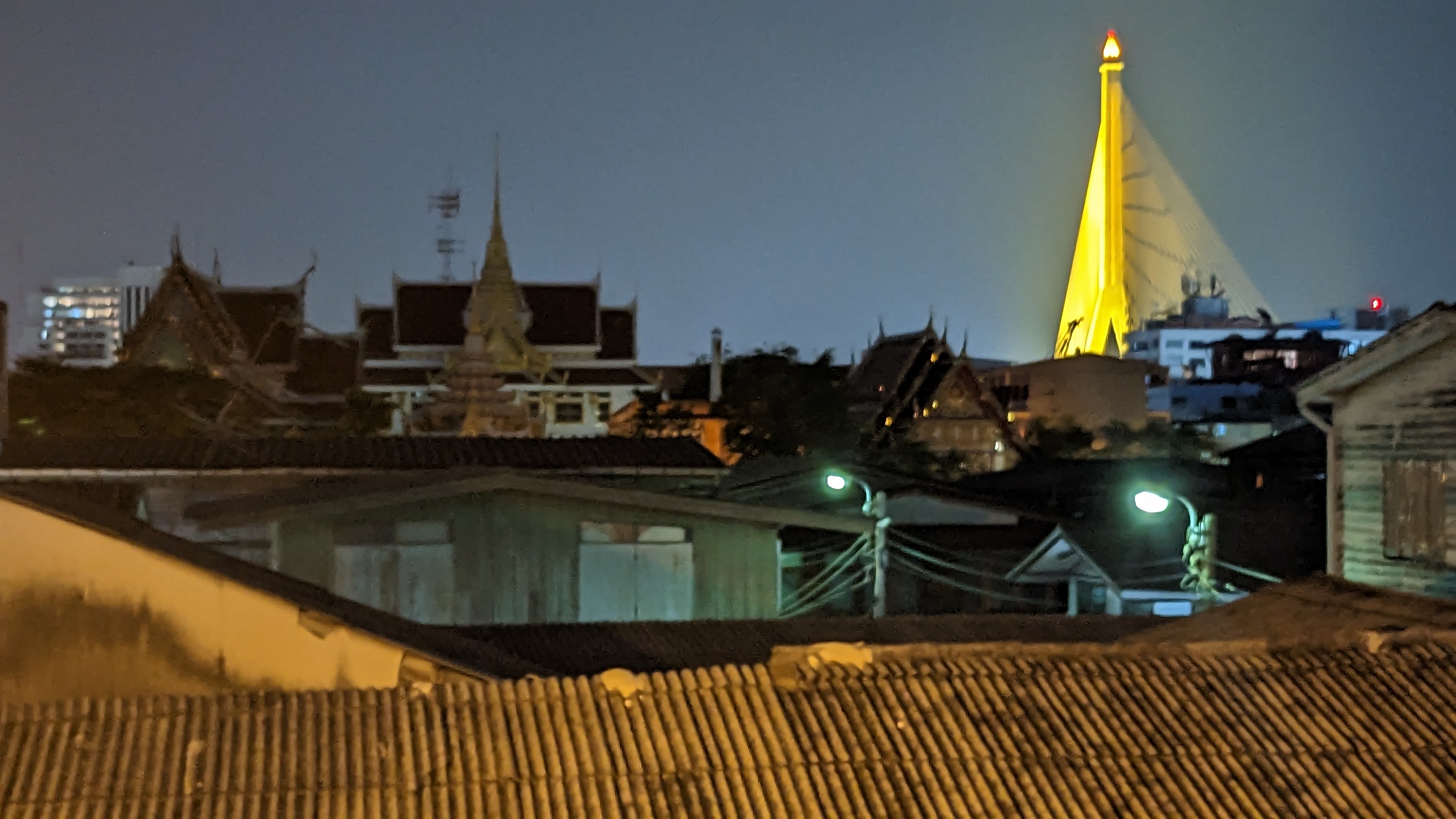 That evening Aaron and I had planned to go to a local Muay Thai fight, which seemed particularly appropriate given that it is a Thai martial art, and Aaron was particularly knowledgeable about it after his recent training. The stadium was across town from our hostel and the fight started during rush hour, so the best option for us to get there was ordering individual Grab bike drivers to take us across the city. We both ordered them through the app, and before too long my driver appeared, handed me a helmet, and I hopped on the back. I was then treated to an impressive exploration of Bangkok traffic through the eyes of an experienced rider. The amount of motorbikes in the area allows for a complete set of parallel rules and traffic flow for the bikes, including tons of lane splitting and weaving between cars in the lane. After the impressive but at times scary ride, I found myself saying goodbye to my driver at the stadium and waiting outside for Aaron as the flow of people into the stadium grew and grew. After a few minutes he arrived and we both got our tickets before entering the stadium and finding our seats. The fight itself was interesting but to me a little underwhelming. It was certainly impressive to see some clearly talented fighters, but by the end of the 4+ hour event, I found myself dozing off a little bit. That said, there were absolutely some exciting moments and it was nice to learn a little more about the sport from Aaron. When the event ended just a little before midnight, the two of us walked out onto the streets and decided to try to use public transport to return to the hostel. This took quite a bit longer than expected with a few transport stops shut down, but we eventually made it within walking distance and enjoyed a final evening stroll back to the hostel, making it to bed a little after 2 am. The next day featured more walking around the city, enjoying delicious food (rice soup and pandan cakes w/ brown sugar syrup pictured) and the beautiful views.