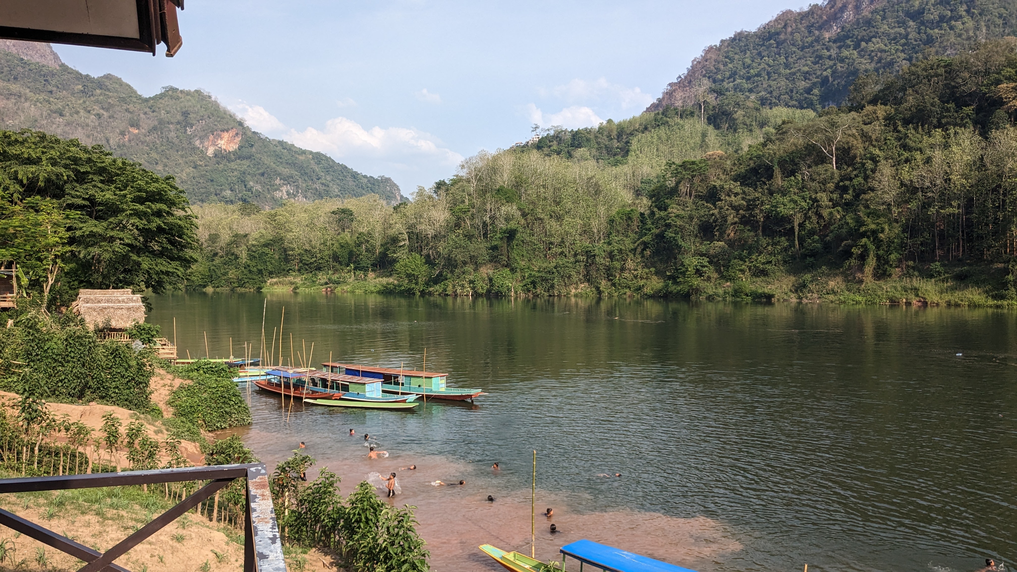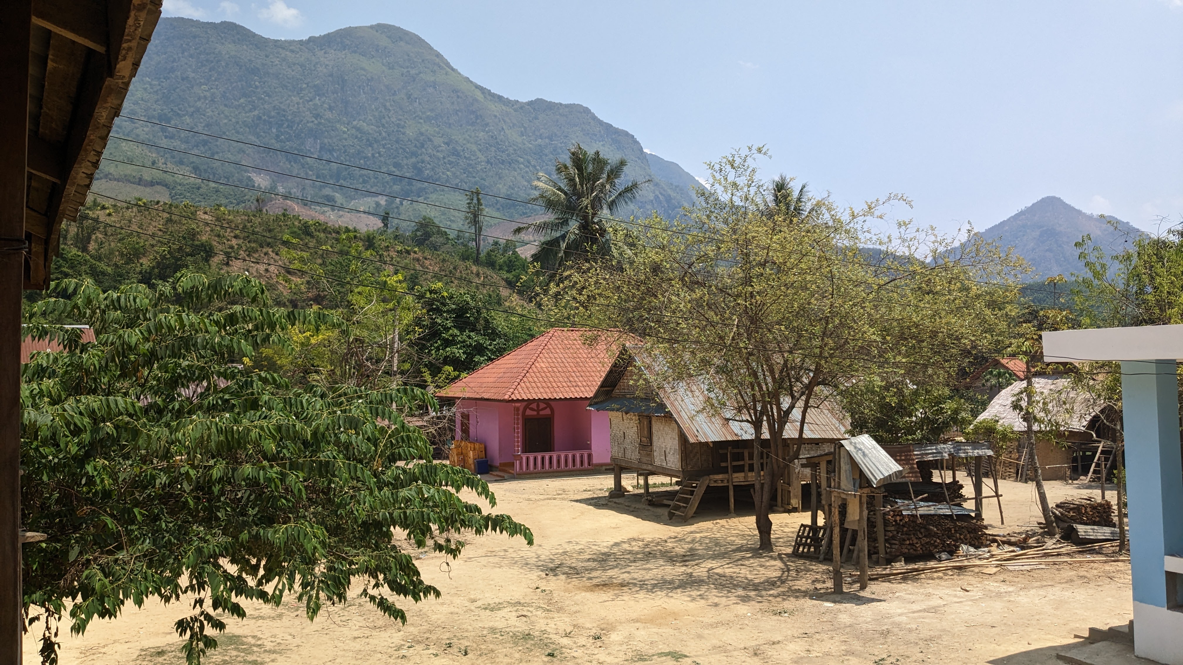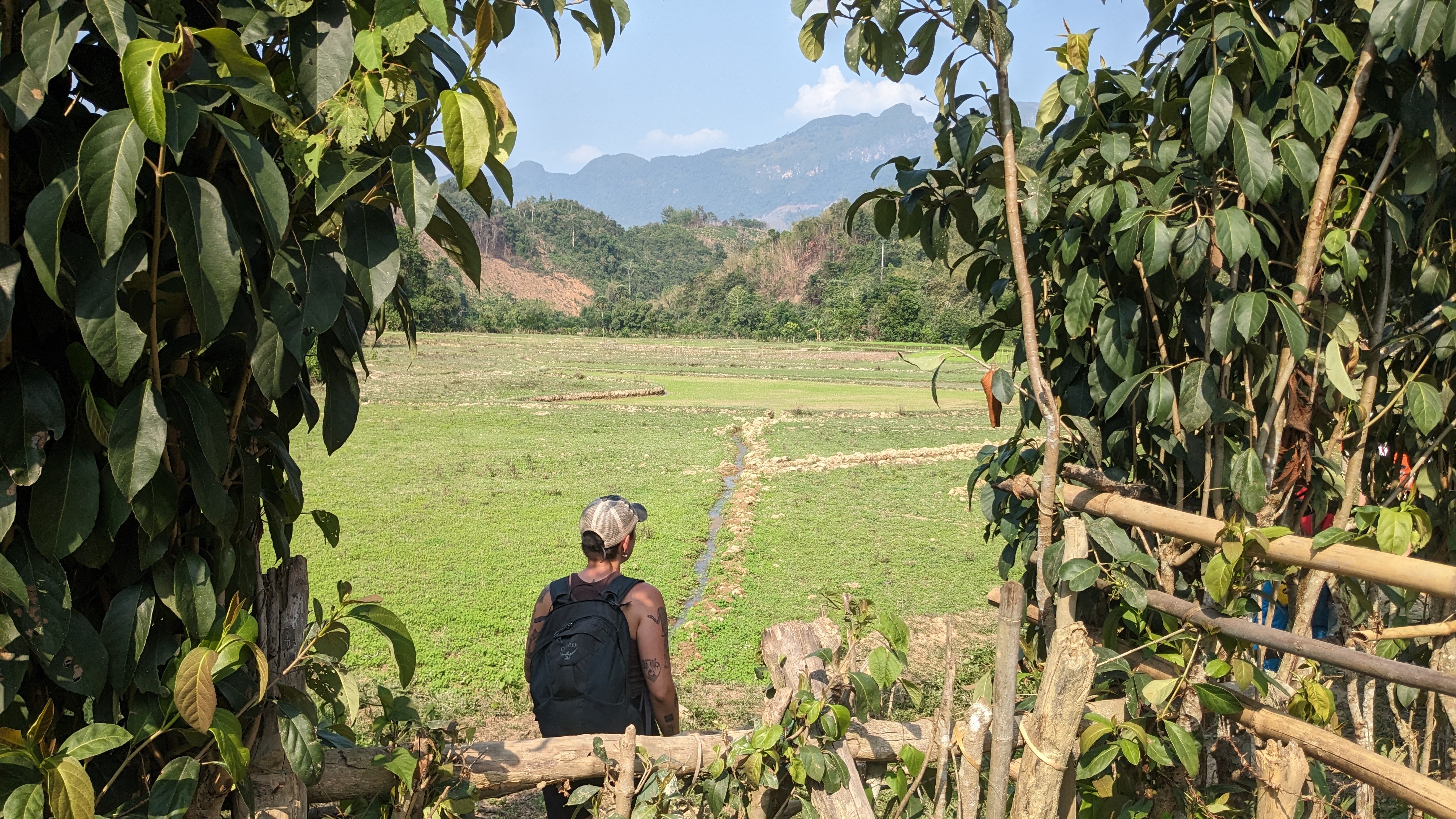 I napped a little bit along the ride up to Nong Kiaw, but when I was awake I enjoyed beautiful views and dramatic landscapes passing by. Once our bus did arrive, we got a tuk tuk (pictured, in the back, left to right: Kate, Manon, Juriaan, Frank, James, Me) to take us over to our accommodations, a locally owned riverside hotel that also offered trekking. We got our briefing from the owner by way of a chalk map of our route, then changed and set off to swim in the nearby river. After cooling off we set out to find dinner and closed out the night with a few beers before an early night, excited for the beginning of our trek early the next morning. We started off in a tuk tuk once again, and made a quick lap around the small town of Nong Kiaw picking up six others before we set off out of town to the start point. We started out over flat land and small hills, crossing rivers as we moved towards an imposing mountain pass. Eventually the land flattened out and we made our way past rice paddies and cassava fields into a small local village, where we stopped to rest and have lunch.