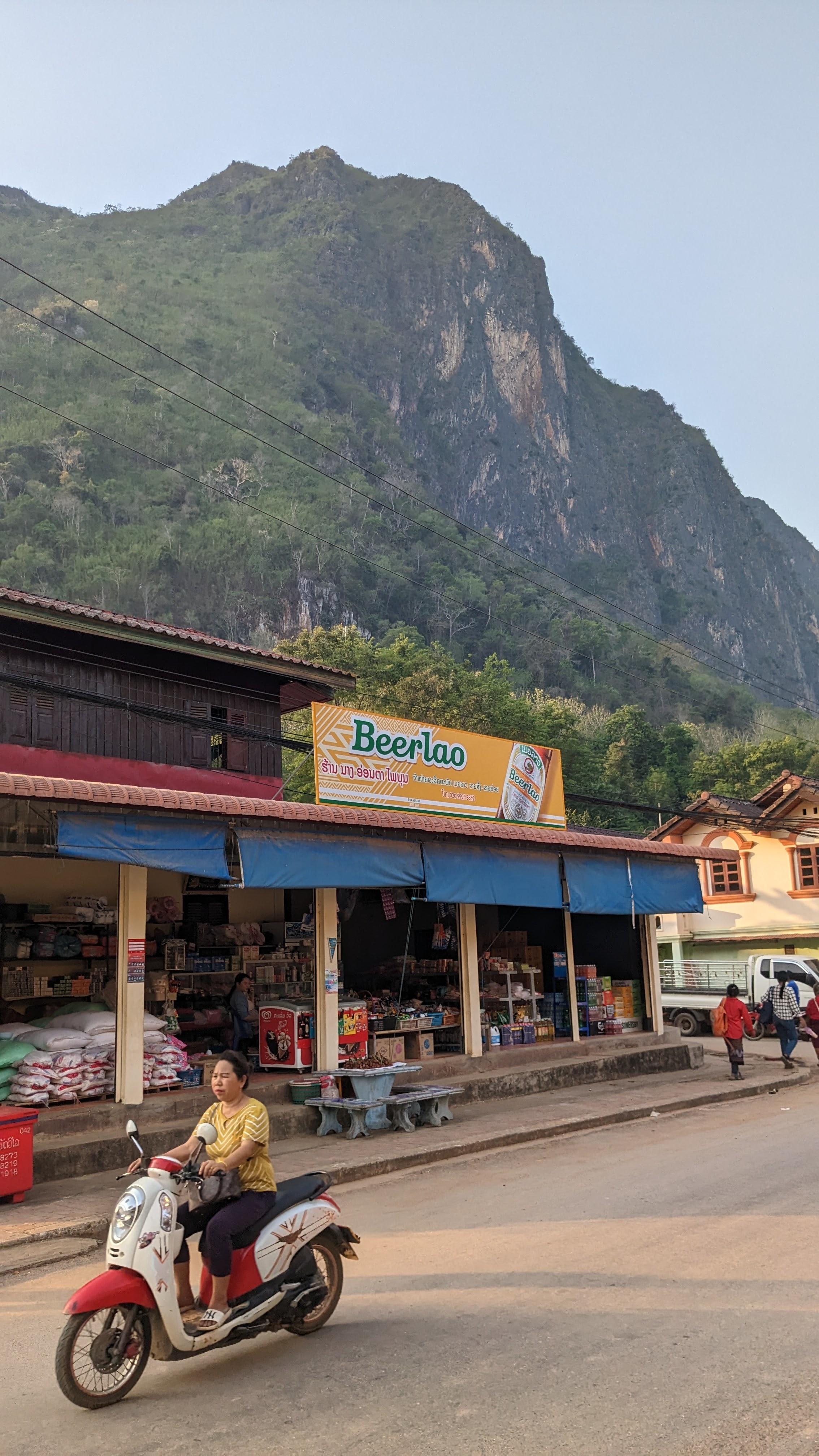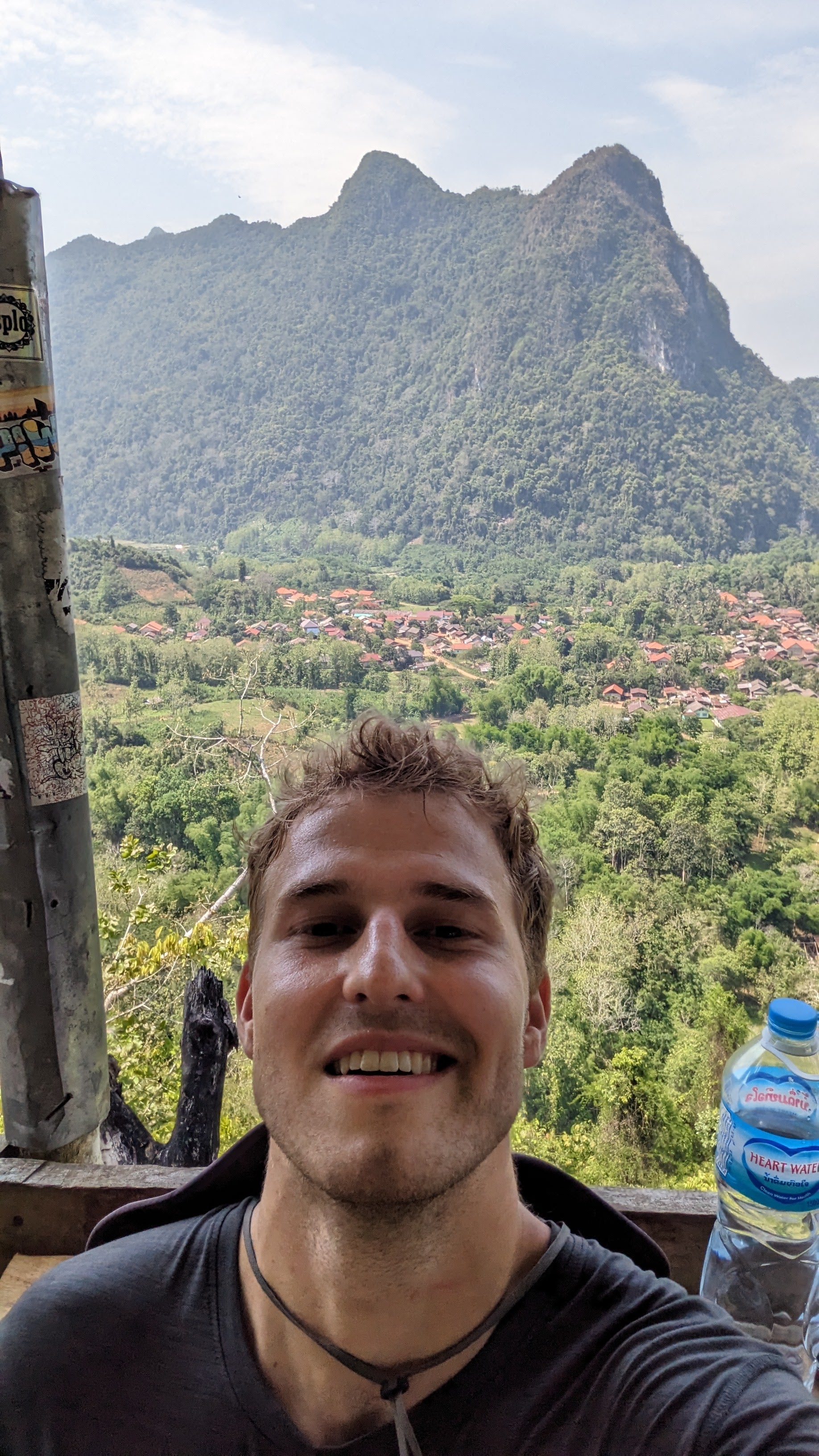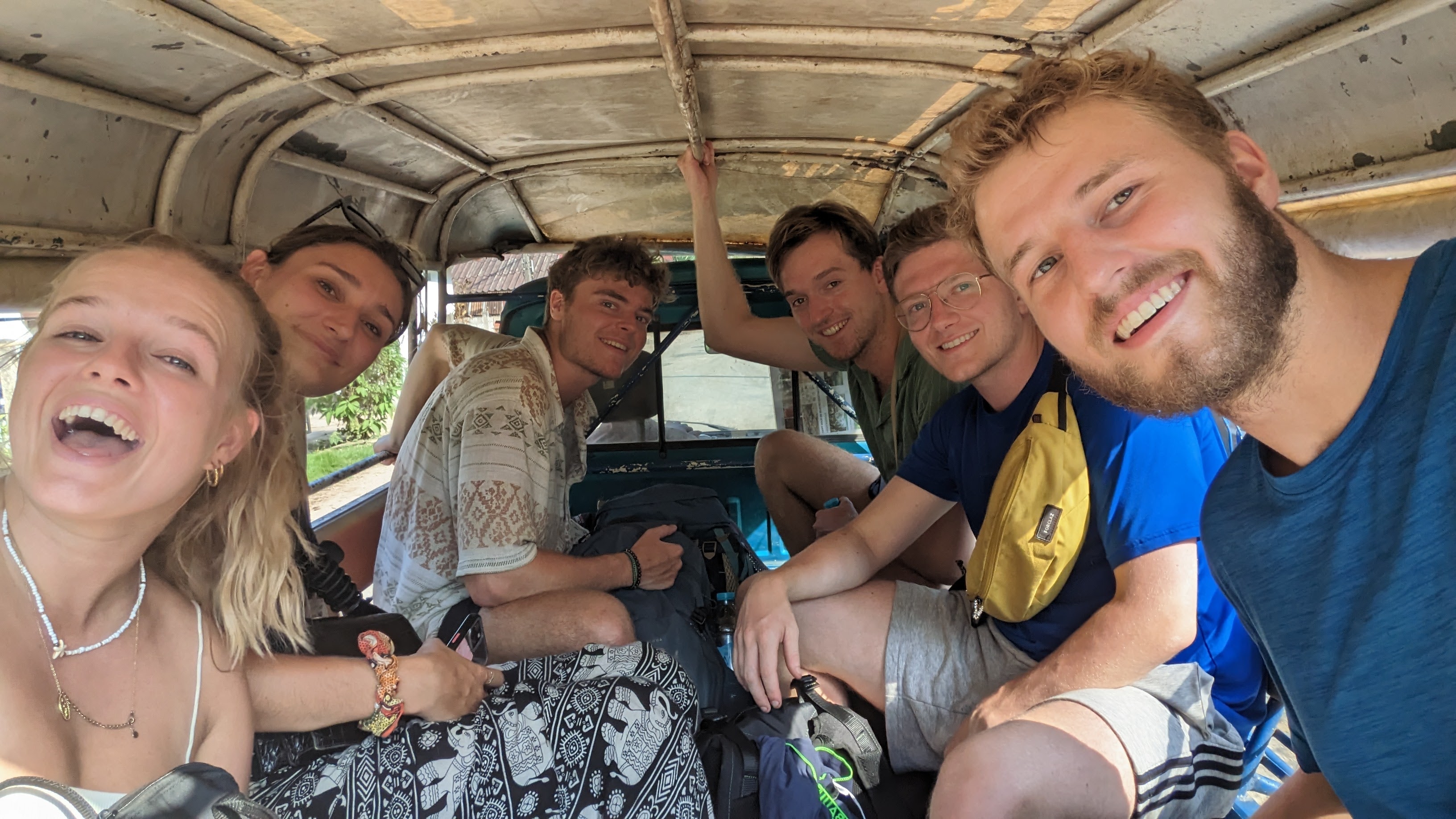 I napped a little bit along the ride up to Nong Kiaw, but when I was awake I enjoyed beautiful views and dramatic landscapes passing by. Once our bus did arrive, we got a tuk tuk (pictured, in the back, left to right: Kate, Manon, Juriaan, Frank, James, Me) to take us over to our accommodations, a locally owned riverside hotel that also offered trekking. We got our briefing from the owner by way of a chalk map of our route, then changed and set off to swim in the nearby river. After cooling off we set out to find dinner and closed out the night with a few beers before an early night, excited for the beginning of our trek early the next morning. We started off in a tuk tuk once again, and made a quick lap around the small town of Nong Kiaw picking up six others before we set off out of town to the start point. We started out over flat land and small hills, crossing rivers as we moved towards an imposing mountain pass. Eventually the land flattened out and we made our way past rice paddies and cassava fields into a small local village, where we stopped to rest and have lunch.