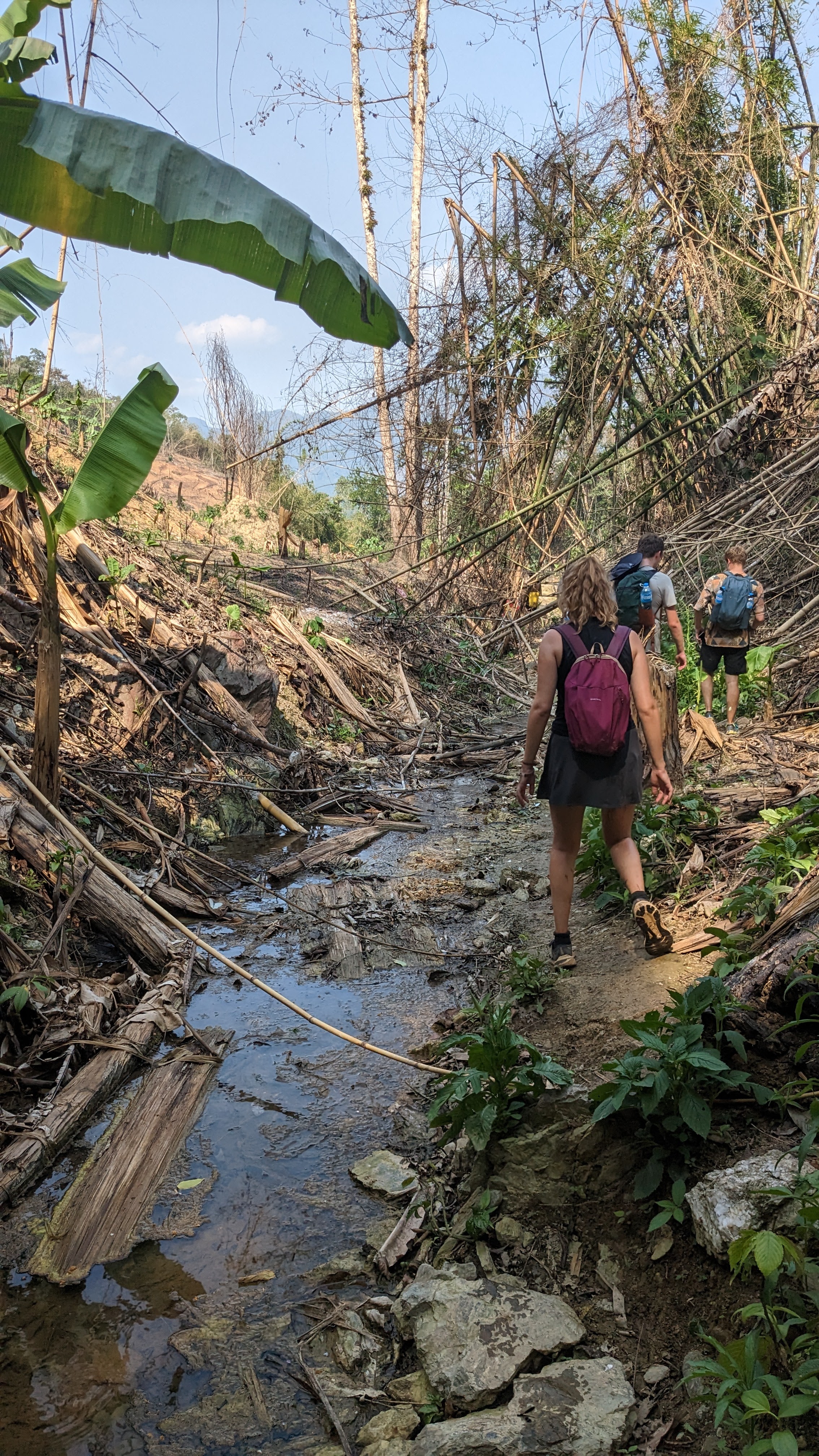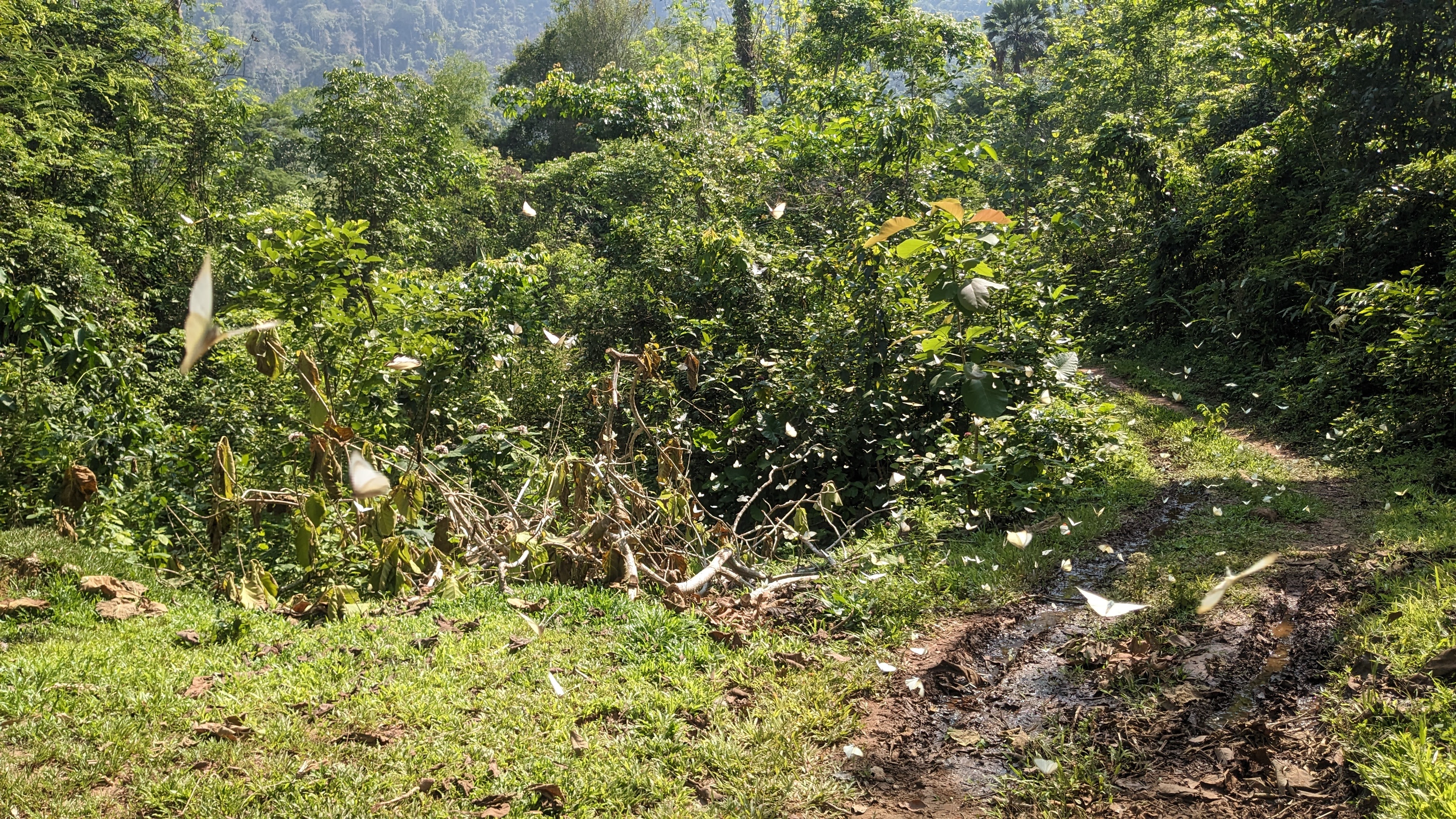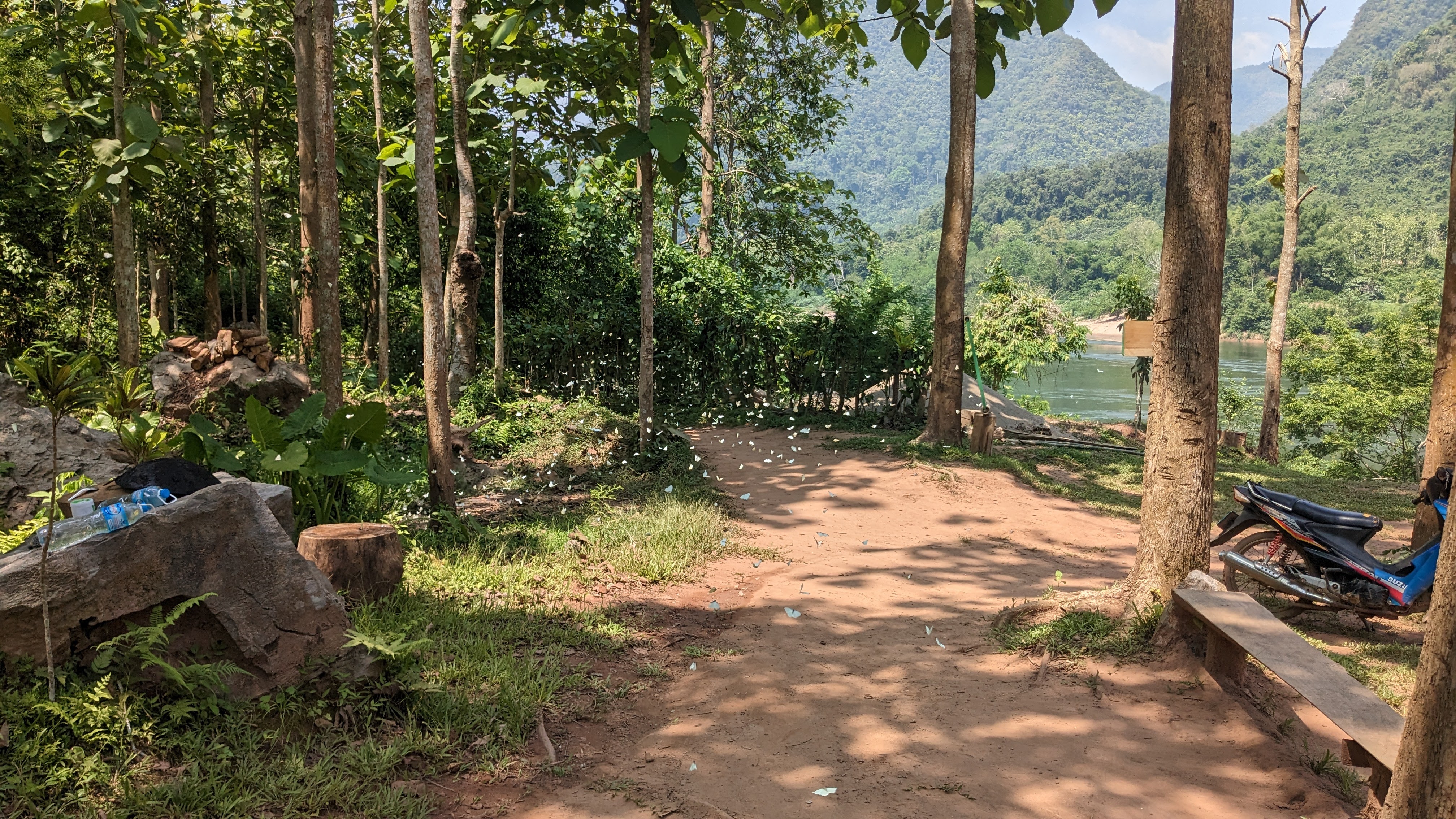 I enjoyed a delicious lunch of sticky rice, a pumpkin curry, and some stir fried vegetables with lots of garlic and soy sauce. Afterwards I got to walk around the village for a little while, but eventually we set off once again, this time on a much narrower path, up and over an imposing ridge. All very sweaty and occasionally struggling to keep our footing on the floor of bamboo leaves, we eventually all made it to the crest of the ridge and took a well deserved rest, enjoying the water we had carried all the way up. Then we descended the other side along a mountain river with lots of diverse greenery, fungi, and birds chirping in the trees. When we reached the bottom, luckily without any serious falls, we continued to follow the river as we were surrounded by swarms of beautiful white butterflies. We passed a local woman burning greenery to clear her fields, and continued onwards through more and more developed rice paddies and small houses towards our destination for the evening.