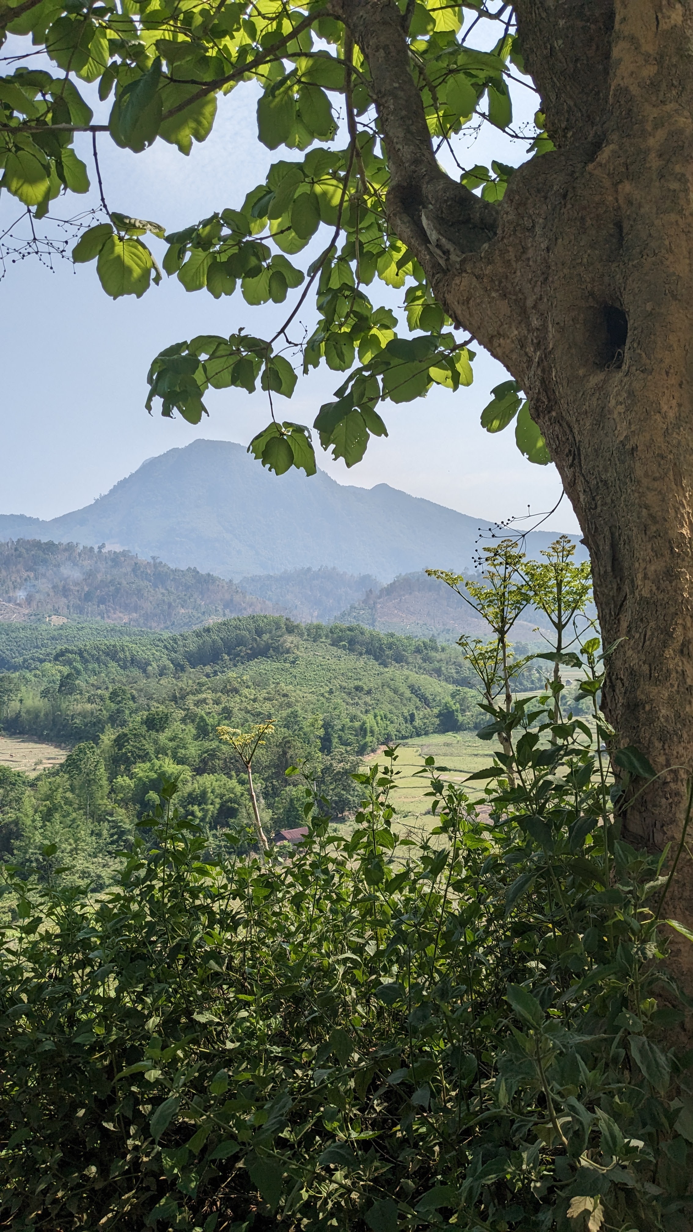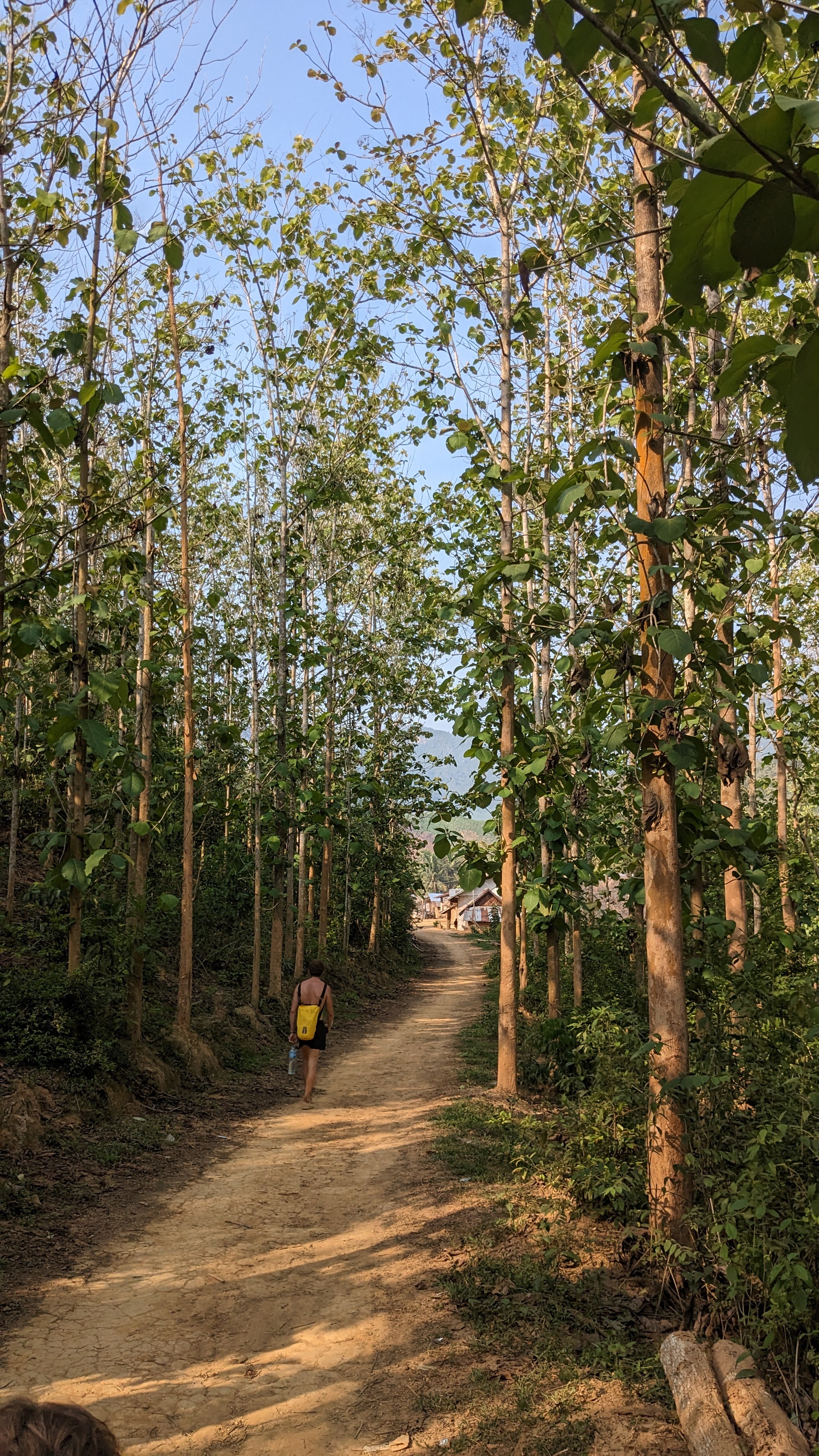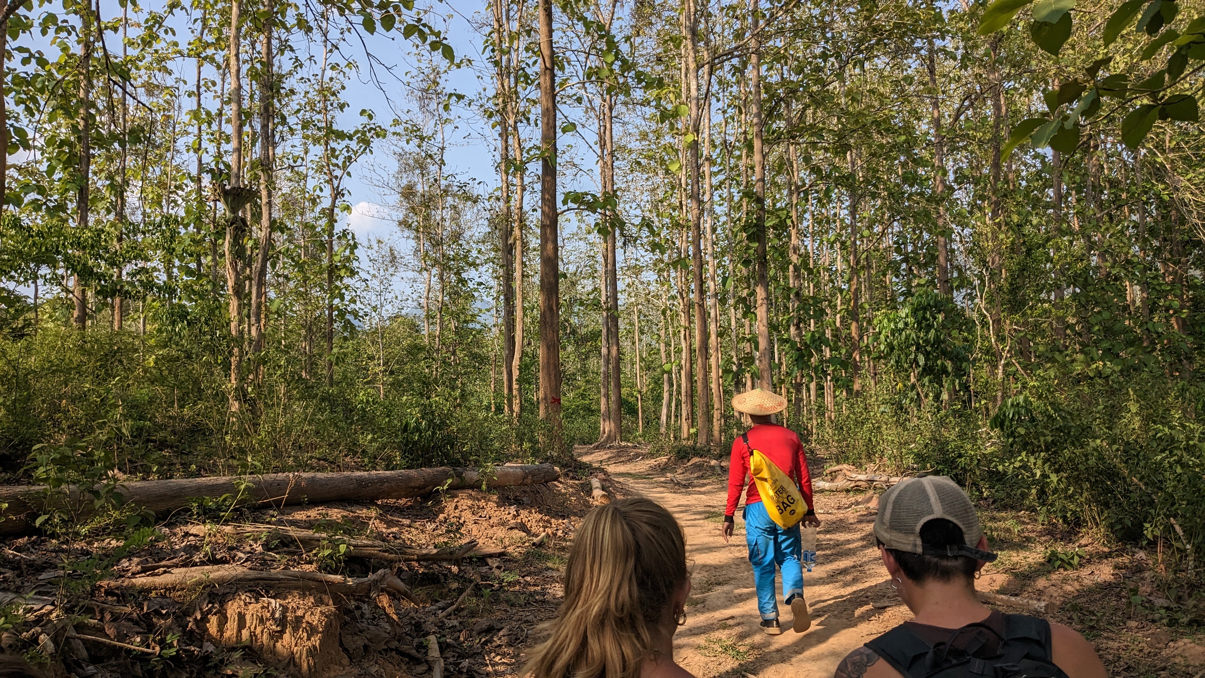 I enjoyed a delicious lunch of sticky rice, a pumpkin curry, and some stir fried vegetables with lots of garlic and soy sauce. Afterwards I got to walk around the village for a little while, but eventually we set off once again, this time on a much narrower path, up and over an imposing ridge. All very sweaty and occasionally struggling to keep our footing on the floor of bamboo leaves, we eventually all made it to the crest of the ridge and took a well deserved rest, enjoying the water we had carried all the way up. Then we descended the other side along a mountain river with lots of diverse greenery, fungi, and birds chirping in the trees. When we reached the bottom, luckily without any serious falls, we continued to follow the river as we were surrounded by swarms of beautiful white butterflies. We passed a local woman burning greenery to clear her fields, and continued onwards through more and more developed rice paddies and small houses towards our destination for the evening.