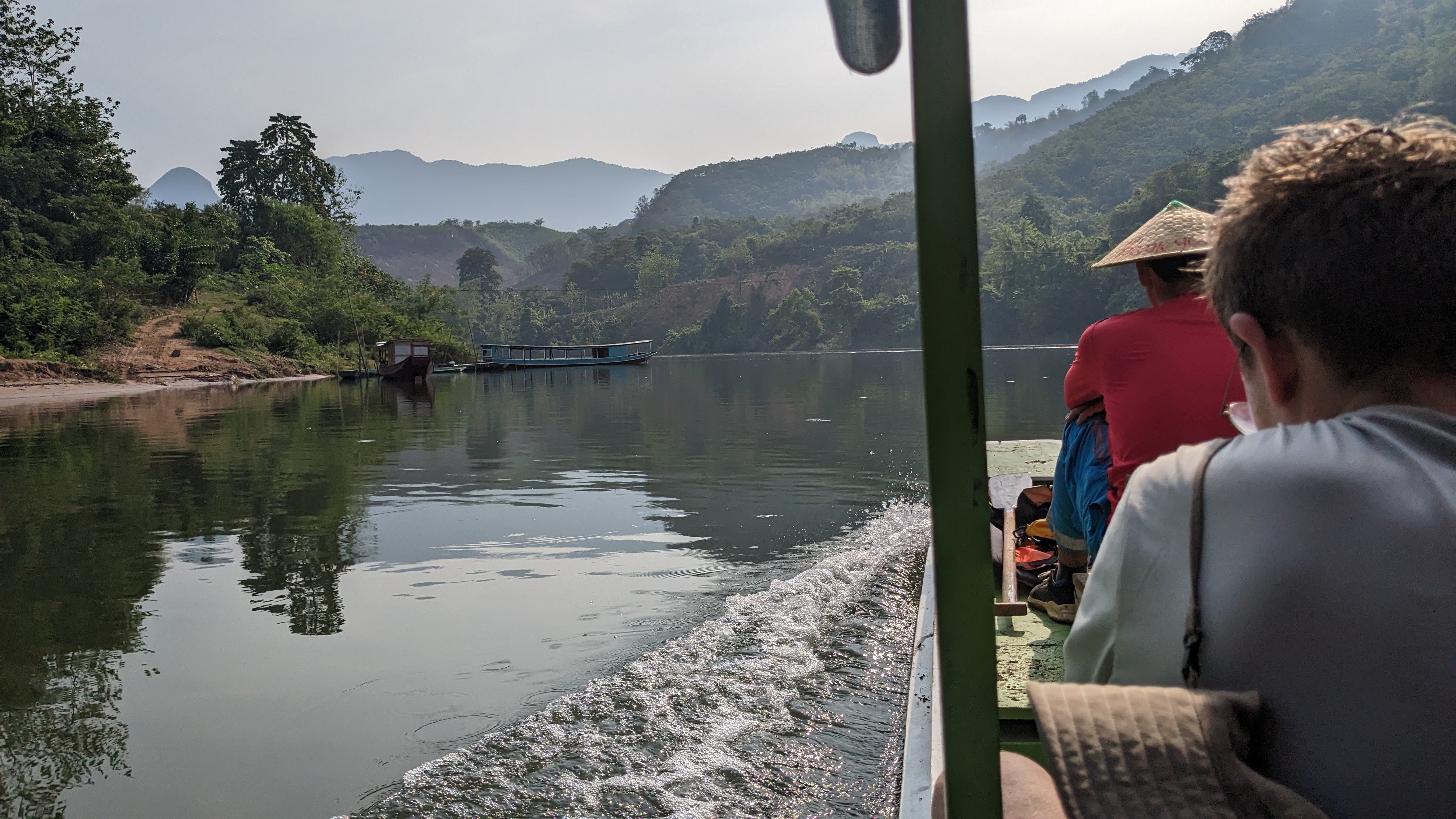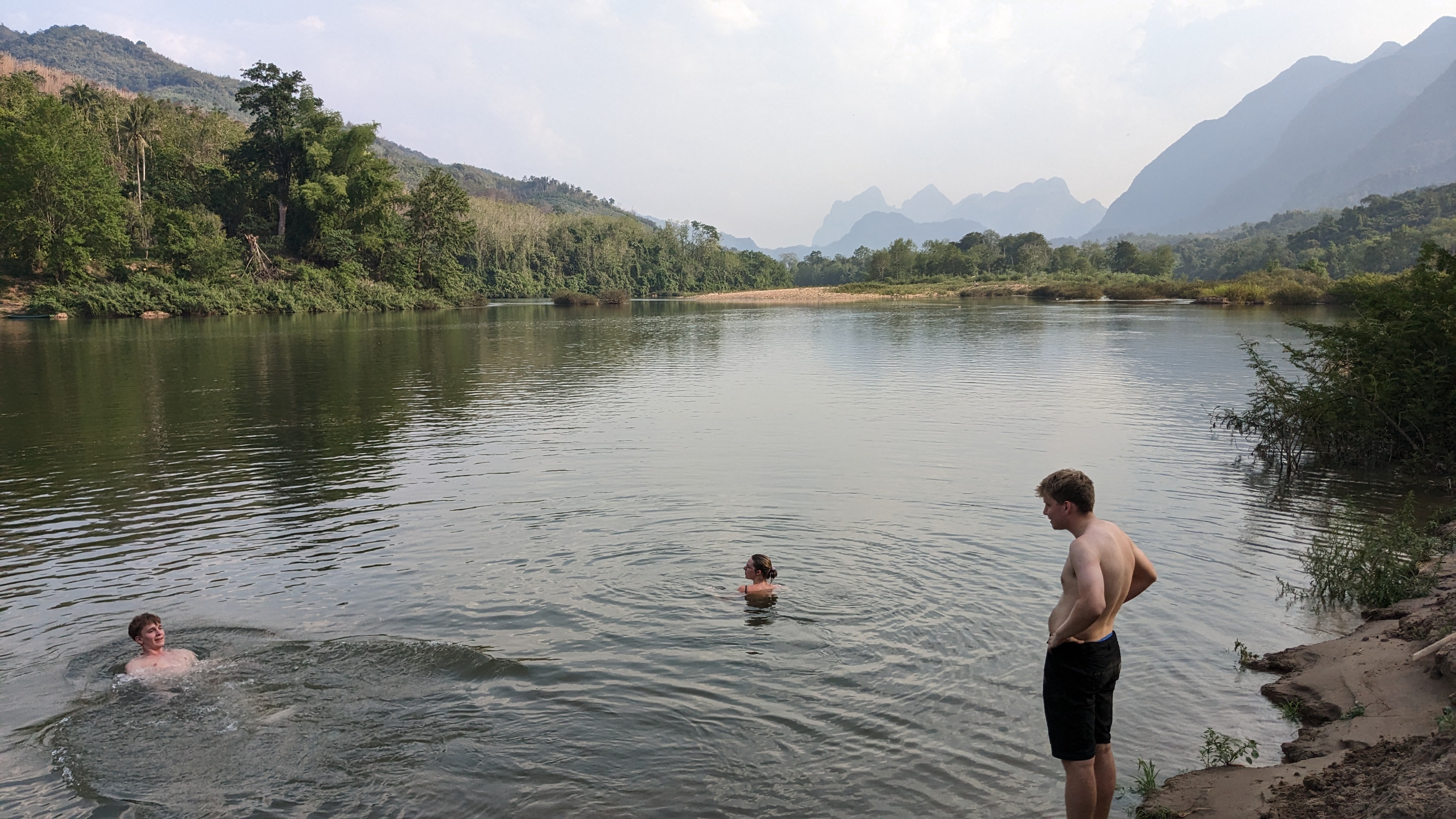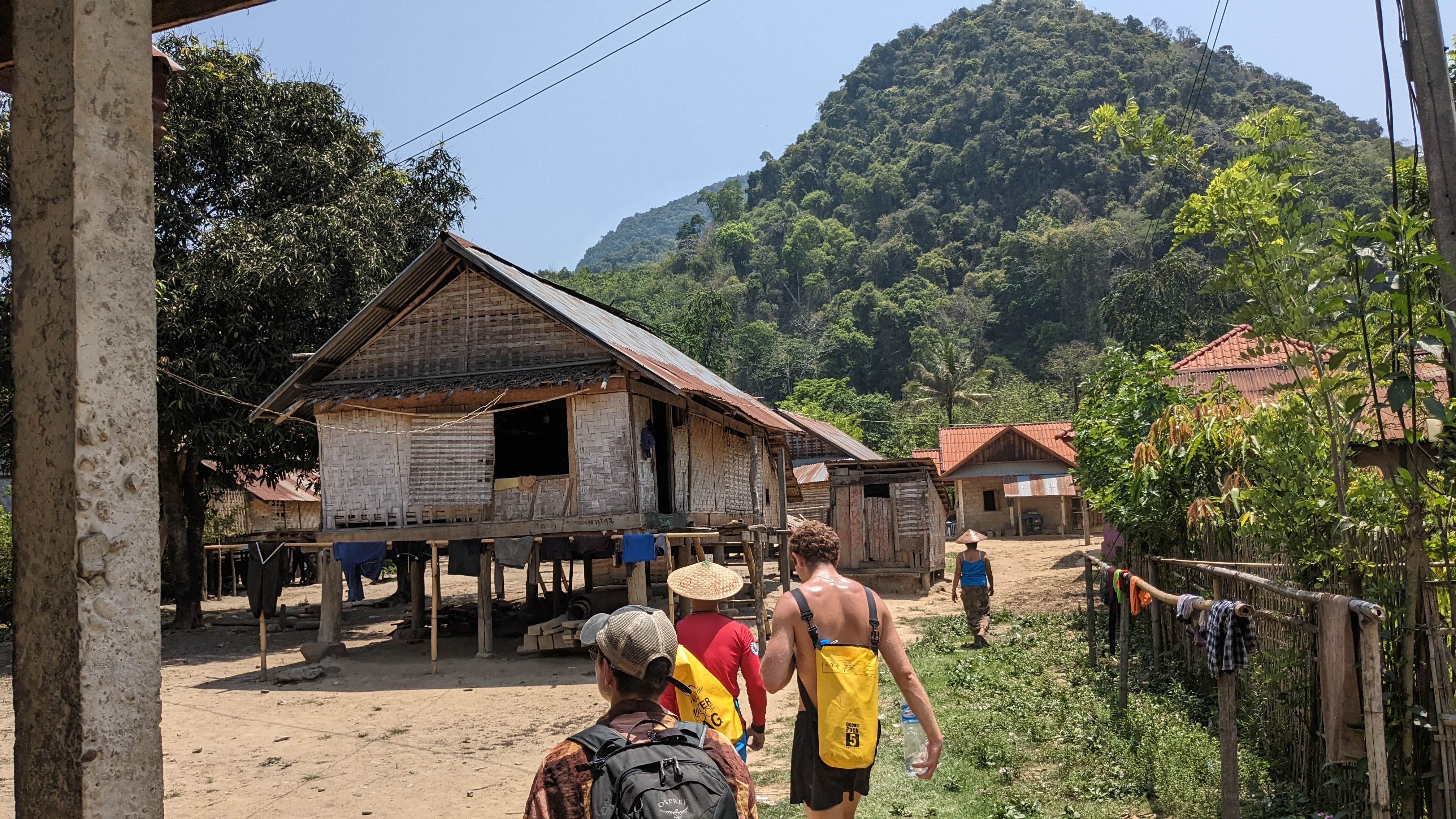 After a little more walking, complete of course with beautiful views and interesting bugs, we found ourselves at a beautiful riverside village. Quite sweaty and ready for a break from the heat, we assigned beds and made our way down to the river for a nice swim before dinner. We then explored the town for some time, playing with local children and enjoying exploring such a foreign environment. Eventually we all sat down for a dinner cooked by a very kind local woman, accompanied by ample quantities of local rice wine. After a fun night getting to know the whole group better and enjoying truly local Lao food and culture, we all went to bed in order to rest up for the next day’s hiking. I woke up earlier than the others and decided to start my morning off with a small hike around the village. Wary of straying from the path due to the possibility of unexploded bombs in the area, I found a small path leading up into the nearby hills and followed it in order to get a nice view of the sun rising above the river valley and mountains beyond. Eventually I tired, and curious if others had awoken, made my way back into the town. There I found the locals just beginning their day, children starting to wake up and move around while parents prepared for their jobs and headed out into the fields. Unfortunately none of the other trekkers were awake yet so I decided to round out my morning with a swim across the nearby river. With a fairly strong current, I made it across quickly where I met a local man carrying palm fronds up and away from the bank, but tired on my way back and found myself swimming along the bank for some time, trying to make it back to the small beach where I had left my things. After I finally made it back to land and the path to the village, I was more than ready for a rest, so sat on the benches where we had eaten the night before, and gratefully accepted the coffee offered to me by our kind host, waiting for the others to show their faces before she started the process for breakfast. Within half an hour, my companions started to get up and join me, and before long the entire group was back together, drinking tea and coffee as breakfast came just in time to ease my weariness and prepare us for another day.