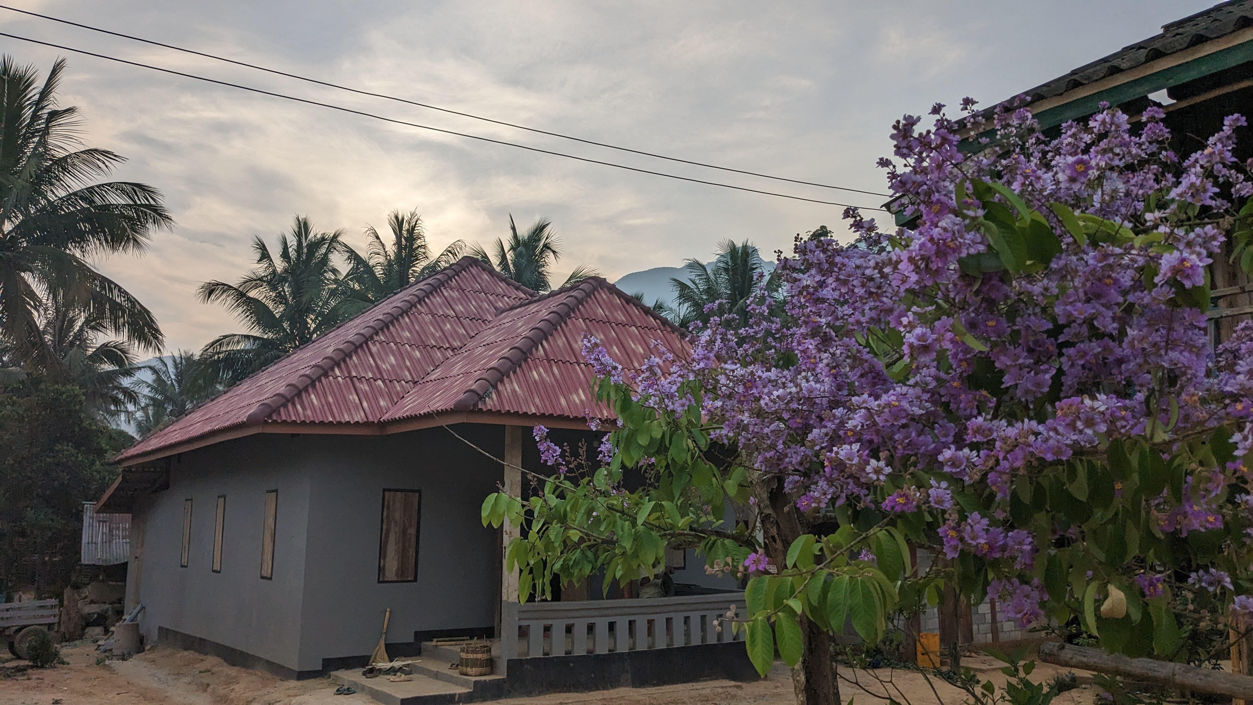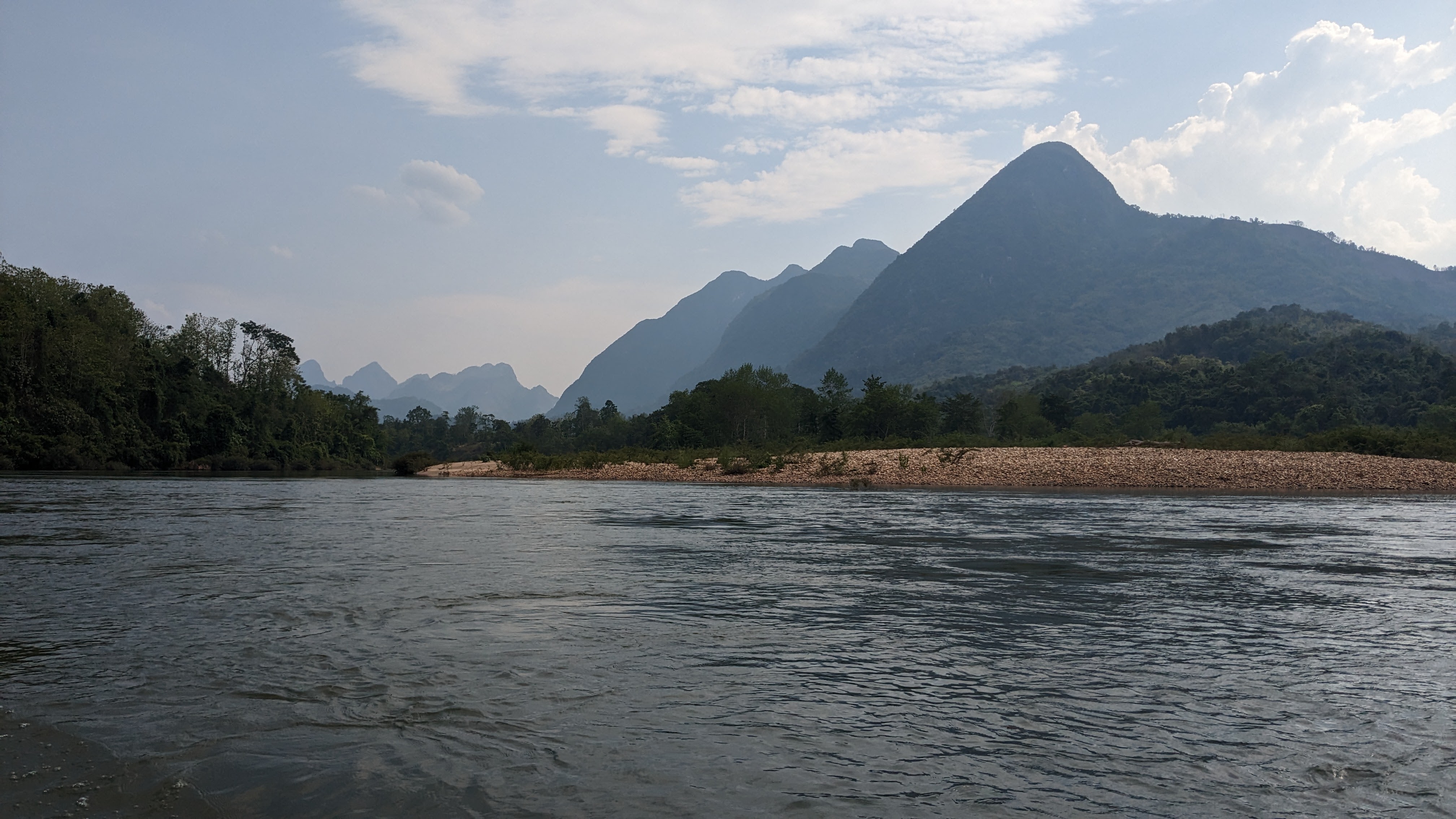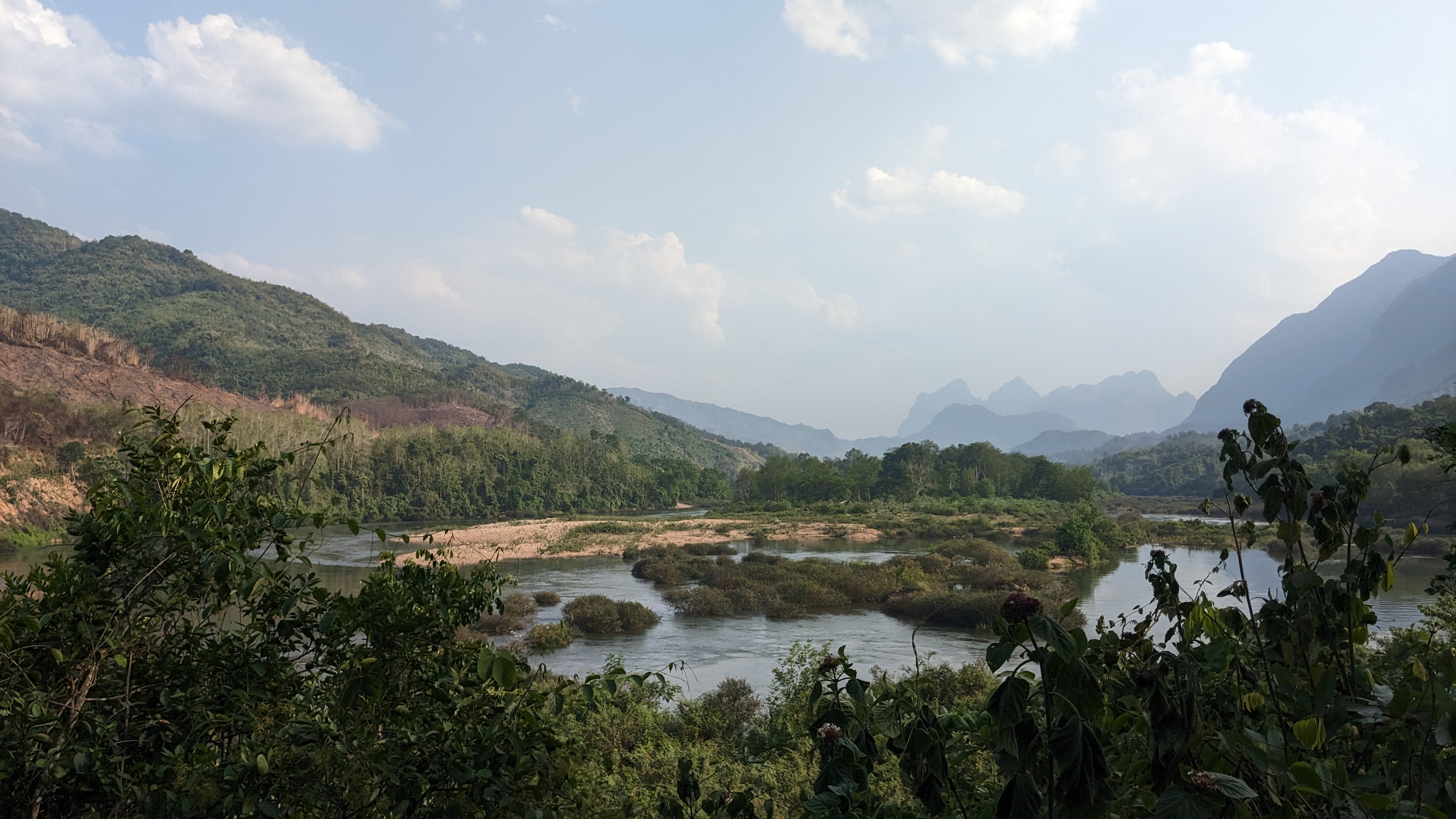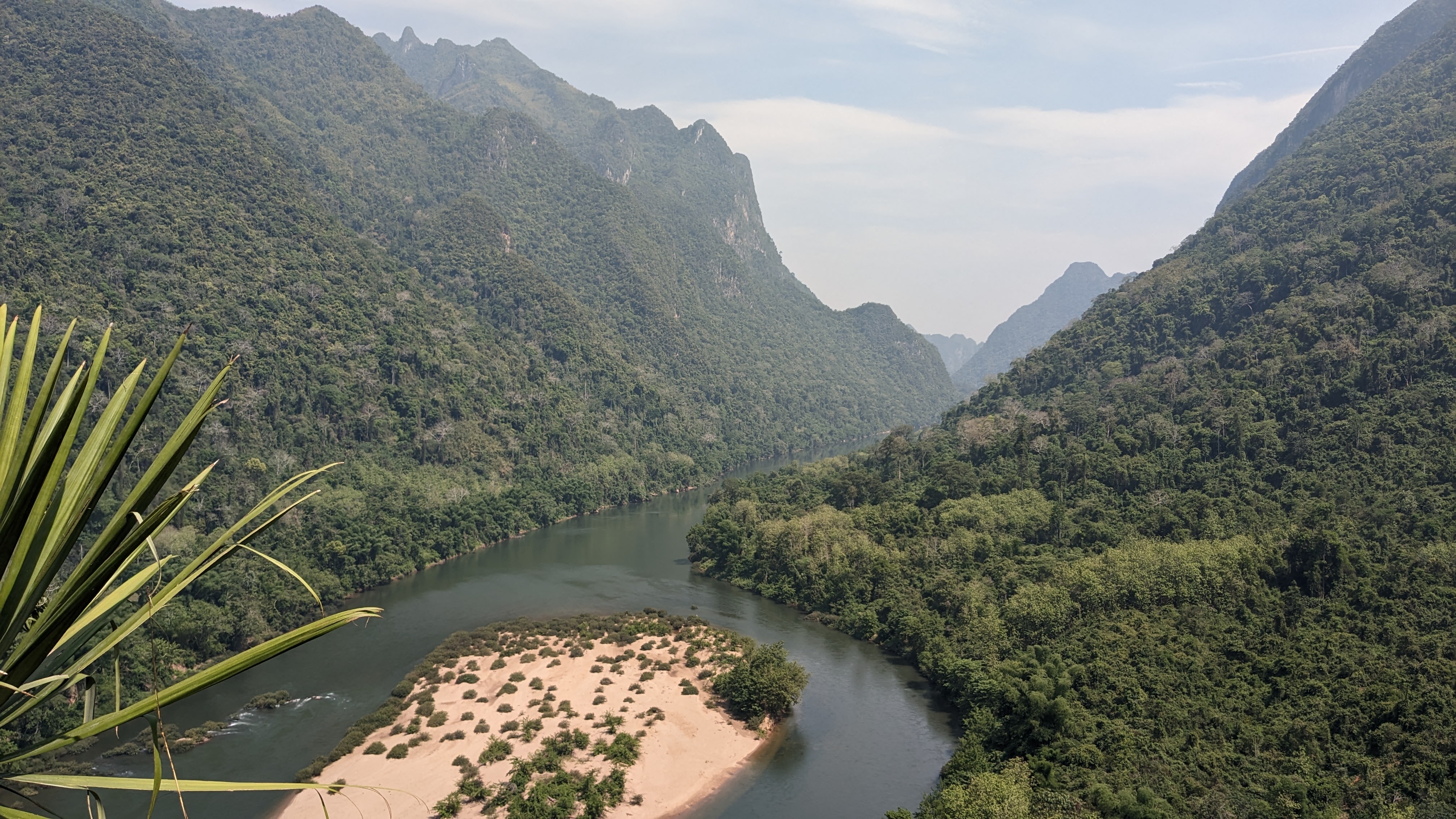 After a little more walking, complete of course with beautiful views and interesting bugs, we found ourselves at a beautiful riverside village. Quite sweaty and ready for a break from the heat, we assigned beds and made our way down to the river for a nice swim before dinner. We then explored the town for some time, playing with local children and enjoying exploring such a foreign environment. Eventually we all sat down for a dinner cooked by a very kind local woman, accompanied by ample quantities of local rice wine. After a fun night getting to know the whole group better and enjoying truly local Lao food and culture, we all went to bed in order to rest up for the next day’s hiking. I woke up earlier than the others and decided to start my morning off with a small hike around the village. Wary of straying from the path due to the possibility of unexploded bombs in the area, I found a small path leading up into the nearby hills and followed it in order to get a nice view of the sun rising above the river valley and mountains beyond. Eventually I tired, and curious if others had awoken, made my way back into the town. There I found the locals just beginning their day, children starting to wake up and move around while parents prepared for their jobs and headed out into the fields. Unfortunately none of the other trekkers were awake yet so I decided to round out my morning with a swim across the nearby river. With a fairly strong current, I made it across quickly where I met a local man carrying palm fronds up and away from the bank, but tired on my way back and found myself swimming along the bank for some time, trying to make it back to the small beach where I had left my things. After I finally made it back to land and the path to the village, I was more than ready for a rest, so sat on the benches where we had eaten the night before, and gratefully accepted the coffee offered to me by our kind host, waiting for the others to show their faces before she started the process for breakfast. Within half an hour, my companions started to get up and join me, and before long the entire group was back together, drinking tea and coffee as breakfast came just in time to ease my weariness and prepare us for another day.