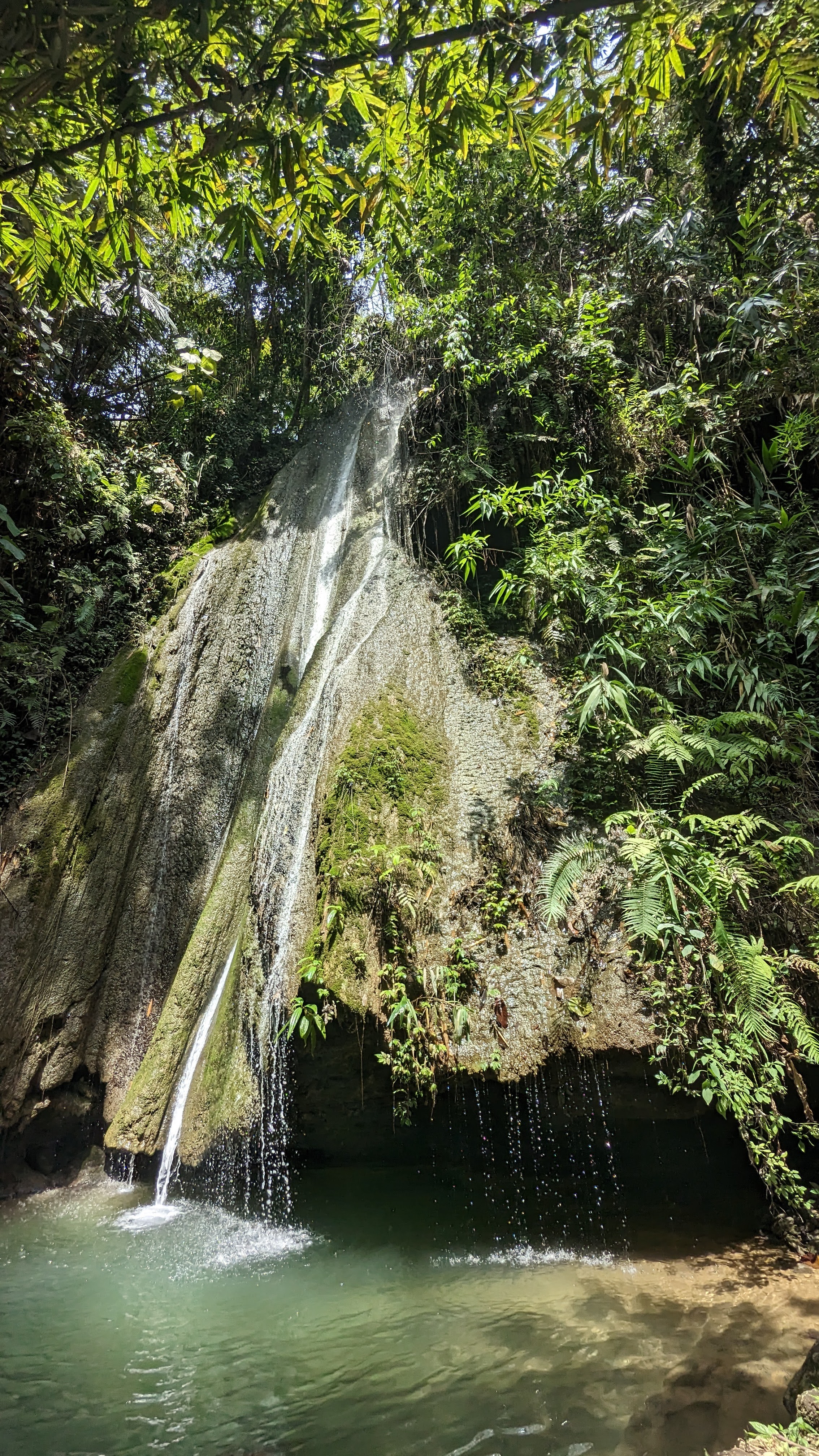 The next day’s trek started with a boat ride departing from the very beach where I had so recently been swimming, in a long narrow boat in which we could barely speak over the sound of the engine. After some time sitting and trying not to rock the boat too much, we pulled up onto a muddy bank and once again began trekking our way through the heat and humidity of the Lao day. Once again the white butterflies sat in large groups upon patches of water and other decay, swarming into beautiful clouds when anyone approached. We had a mostly vertical hike, with a small break to make our way into a cave filled with headless Buddha statues (removed from temples after theft or damage) and then continuing to the summit where we had a beautiful view over the entire surrounding landscape. We then made our way back to the river, enjoying the butterflies and views the whole way down. We then boarded the boat once again, had a delicious lunch of rice noodles, and after our short ride was completed, we started another hike up towards a beautiful waterfall. Of course sweaty, once we arrived, we all eagerly hopped into the pool at the base of the waterfall. After our refreshing swim, we enjoyed the waterfall and the beautiful scenery for a little longer before making our way back to the river for our boat ride back to Nong Kiaw. Practically as soon as we arrived, we had a tuk tuk ready to take us to the south. We would be separating from Kate and James along the journey, but the rest of us were excited to head to the South of Laos, after the long night of bus rides that lay ahead.