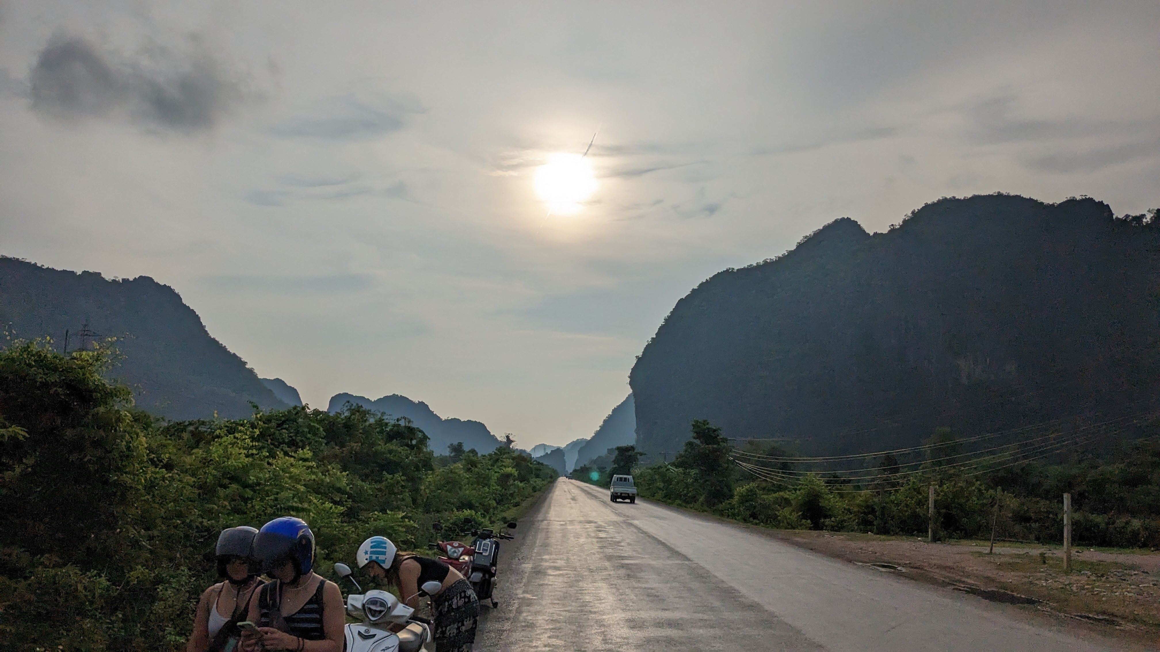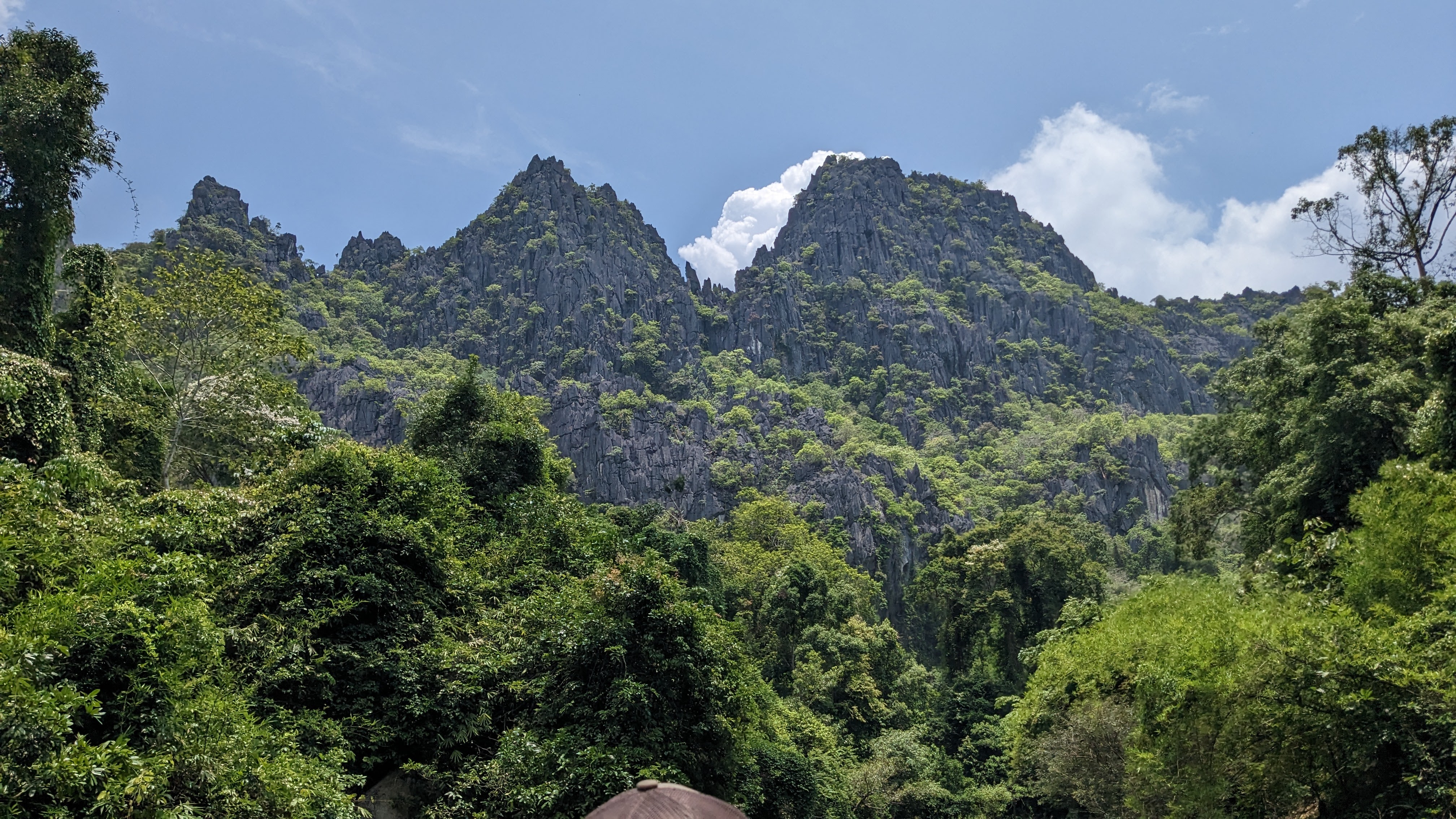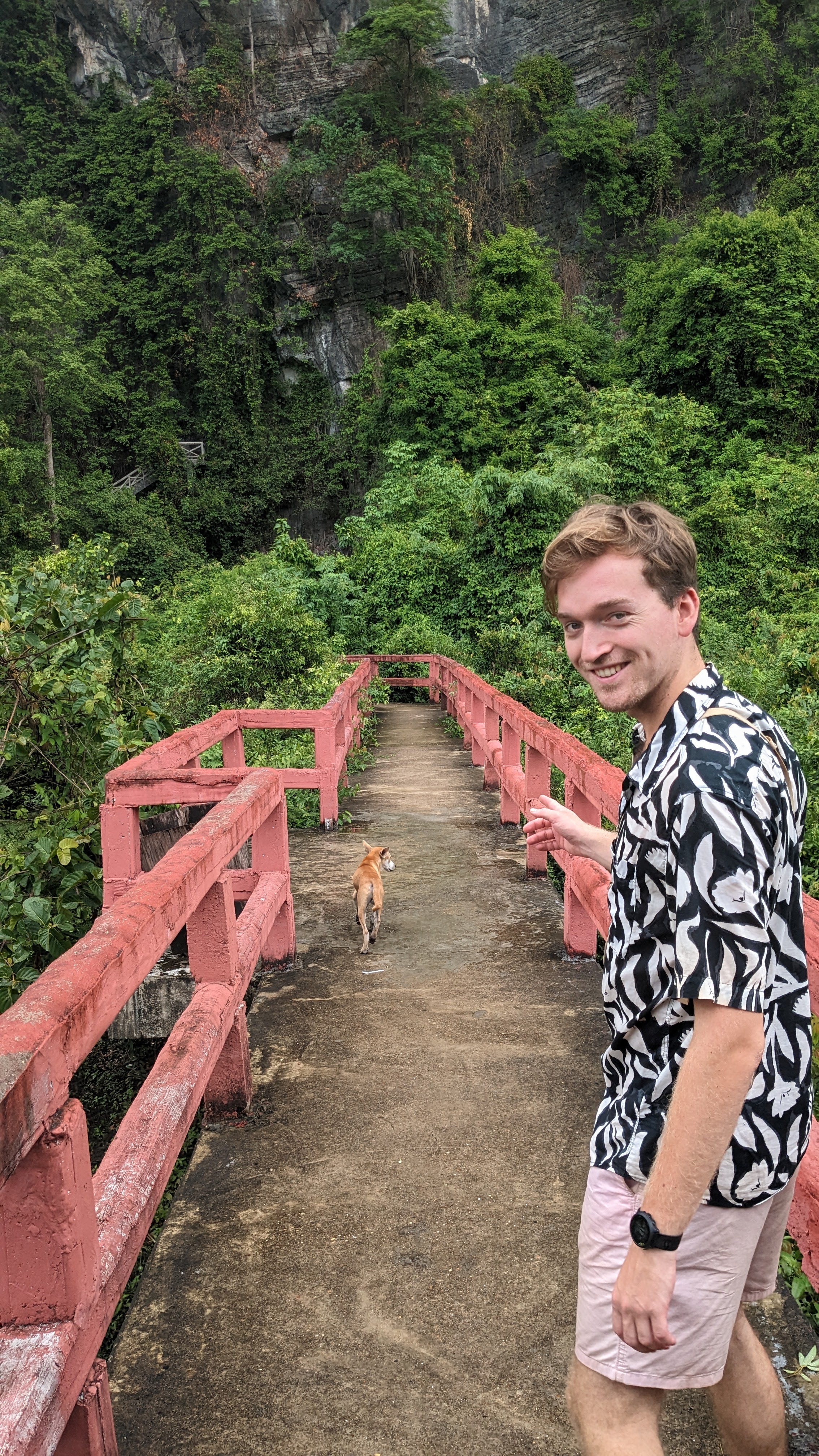 Our evening ride wasn’t the most comfortable, with the first sleeper bus having two people to a small bed. All of us foreigners were put together in beds, so James and I had to share, as did Juriaan and Frank. Needless to say there was nowhere near enough space for all of us to stretch out together, so we ended up crammed together and trying to bend in all sorts of ways where we might actually be able to sleep. After enduring this for a while, with intermittent naps, we were dropped off at a bus station in Vientiane a little after 2 am, with another bus scheduled for 3:30 from another bus station across town. We got a tuk tuk to the other station, dropping James off for a flight the next day near downtown. Our next bus didn’t have beds, but getting a padded seat each improved our chances of getting some rest. By 7 or 8 am, I had woken up, and the bus had started blaring loud Lao music over the interior speakers, keeping my odds of any more rest low. We stopped at a roadside fuel stall where I got a delicious local sausage flavored with ginger and lemongrass, and was given some sticky rice to pair it with by another bus rider. Eventually we arrived in Thakek around 1 pm, not very well rested but thrilled to be off the bus and away from the loud music keeping us all awake. The town is most famous among tourists for a beautiful motorcycle loop passing through the nearby and national park and imposing limestone schist topography. I had mentioned potentially doing the route with the group to Tim (from all the way back in Phuket, Thailand), who it turned out was also heading into town with the same plan just a day before. He had decided to wait for us, so we met up with him at a nice hostel in town, then proceeded to explore the town for the evening. Still unsure if I would join, I discussed the loop with the others, and was happy to find that we would have two very experienced riders in the group (Tim and Juriaan) as well as other relative novices (Frank, a Dutch girl named Sanne that Tim had introduced us to at the hostel, and of course myself). With the assurance that we would take it slow and that none of the terrain would be particularly difficult, I decided to accompany the others on the adventure the next morning. We reserved our bikes that night, had a delicious dinner at the street market, and all got an early night’s sleep to prepare for the big day tomorrow. The next morning, a substantial rainstorm came in just as we planned to leave, so we decided to get breakfast in town and push back the beginning of our ride until the rain had calmed down. Once the clouds began to clear and the rain stopped, around 11 am, we all picked up our bikes, did a small test drive around the block, and set off out of town and onto the famed Thakek loop. Before we had even gotten gas (local rental culture includes bikes that start with the bare minimum of gas, with no expectation of gas when they’re returned), we saw a local rider hit the pavement on a city street. He got up and moved on without apparent injury after we and a couple locals helped his bike up, but this only redoubled my caution and reminded me that even slight carelessness could result in serious problems. Luckily we filled up our gas and then made it out of town with no incidents, and quickly reached our first destination, a pair of caves both found at the end of a dirt road just off of the main circuit. We started with the (a) Buddha cave, a small cave with a tiny entrance halfway up a mountain that opened up onto a space with numerous Buddha statues and a strict no photo policy. The floors were all covered in bamboo mats and there were numerous intricate origami patterns folded out of small local bills. We all enjoyed the space, and took turns ringing a gong there with the permission of the attendant before heading off to find the other cave. This one took a little more searching, but we eventually found it, and the remnants of a now defunct kayak rental program that would take visitors with the time and inclination several kilometers deep into an aquatic cave system. Unfortunately, there were a few dead fish rotting in the standing water, so we didn’t even feel comfortable swimming in the cave, and enjoyed the minimal amount we could access from the rocky entrance. With our time ticking away, especially after our fairly late stop, we headed back to our bikes waiting in the almost abandoned lot. Here we stumbled upon a group of three, also having just started the loop, and got to talking with them. They included a British guy named Roben, as well as two Swiss girls, friends from home named Robyn and Mara. Hitting it off and heading in the same direction, our groups set off together with plans to find lunch as soon as possible. We found a small soup spot on the side of the road not long after, and all sat down to enjoy the only option on the menu (pictured, left to right, me, Tim, Mara, Robyn). After indulging in our delicious and long awaited lunch, we set off to find another nearby cave. This one was far closer to the road and much more explorable, with three different exits (that we found) and dry routes along small beaches and rocks between all of them. After exploring for a little longer than we maybe should have, we noticed the time and rushed to our bikes, hoping to make it to our destination for the evening, Thalang.