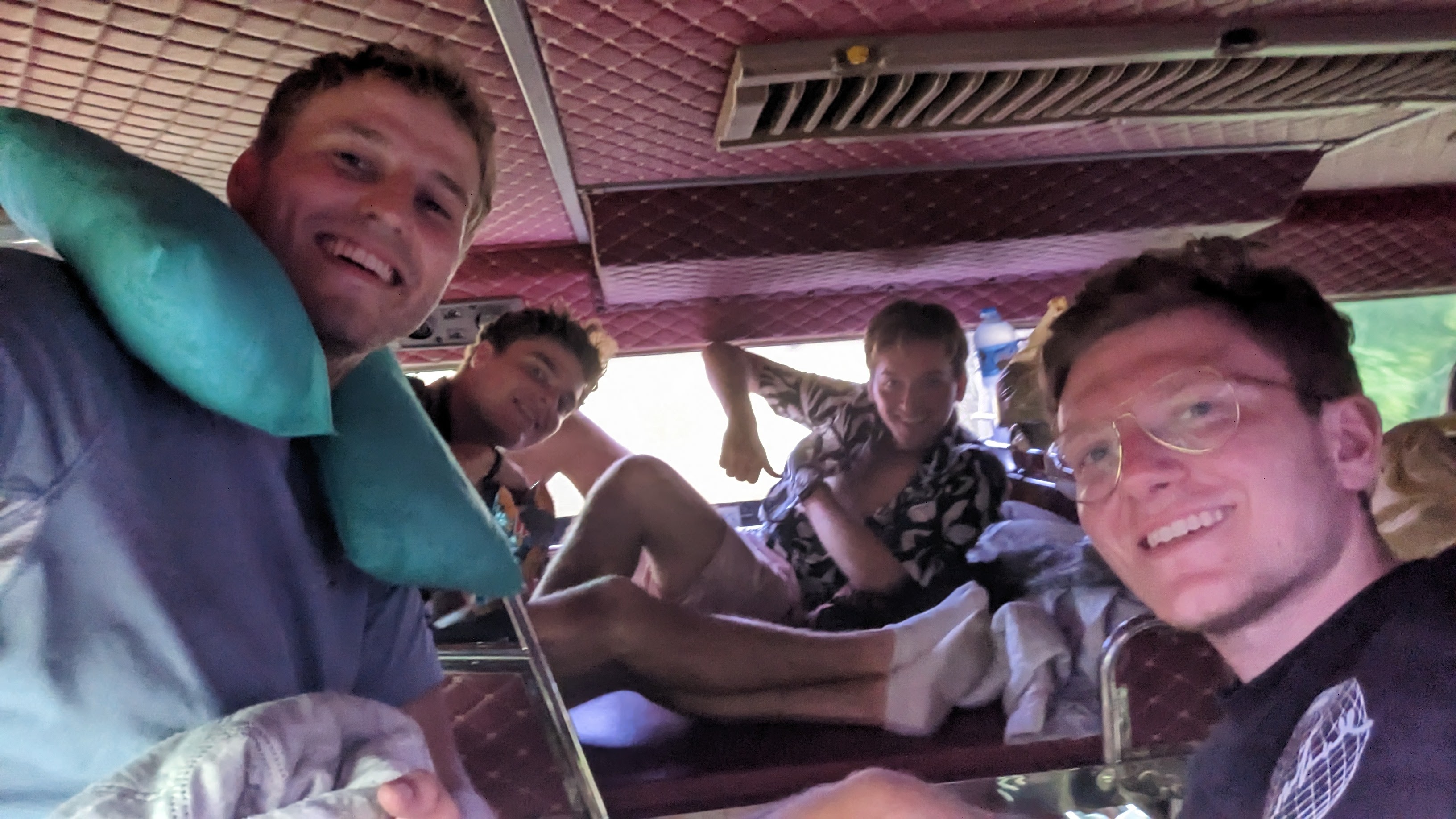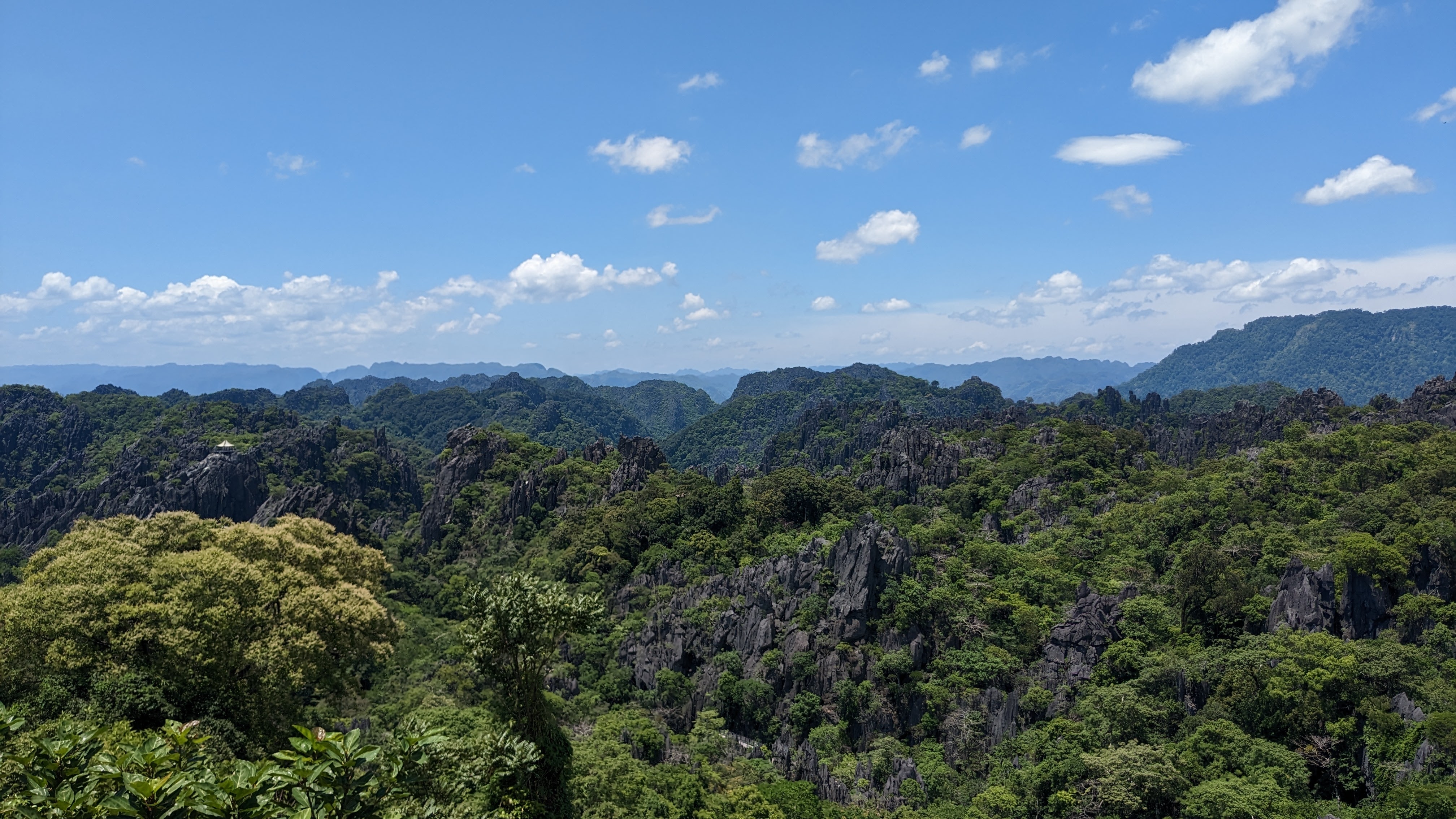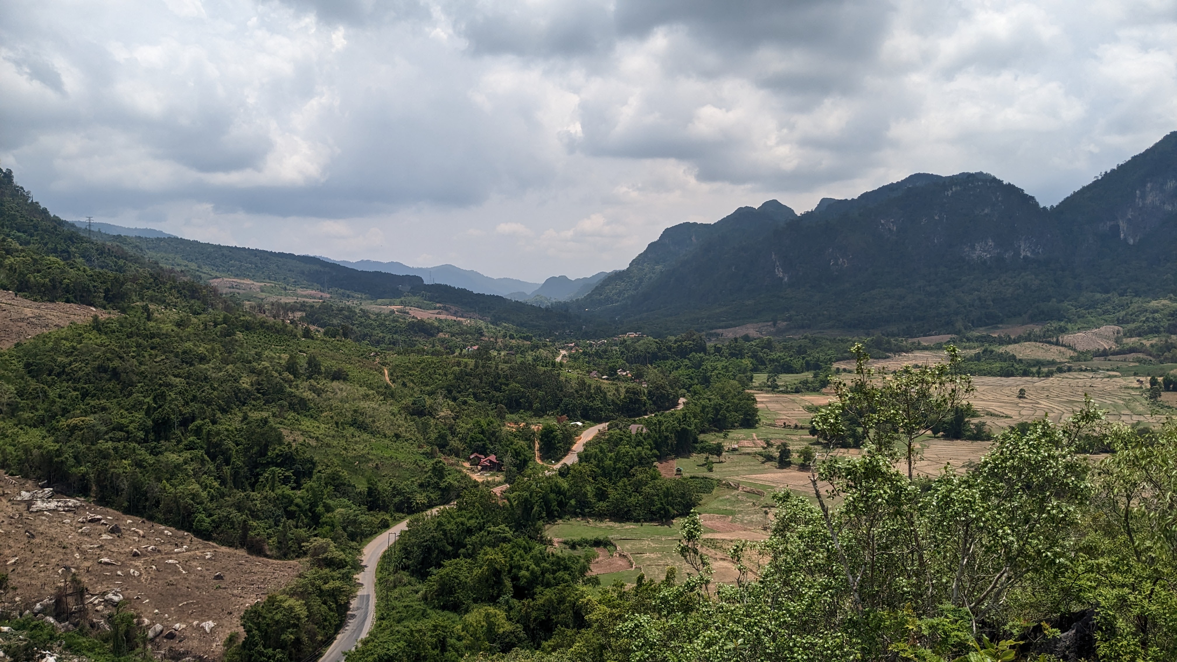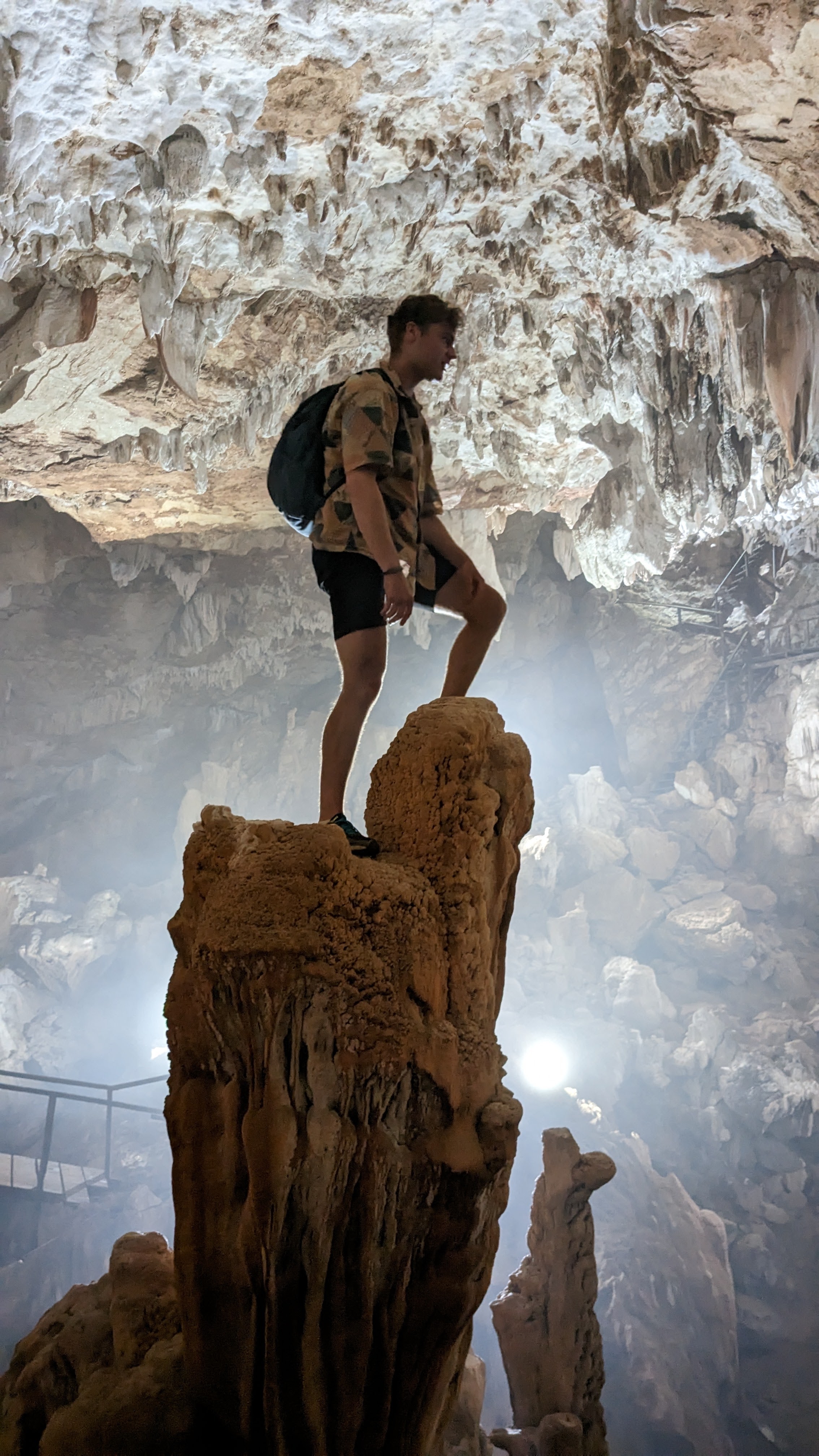Our evening ride wasn’t the most comfortable, with the first sleeper bus having two people to a small bed. All of us foreigners were put together in beds, so James and I had to share, as did Juriaan and Frank. Needless to say there was nowhere near enough space for all of us to stretch out together, so we ended up crammed together and trying to bend in all sorts of ways where we might actually be able to sleep. After enduring this for a while, with intermittent naps, we were dropped off at a bus station in Vientiane a little after 2 am, with another bus scheduled for 3:30 from another bus station across town. We got a tuk tuk to the other station, dropping James off for a flight the next day near downtown. Our next bus didn’t have beds, but getting a padded seat each improved our chances of getting some rest. By 7 or 8 am, I had woken up, and the bus had started blaring loud Lao music over the interior speakers, keeping my odds of any more rest low. We stopped at a roadside fuel stall where I got a delicious local sausage flavored with ginger and lemongrass, and was given some sticky rice to pair it with by another bus rider. Eventually we arrived in Thakek around 1 pm, not very well rested but thrilled to be off the bus and away from the loud music keeping us all awake. The town is most famous among tourists for a beautiful motorcycle loop passing through the nearby and national park and imposing limestone schist topography. I had mentioned potentially doing the route with the group to Tim (from all the way back in Phuket, Thailand), who it turned out was also heading into town with the same plan just a day before. He had decided to wait for us, so we met up with him at a nice hostel in town, then proceeded to explore the town for the evening. Still unsure if I would join, I discussed the loop with the others, and was happy to find that we would have two very experienced riders in the group (Tim and Juriaan) as well as other relative novices (Frank, a Dutch girl named Sanne that Tim had introduced us to at the hostel, and of course myself). With the assurance that we would take it slow and that none of the terrain would be particularly difficult, I decided to accompany the others on the adventure the next morning. We reserved our bikes that night, had a delicious dinner at the street market, and all got an early night’s sleep to prepare for the big day tomorrow. The next morning, a substantial rainstorm came in just as we planned to leave, so we decided to get breakfast in town and push back the beginning of our ride until the rain had calmed down. Once the clouds began to clear and the rain stopped, around 11 am, we all picked up our bikes, did a small test drive around the block, and set off out of town and onto the famed Thakek loop. Before we had even gotten gas (local rental culture includes bikes that start with the bare minimum of gas, with no expectation of gas when they’re returned), we saw a local rider hit the pavement on a city street. He got up and moved on without apparent injury after we and a couple locals helped his bike up, but this only redoubled my caution and reminded me that even slight carelessness could result in serious problems. Luckily we filled up our gas and then made it out of town with no incidents, and quickly reached our first destination, a pair of caves both found at the end of a dirt road just off of the main circuit. We started with the (a) Buddha cave, a small cave with a tiny entrance halfway up a mountain that opened up onto a space with numerous Buddha statues and a strict no photo policy. The floors were all covered in bamboo mats and there were numerous intricate origami patterns folded out of small local bills. We all enjoyed the space, and took turns ringing a gong there with the permission of the attendant before heading off to find the other cave. This one took a little more searching, but we eventually found it, and the remnants of a now defunct kayak rental program that would take visitors with the time and inclination several kilometers deep into an aquatic cave system. Unfortunately, there were a few dead fish rotting in the standing water, so we didn’t even feel comfortable swimming in the cave, and enjoyed the minimal amount we could access from the rocky entrance. With our time ticking away, especially after our fairly late stop, we headed back to our bikes waiting in the almost abandoned lot. Here we stumbled upon a group of three, also having just started the loop, and got to talking with them. They included a British guy named Roben, as well as two Swiss girls, friends from home named Robyn and Mara. Hitting it off and heading in the same direction, our groups set off together with plans to find lunch as soon as possible. We found a small soup spot on the side of the road not long after, and all sat down to enjoy the only option on the menu (pictured, left to right, me, Tim, Mara, Robyn). After indulging in our delicious and long awaited lunch, we set off to find another nearby cave. This one was far closer to the road and much more explorable, with three different exits (that we found) and dry routes along small beaches and rocks between all of them. After exploring for a little longer than we maybe should have, we noticed the time and rushed to our bikes, hoping to make it to our destination for the evening, Thalang.