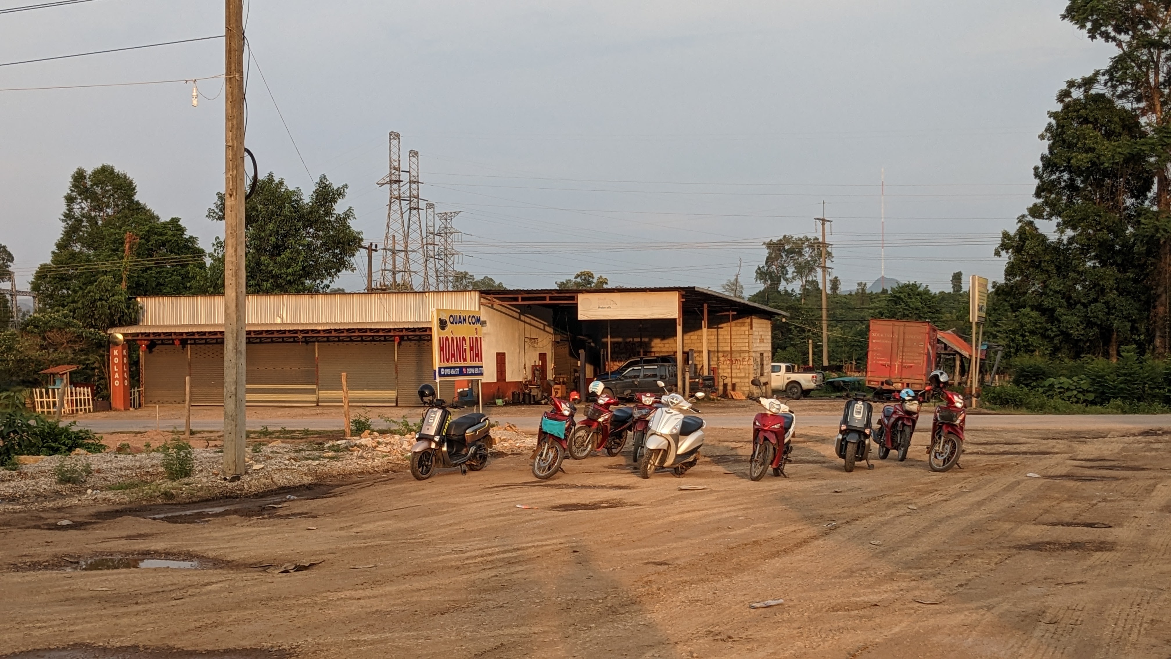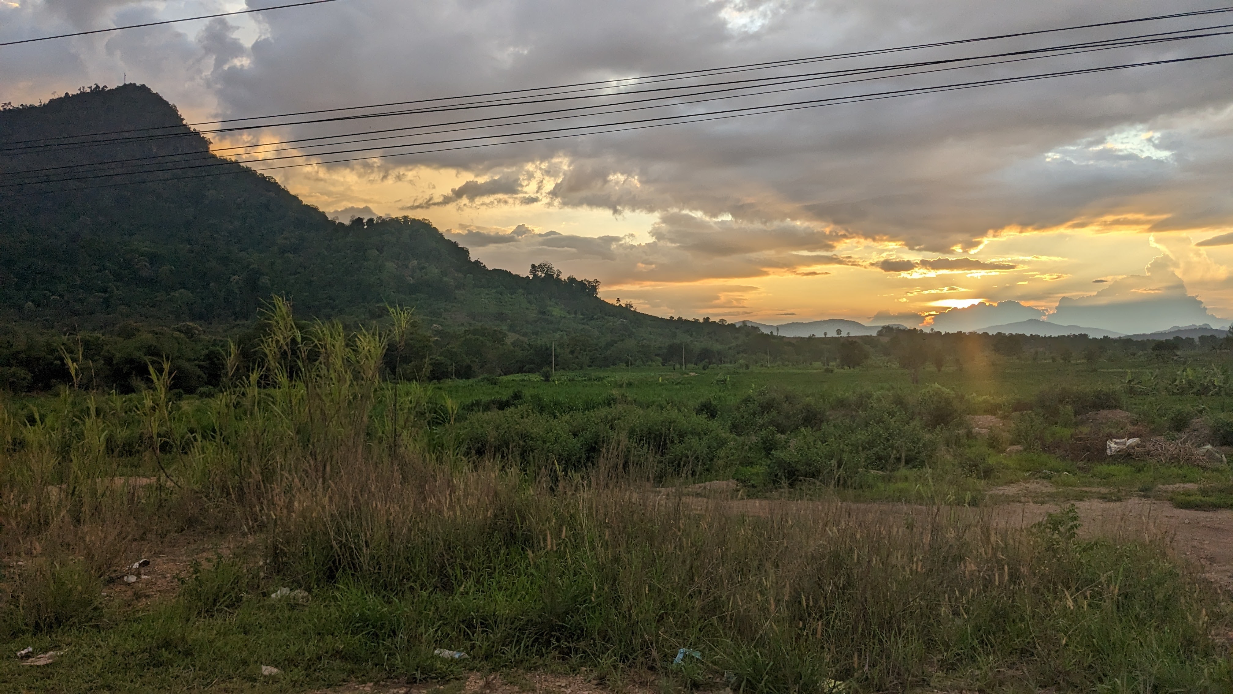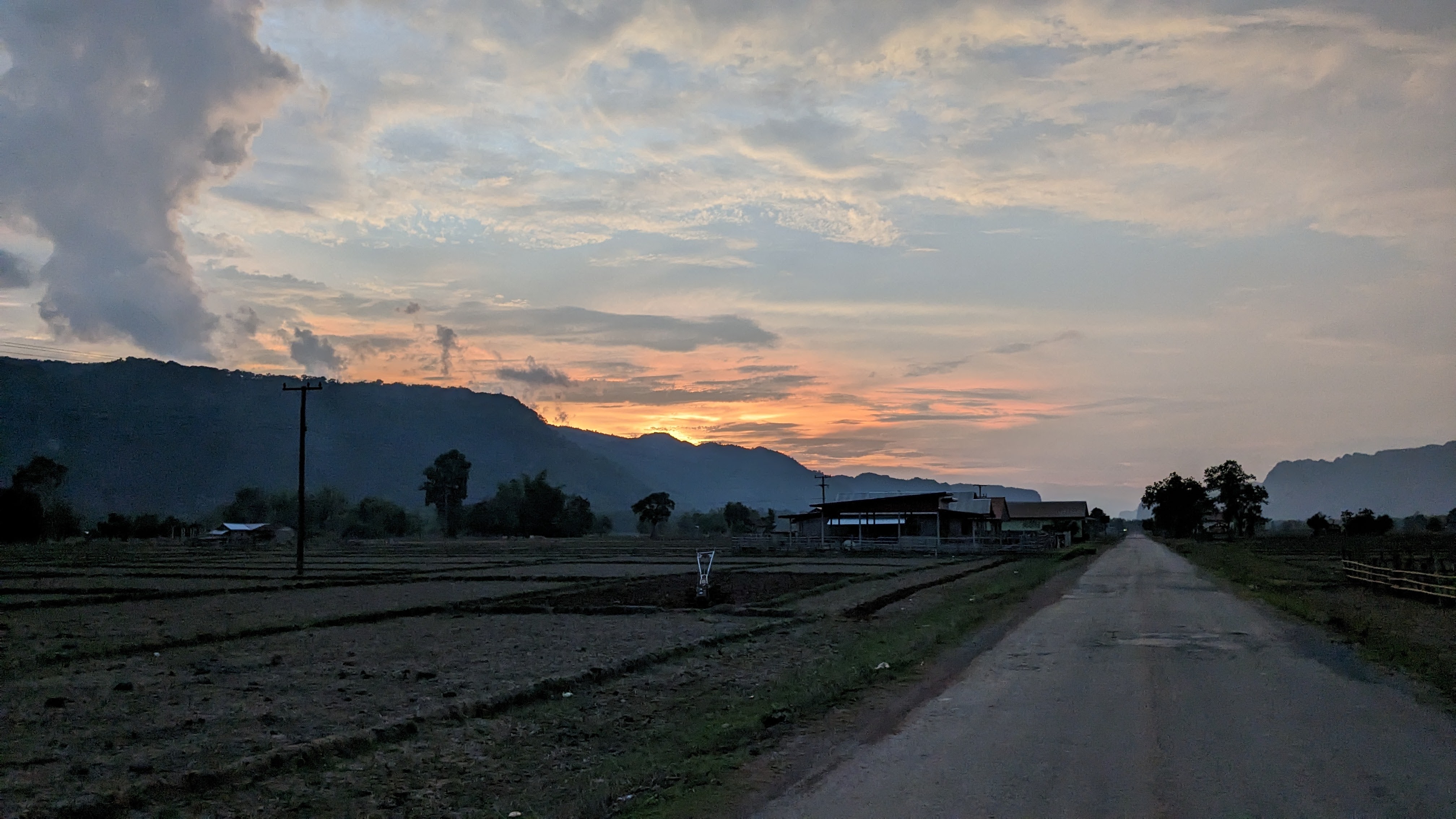 With the sun setting quickly behind the mountains and clouds, we rode for a while with only a brief stop for some sunset views. Luckily the light held for a while and we only had a small bit of riding in the dark, though once I took off my riding sunglasses the bugs and dirt hitting my face posed an interesting new challenge. I also got to develop my skills a little bit by making my way up a hill with switchbacks, managing steering around tight turns as well as downshifting for the power I needed to make it up the hill. The group got a little separated by the very end, as a few of us stopped to put on jackets and others, but not all, circled back to make sure they were okay. By the time we made it to our hostel for the evening it was completely dark, and Juriaan, Sanne, Roben, and I were the only ones in my group. Due to some inaccurate google maps, the others had overshot the turnoff to our place, and we all reunited before we turned down a short dirt road leading into the town of Thalang and towards our hostel. We pulled into a lot filled with bikes and disembarked just in time for a delicious all you can eat evening barbecue with all of the other riders there that evening. I was feeling a little under the weather with plugged sinuses, so after we ate I took an early night in, hoping to feel better and alert the next morning. I could already feel myself getting more confident on the bike, and while proud of my incident free progress, remained extremely wary that a mistake could be quite dangerous, and that I was very much still a novice. In the morning, I woke up quite early and enjoyed the solitude of the hostel as the sun began to rise above the horizon. I took a walk around the small town of Thalang, enjoying the riverside and ingratiating myself with some of the local dogs. After getting a sense of the nearby land and waving hello to some of the locals, I made my way back to the hostel and greeted my companions as they all awoke and started to get ready for the day ahead.