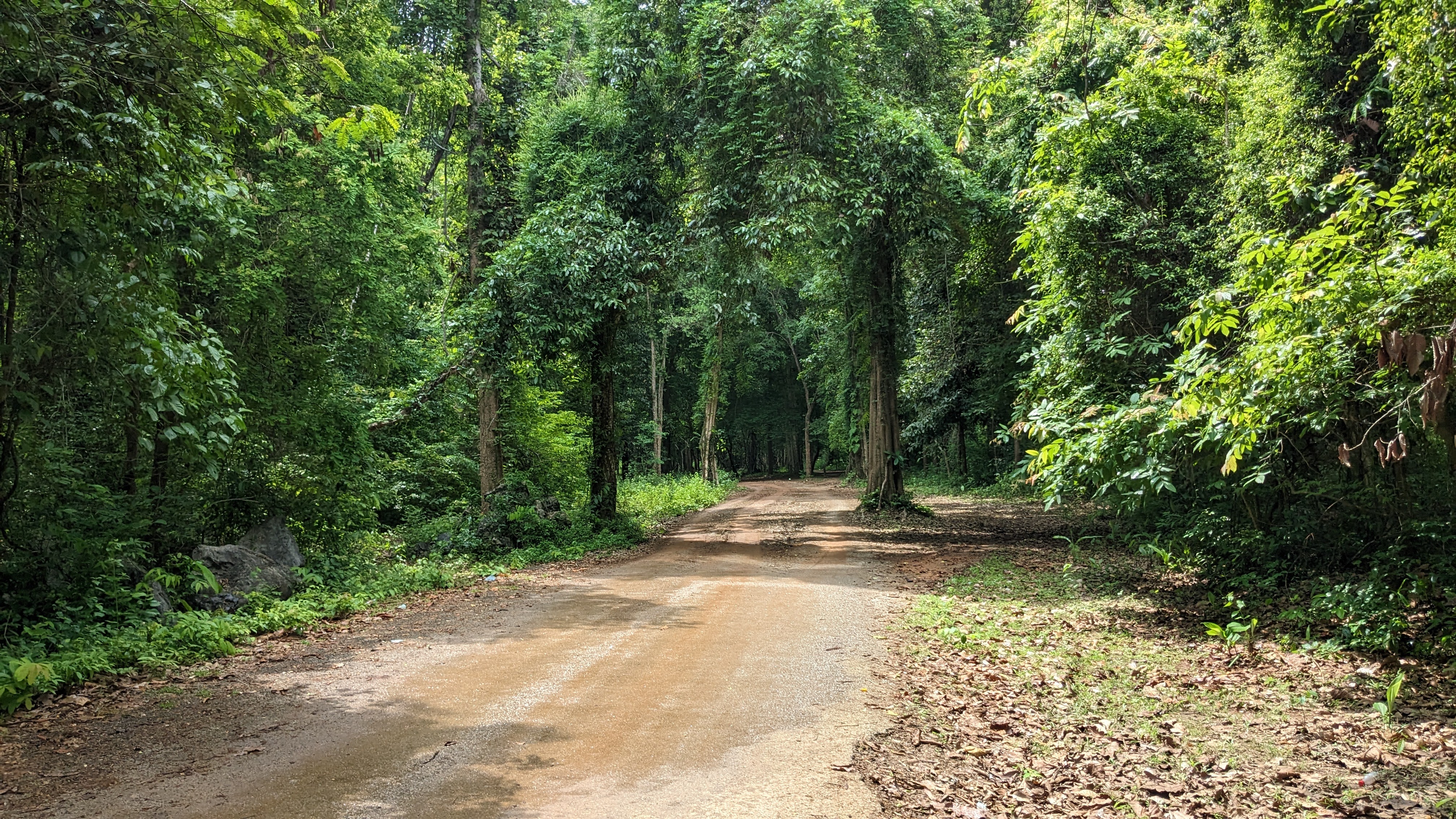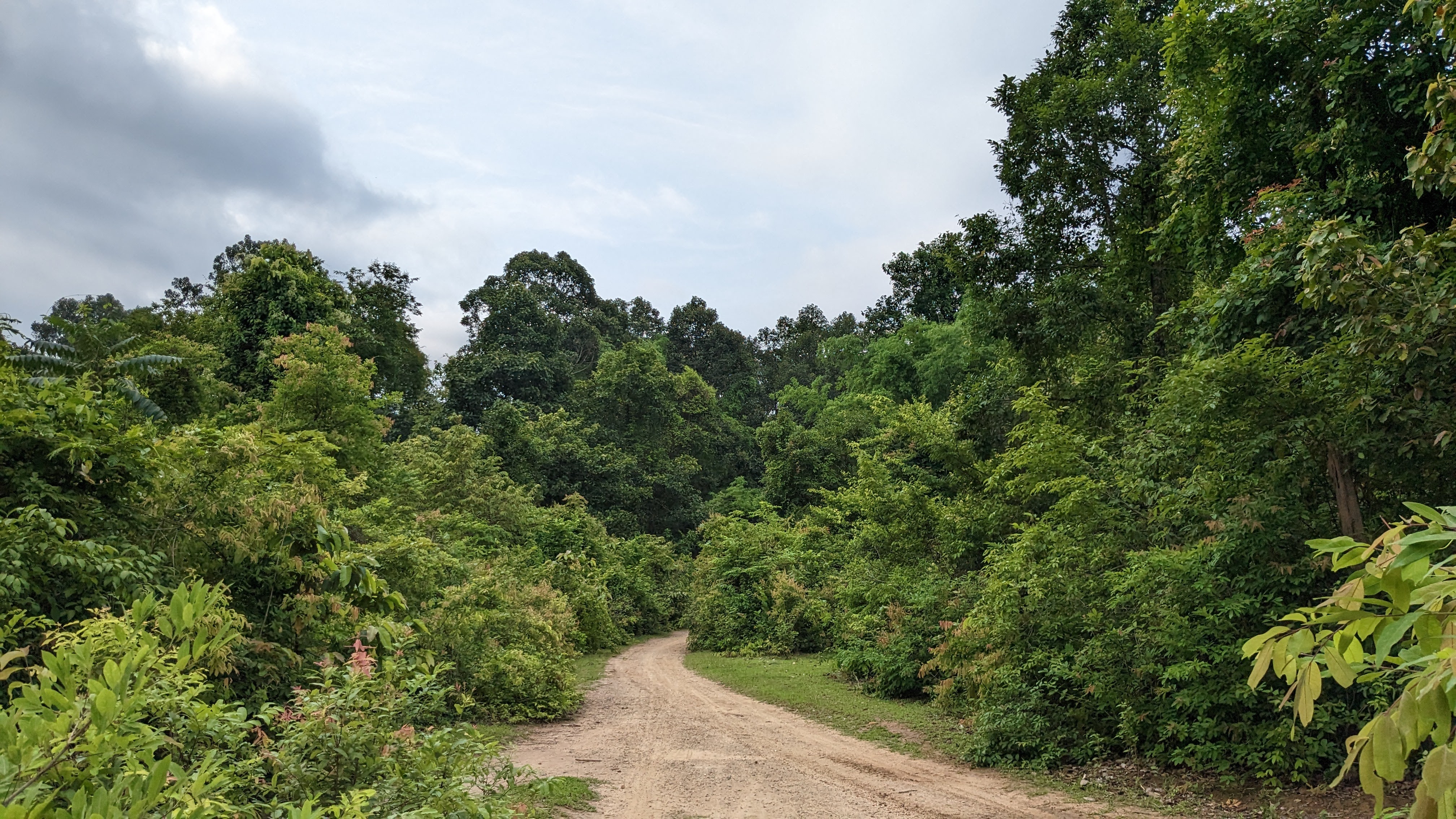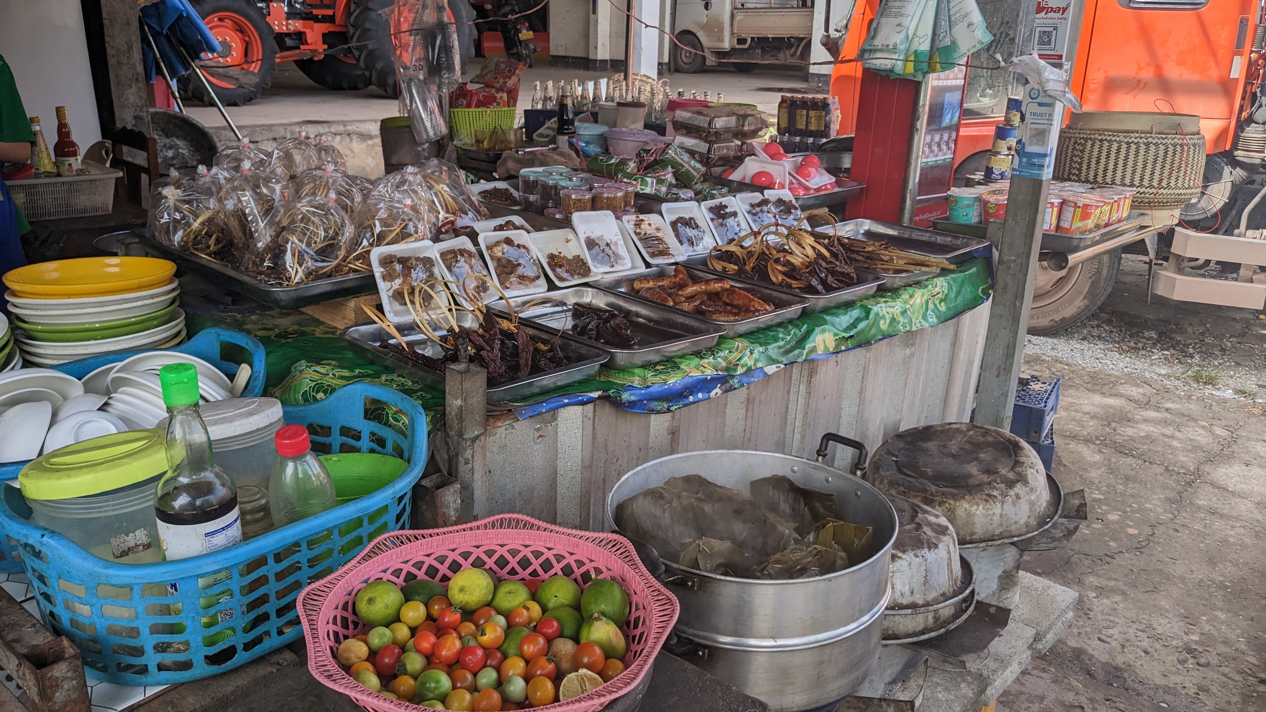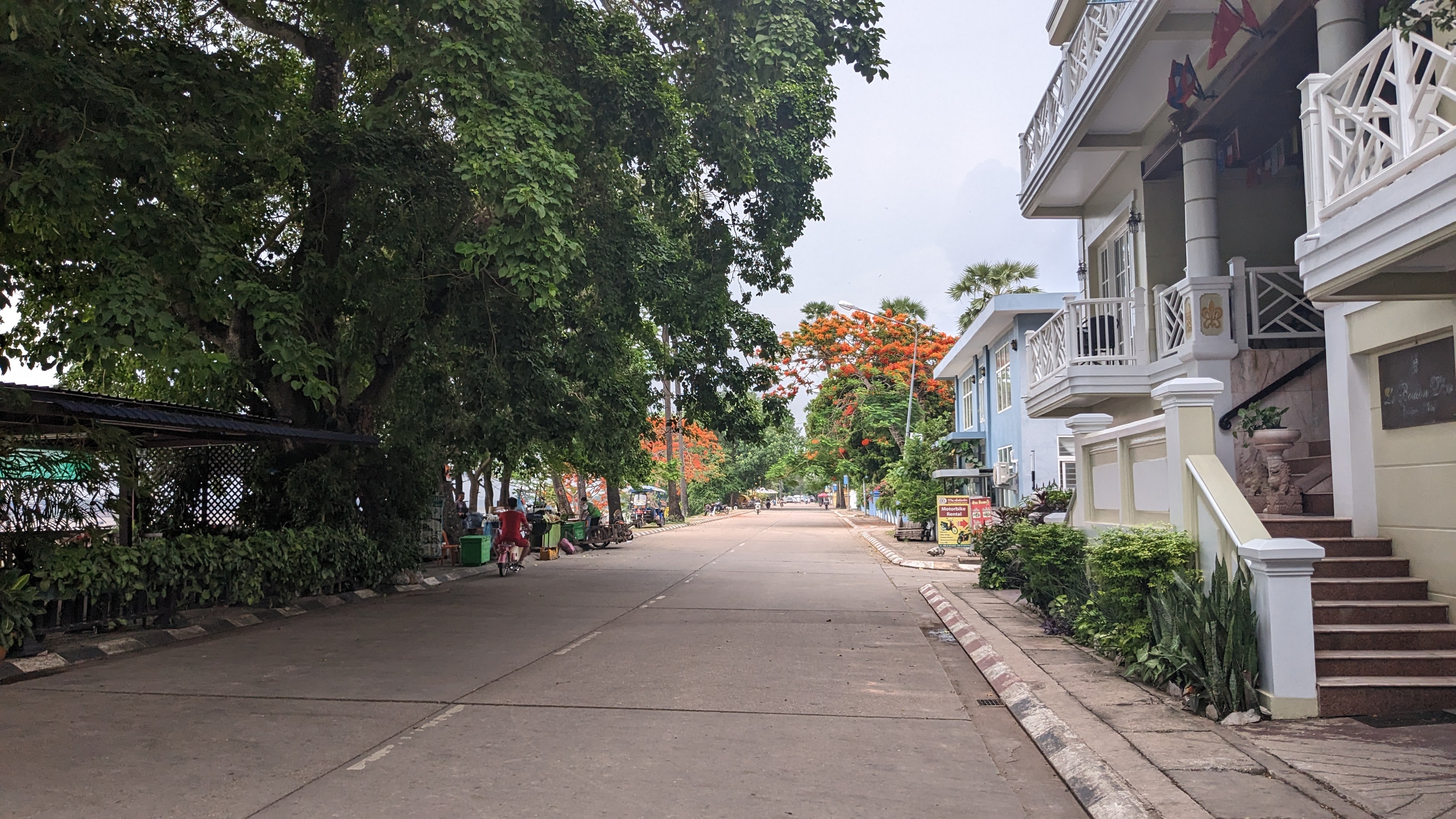 With the sun setting quickly behind the mountains and clouds, we rode for a while with only a brief stop for some sunset views. Luckily the light held for a while and we only had a small bit of riding in the dark, though once I took off my riding sunglasses the bugs and dirt hitting my face posed an interesting new challenge. I also got to develop my skills a little bit by making my way up a hill with switchbacks, managing steering around tight turns as well as downshifting for the power I needed to make it up the hill. The group got a little separated by the very end, as a few of us stopped to put on jackets and others, but not all, circled back to make sure they were okay. By the time we made it to our hostel for the evening it was completely dark, and Juriaan, Sanne, Roben, and I were the only ones in my group. Due to some inaccurate google maps, the others had overshot the turnoff to our place, and we all reunited before we turned down a short dirt road leading into the town of Thalang and towards our hostel. We pulled into a lot filled with bikes and disembarked just in time for a delicious all you can eat evening barbecue with all of the other riders there that evening. I was feeling a little under the weather with plugged sinuses, so after we ate I took an early night in, hoping to feel better and alert the next morning. I could already feel myself getting more confident on the bike, and while proud of my incident free progress, remained extremely wary that a mistake could be quite dangerous, and that I was very much still a novice. In the morning, I woke up quite early and enjoyed the solitude of the hostel as the sun began to rise above the horizon. I took a walk around the small town of Thalang, enjoying the riverside and ingratiating myself with some of the local dogs. After getting a sense of the nearby land and waving hello to some of the locals, I made my way back to the hostel and greeted my companions as they all awoke and started to get ready for the day ahead.