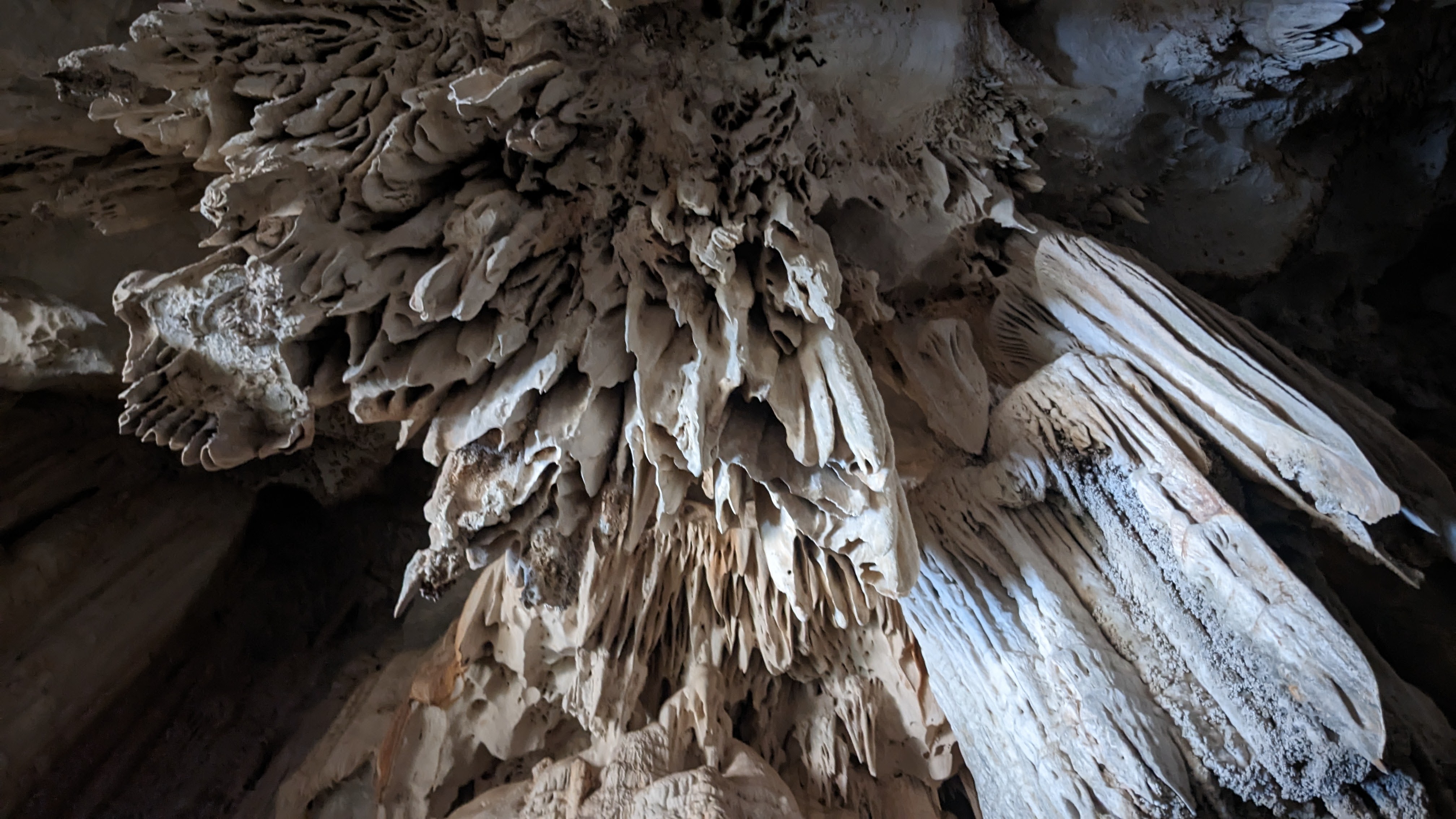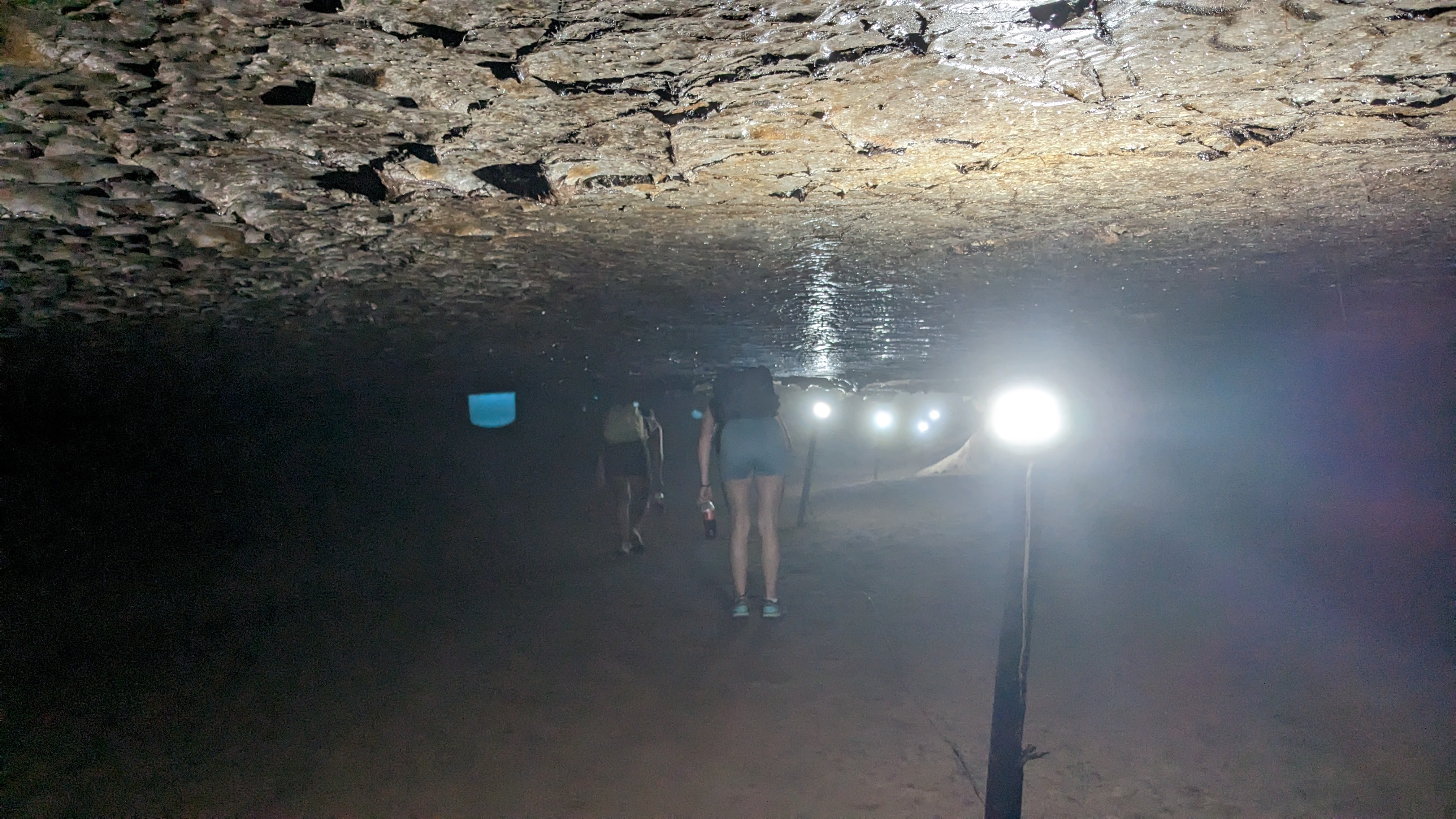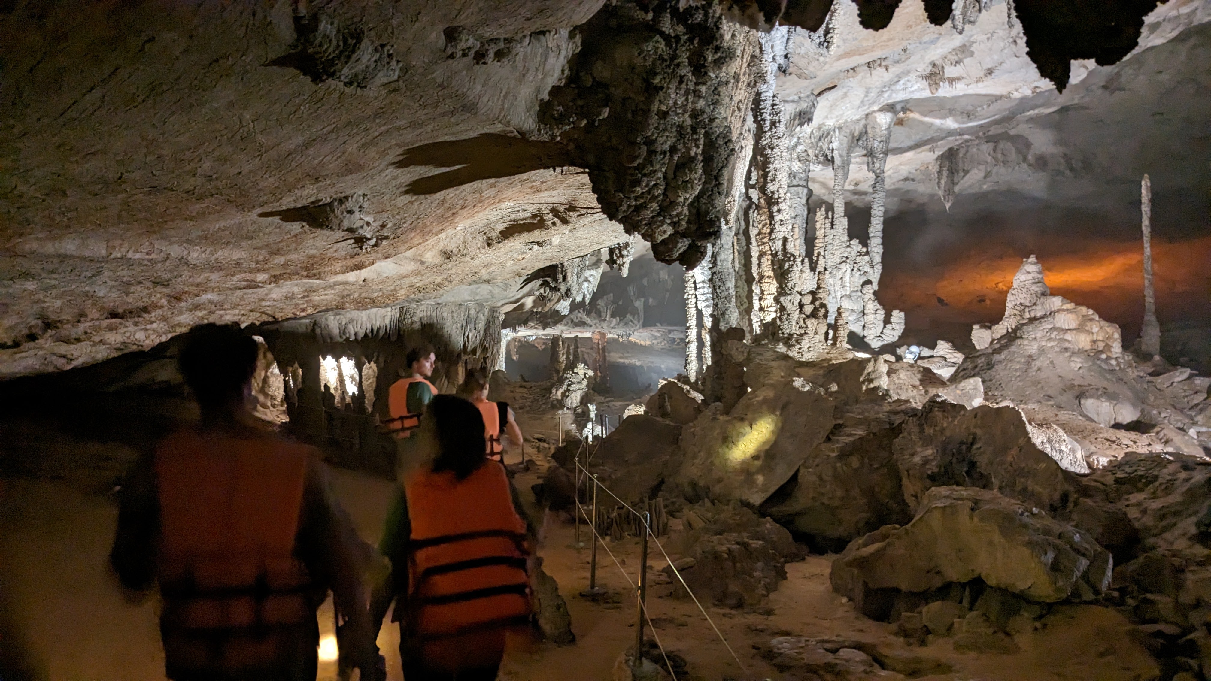 Our next stop was an attraction called the cool pool, with an associated restaurant where we ate lunch. As we ate, the next table was full of several locals drinking beer and singing karaoke. After we finished eating, we joined them for a little bit and sang some karaoke before heading off on our way to the actual pool. As we left, they repeatedly tried to insist on giving us some beers, and eventually even money. We ended up taking a couple of closed beers for the road, and made it out without taking any of their money, though they did manage to add one of the girls on facebook. The pool itself was aptly named, situated above a cold spring with beautiful clear water. We hopped in and appreciated the refreshing water, and though I couldn’t get under the water with my sinuses still feeling a little plugged up, I enjoyed just swimming around and watching the others jump off of the rocks with all sorts of flips and dives. Eventually we headed off, back onto the road, hoping to make it to Konglor that evening. We had a long afternoon of riding, over quite a few wooden bridges and through several small towns, evading herds of cows making their way across the road. Eventually we made it to our accommodations just as the sun set completely, avoiding any riding in the dark. We had a nice evening with dinner at a nearby restaurant, then we all went to bed, excited to explore the nearby caves the next day. I once again woke up before most of the others, and set off for a little walk into the nearby forest. Following little roads and trails back into the forest, presumably leading to other houses farms and pastures, I saw quite a bit of interesting nature (tons of ants!) and lots of locals starting out their day. I returned to join the others for breakfast and then we set off towards the nearby Konglor Cave. This was a highly recommended cave, featuring a massive river stretching more than 7km through a mountain, and emerging near a small village on the other side. We boarded small boats, three of us in each alongside one driver. As we motored our way into the cave, the natural light disappeared and was replaced by the dim glow of our headlights, barely able to reach the distant sides and ceiling of the cave. On a few instances, they dropped us off to walk through lit up sections of the cave, filled with incredible formations.