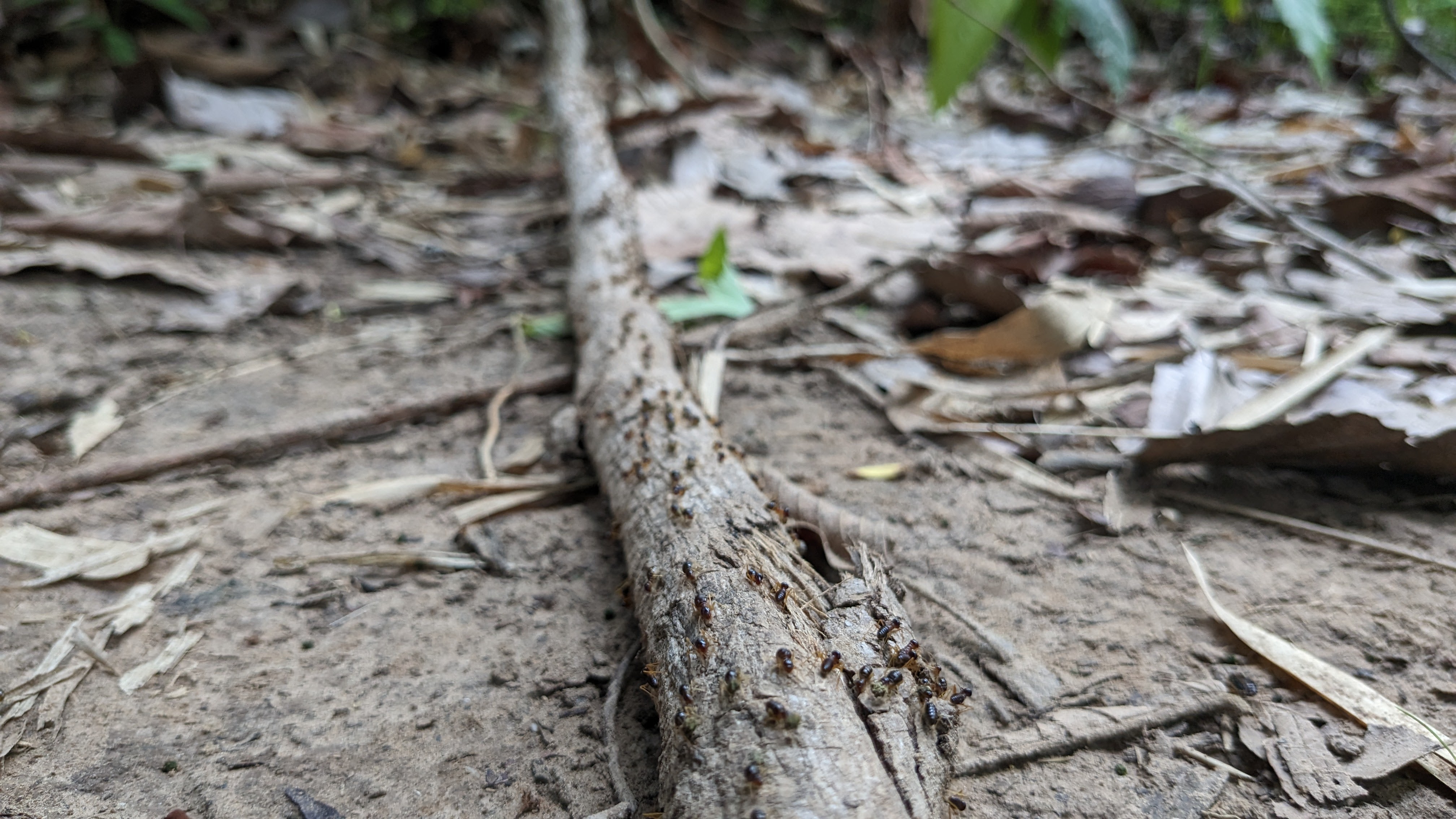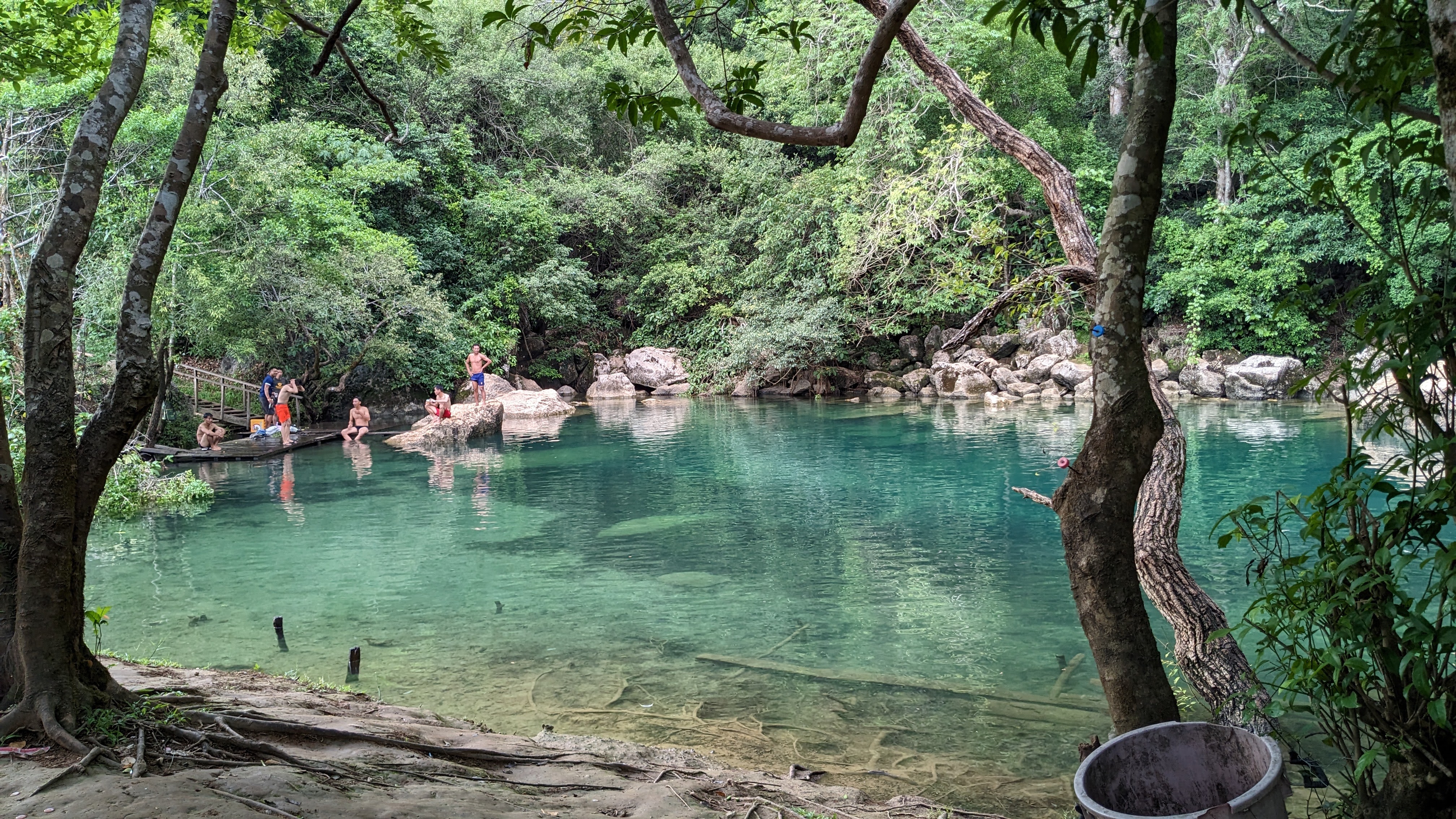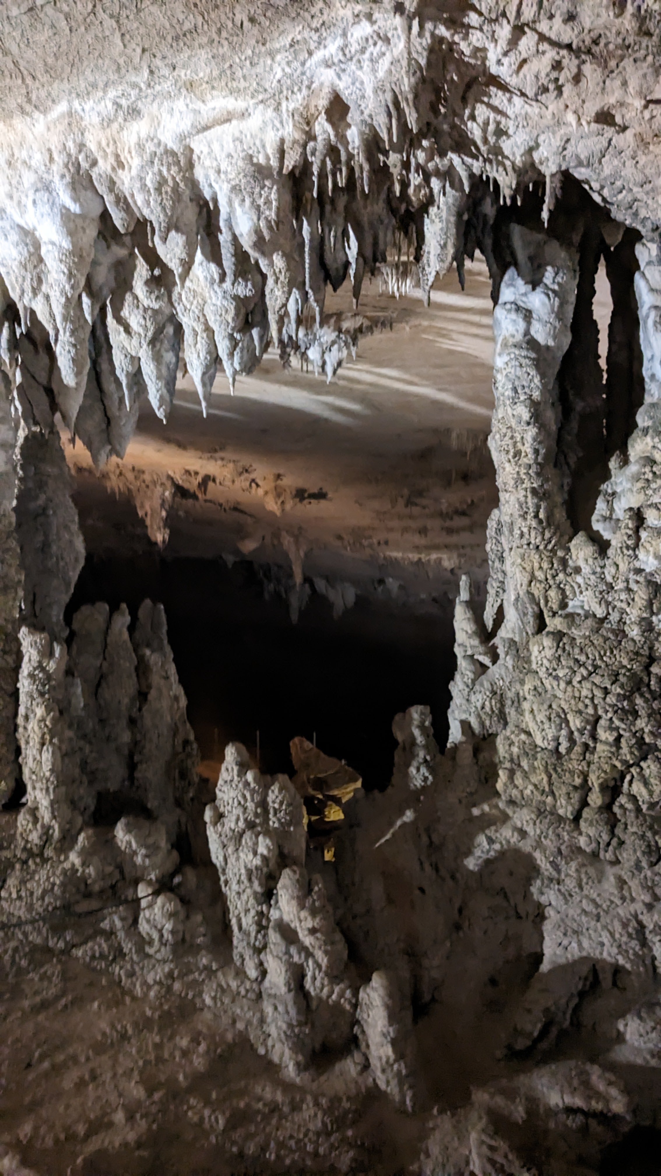 Our next stop was an attraction called the cool pool, with an associated restaurant where we ate lunch. As we ate, the next table was full of several locals drinking beer and singing karaoke. After we finished eating, we joined them for a little bit and sang some karaoke before heading off on our way to the actual pool. As we left, they repeatedly tried to insist on giving us some beers, and eventually even money. We ended up taking a couple of closed beers for the road, and made it out without taking any of their money, though they did manage to add one of the girls on facebook. The pool itself was aptly named, situated above a cold spring with beautiful clear water. We hopped in and appreciated the refreshing water, and though I couldn’t get under the water with my sinuses still feeling a little plugged up, I enjoyed just swimming around and watching the others jump off of the rocks with all sorts of flips and dives. Eventually we headed off, back onto the road, hoping to make it to Konglor that evening. We had a long afternoon of riding, over quite a few wooden bridges and through several small towns, evading herds of cows making their way across the road. Eventually we made it to our accommodations just as the sun set completely, avoiding any riding in the dark. We had a nice evening with dinner at a nearby restaurant, then we all went to bed, excited to explore the nearby caves the next day. I once again woke up before most of the others, and set off for a little walk into the nearby forest. Following little roads and trails back into the forest, presumably leading to other houses farms and pastures, I saw quite a bit of interesting nature (tons of ants!) and lots of locals starting out their day. I returned to join the others for breakfast and then we set off towards the nearby Konglor Cave. This was a highly recommended cave, featuring a massive river stretching more than 7km through a mountain, and emerging near a small village on the other side. We boarded small boats, three of us in each alongside one driver. As we motored our way into the cave, the natural light disappeared and was replaced by the dim glow of our headlights, barely able to reach the distant sides and ceiling of the cave. On a few instances, they dropped us off to walk through lit up sections of the cave, filled with incredible formations.