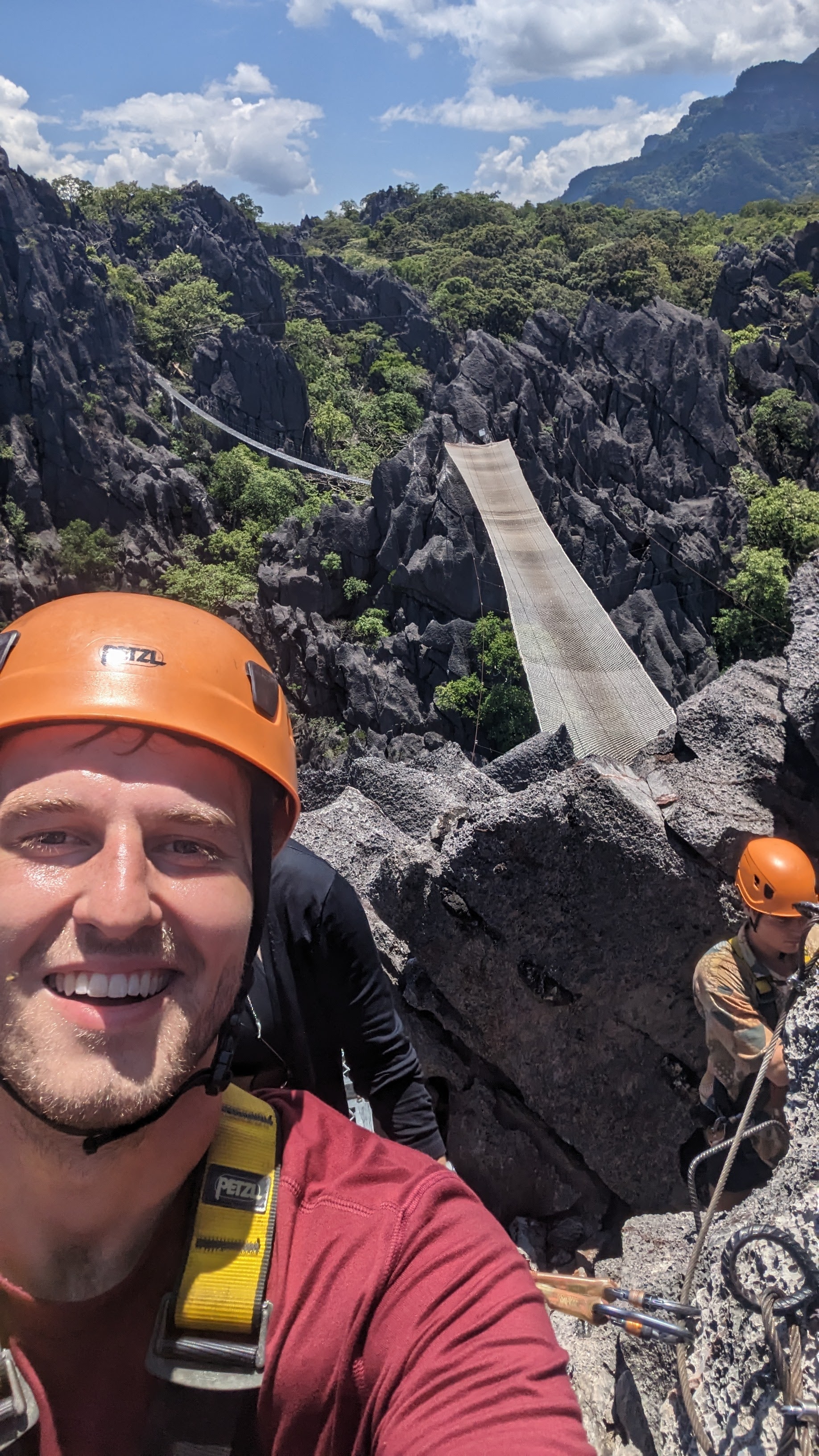 The next morning we rode together for a little while to a nearby ropes course and viewpoint before Tim set off on his own, planning to complete the loop that day. The others, including me, had decided to double back, as the last leg of the loop was a fairly busy highway, and currently under construction, leading to lots of traffic and not so much natural beauty. Relishing having a little extra time, the rest of us decided to splurge on the ropes course and see the wonderful views of the surrounding mountains ($30!). Complete with a harness and helmet, staying clipped into wires the whole time, we climbed over the jagged rocks, zip-lined, and walked over rope netting, all while taking in the scenic views surrounding us. After we completed the course, we took our time to enjoy lunch with a view of the rocks, then set off riding once again, hoping to make it back to Tha Lang by dark. We had another quick stop at the cool pool to refresh ourselves, and another quick hiatus on the side of the road to admire a beautiful rainbow just as the sun was setting. Eventually we made it back to our previous hostel in Tha Lang, just in time for the evening barbecue, and with only about half an hour of riding with our lights on. Once again tired after so many busy days, we enjoyed the barbecue and some new company before we all crashed into bed. The next day I woke up, had a delicious rice soup, and we all departed early. We were intent on making it back quickly in order to catch a bus to Pakse, a town further south with another motorcycle loop known for its beauty. We made it back into Thakek in good time and without any incident, completing our loop with a just about perfect record. Feeling a little emboldened (but of course still cautious) and excited to continue developing my skills with the group, I joined them on a late night bus to the south, excited to see more of such a beautiful country in such a fun way.