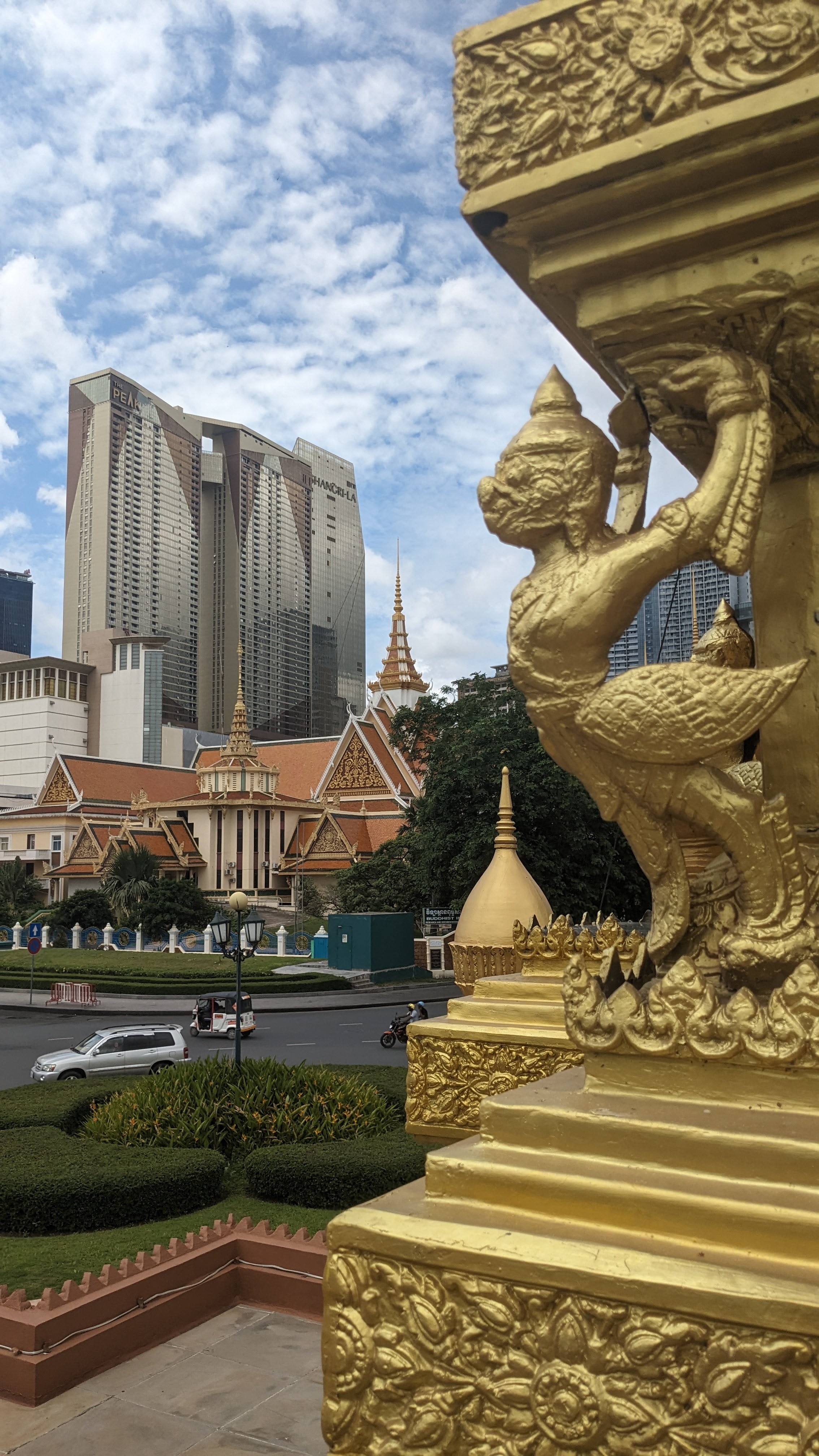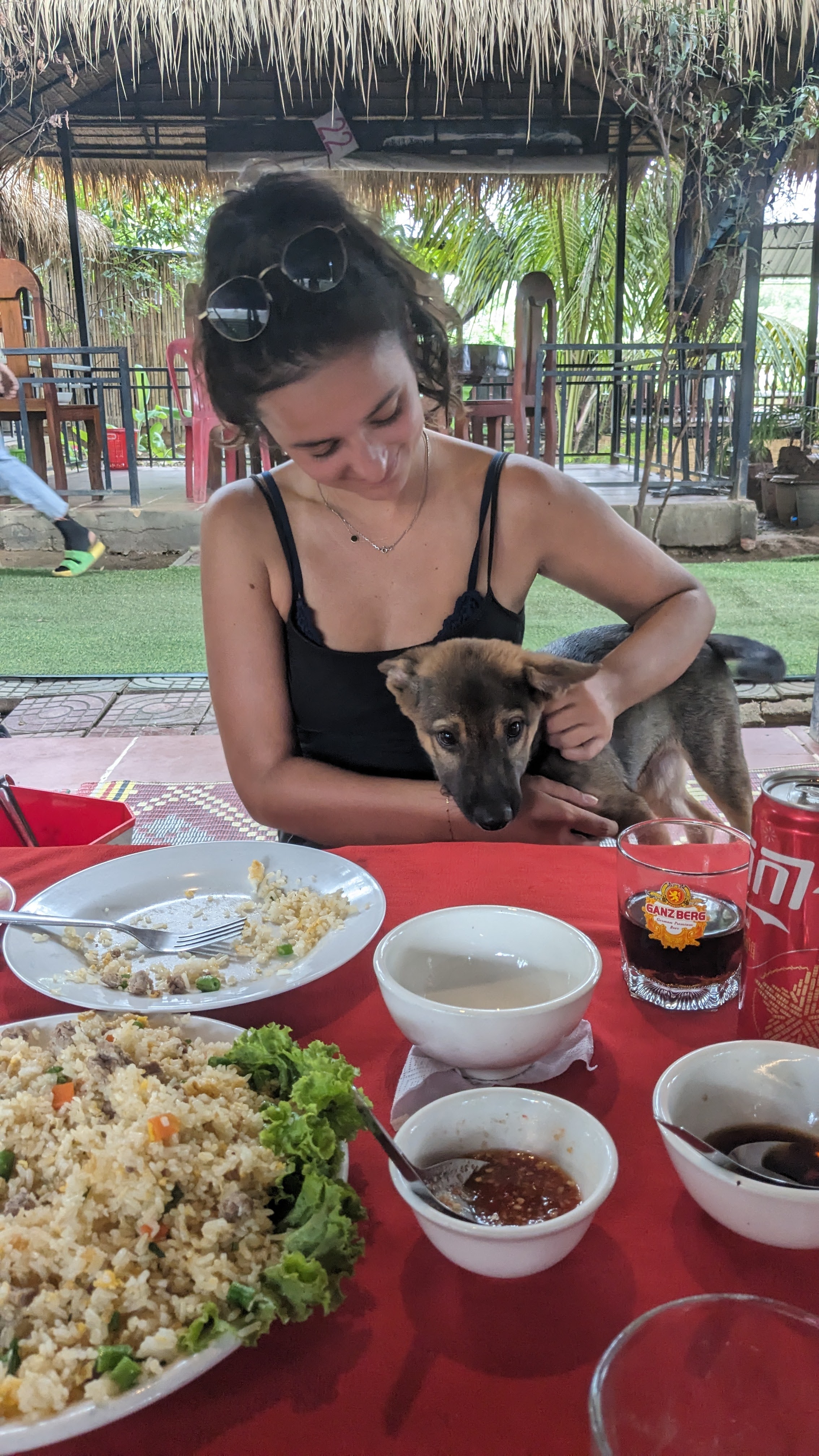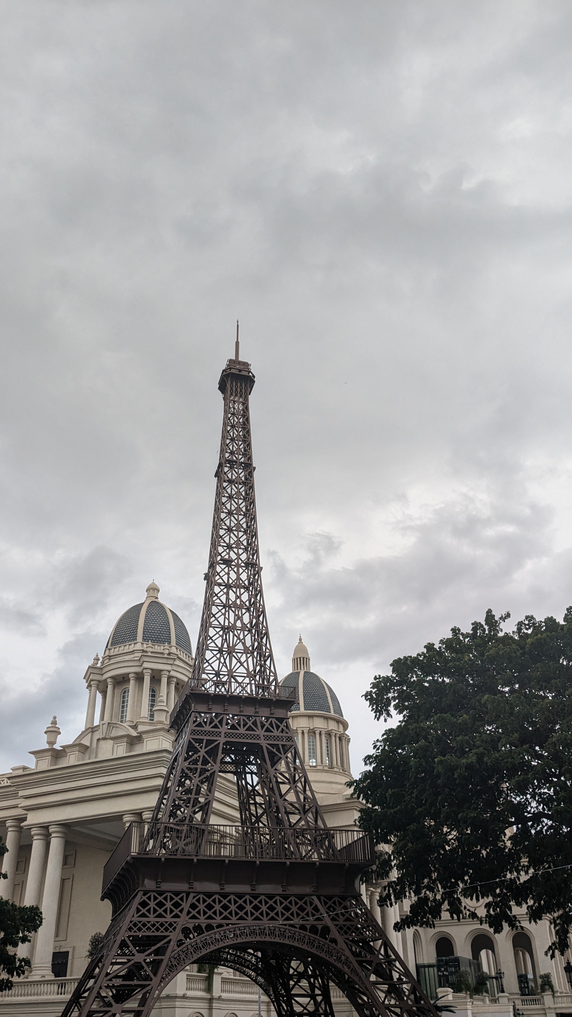 I took the first few days in Phnom Penh to relax and work on writing, enjoying the beauty and convenience of the big city. I met with some friends from Koh Rong, as well as some of the hostel workers that I remembered from my last time there. After Aude had seen the famous sites from the Khmer Rouge, which I had seen on my last time in the city, we took a day to explore some less well known parts of the city. We started off by walking to Koh Pich, an urban island filled with development, but very few people. There were several beautiful buildings, some seemingly abandoned, and we got the opportunity to look around lots of interesting places. Eventually we decided to take a commuter ferry to Koh Norea, a much bigger island just down the river. The ferry itself was an interesting experience, as we were the only two people boarding on foot. The ferry staff was nice enough to allow us to climb up through the ship and enjoy the short ride up on the bridge with the captain. We enjoyed the views of the river and a nearby bridge under construction, but before we knew it the ride was over and we found ourselves on land once again, dodging motorcycles and cars as we left the small ferry port. Koh Norea was at once obviously much poorer and older, filled with small dusty streets and winding alleys. It was a little late for lunch when we realized we were both quite hungry and sought out a restaurant that was still open- most had already closed until dinnertime. Eventually we discovered a fancy local restaurant, complete with hammocks and running water with fish swimming around surrounding all of the tables. It was a little expensive, but the portions were absolutely massive, and there was an adorable puppy that came and played with us for a while while we relaxed and ate. Eventually we continued walking, and after a while arrived in a much richer neighborhood. This area was filled with large community developments protected by gates and guards, fancy gyms and community parks. The centerpiece was a “Europark” complete with miniature replicas of the Eiffel Tower, Big Ben, The Sydney Opera House. There was a miniature canal with gondoliers ferrying customers up and down, as well as a replica Dutch windmill. It seemed like it was mostly an attraction for wealthy local couples and families, complete with many photo opportunities and expensive restaurants lining the park. It was a cool experience, and after relaxing there for a little bit and watching the people enjoy themselves, we were more than ready to head back to the hostel where we were staying. We did a little more exploring around the city, but before too long, both of our visas were about to expire, and we both had the necessary visa to proceed into Vietnam, so we booked a bus that would take us all the way to Ho Chi Minh city. Excited to explore a new country and to have a traveling companion for the moment, I was very happy when the next step of my journey began.